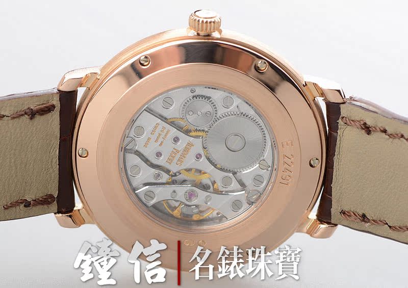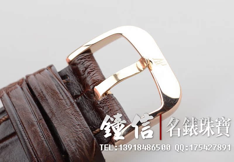 玫瑰金表壳及表扣,圣伯纳狗头印记。后配全新鳄鱼皮表带。口径