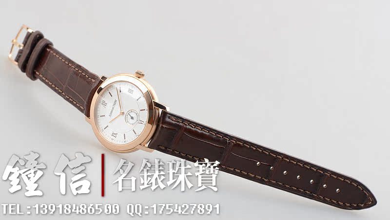 36MM*7MM。立体银白色表盘。蓝宝石水晶镜面及底盖,罗马字及条订刻度,玫瑰金时分针。短秒镀铑,小三针设计。防水20M。