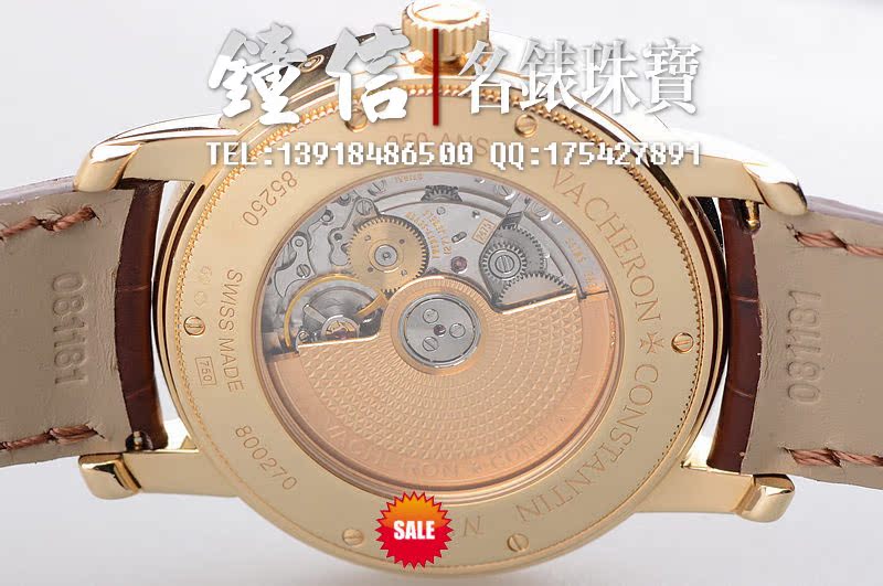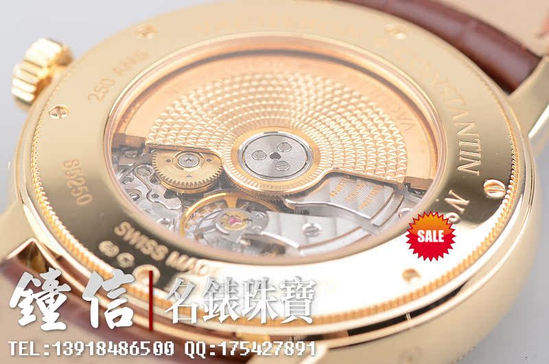 18K黄金表壳及表扣,圣伯纳狗头印记。蓝宝石水晶镜面及底盖。原装全新密西西比棕色鳄鱼皮表带。古典优雅的钱币纹式样表壳,银白色立体雕纹表盘,VC唯一款日内瓦印记置于表盘正面的腕表。金质刻度及指针,烧蓝钢月份,日历,及动显指针,法文月份盘显示。十字勋章表把。底盖有250周年纪念款字样。