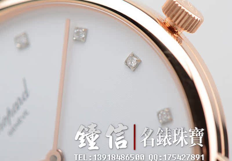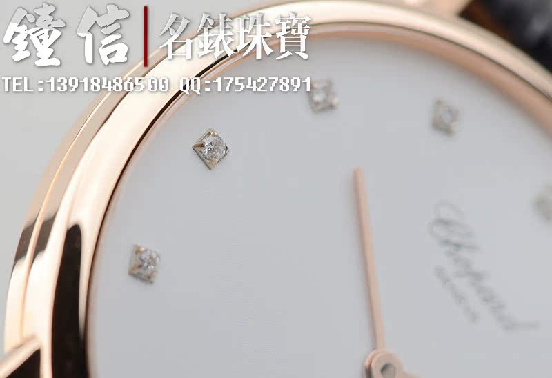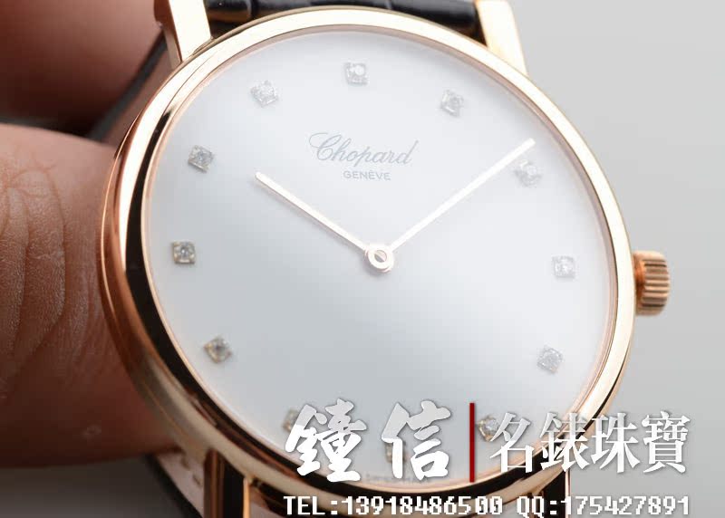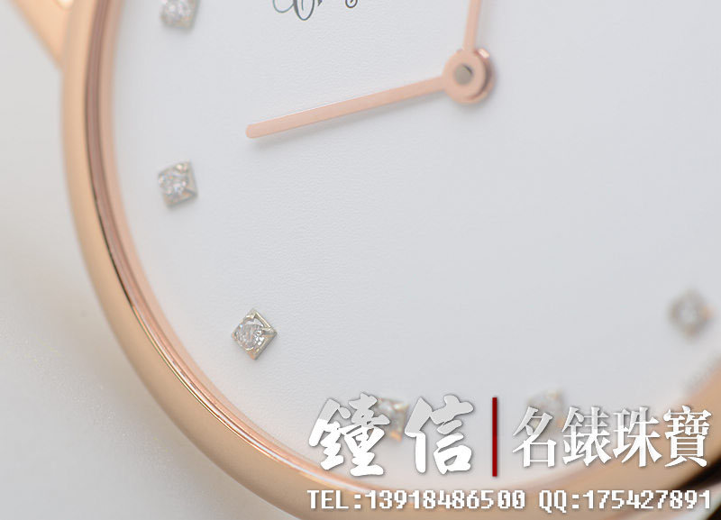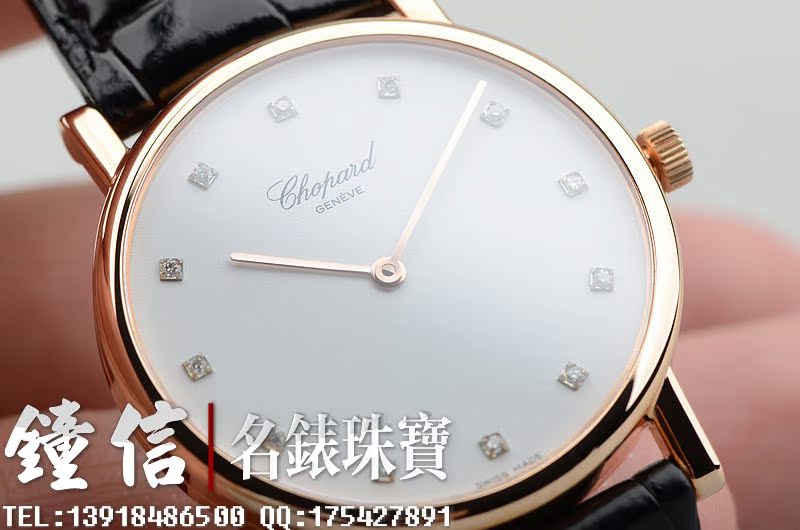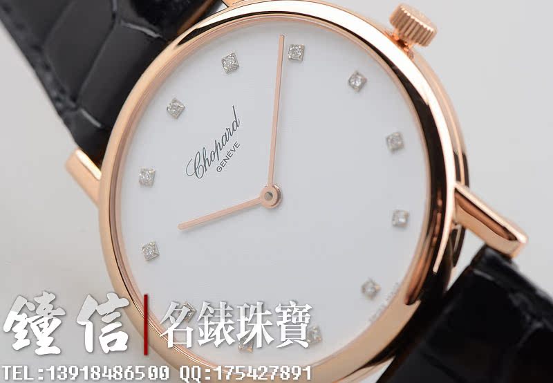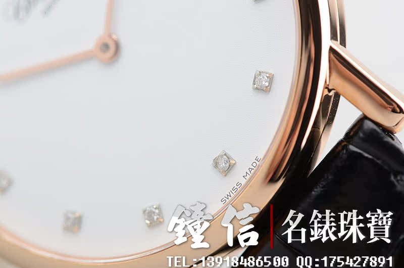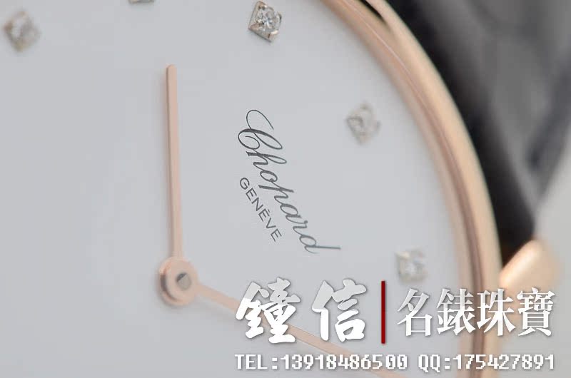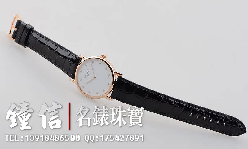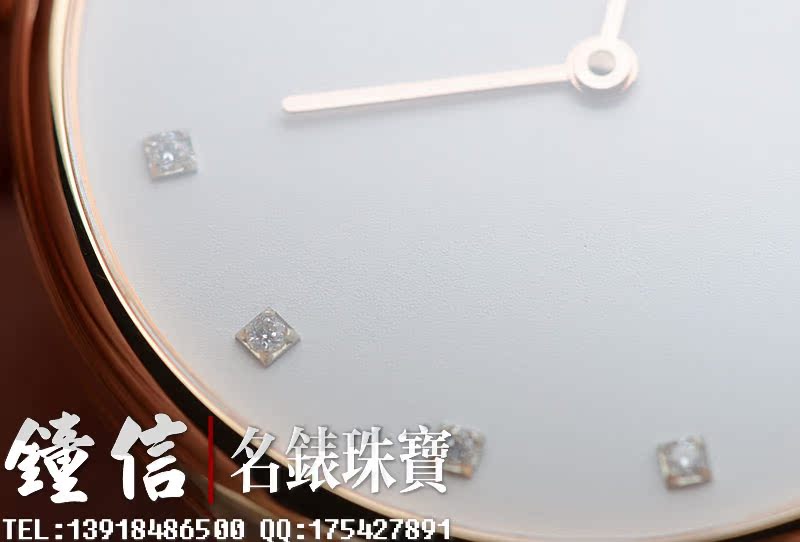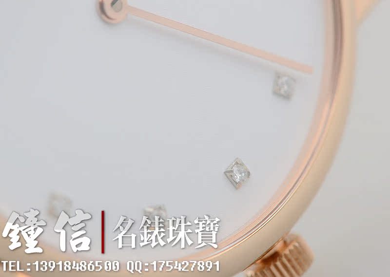 低温仿瓷白色面盘,刻度镶钻。金质时分针,黑色鳄鱼皮表带。