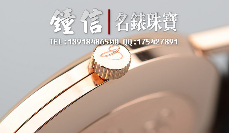 玫瑰金表壳及表扣,圣伯纳狗头印记。蓝宝石水晶镜面。