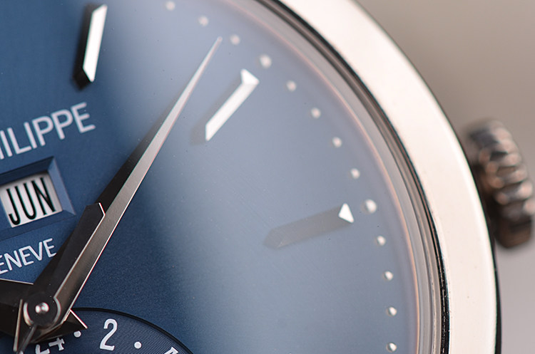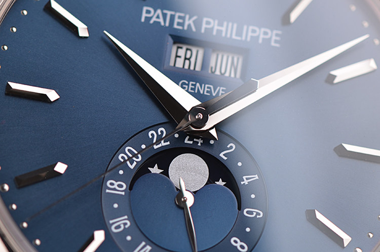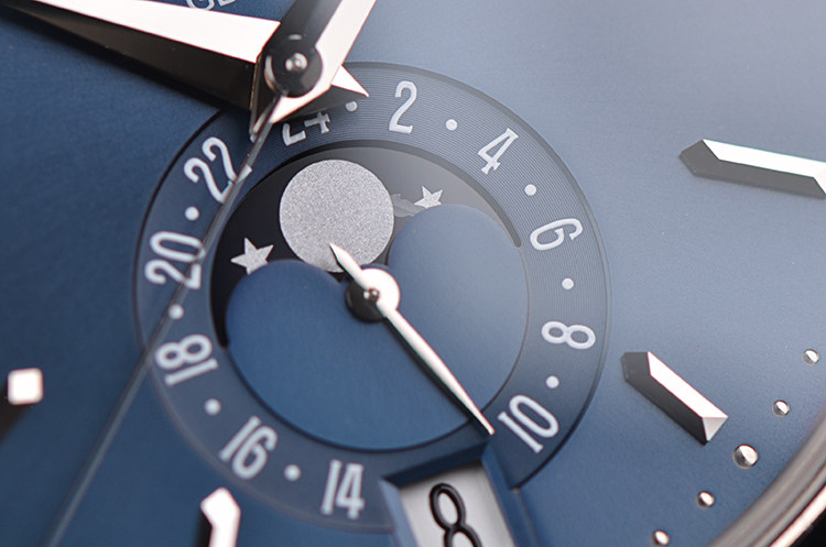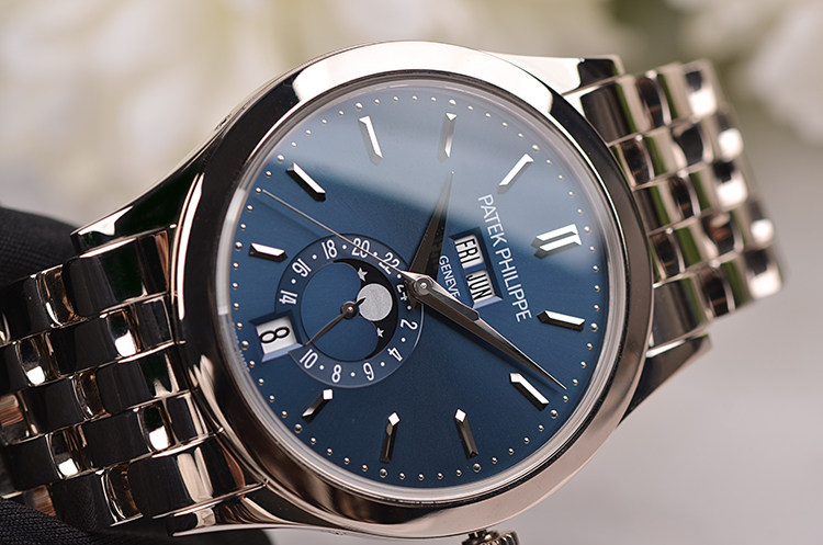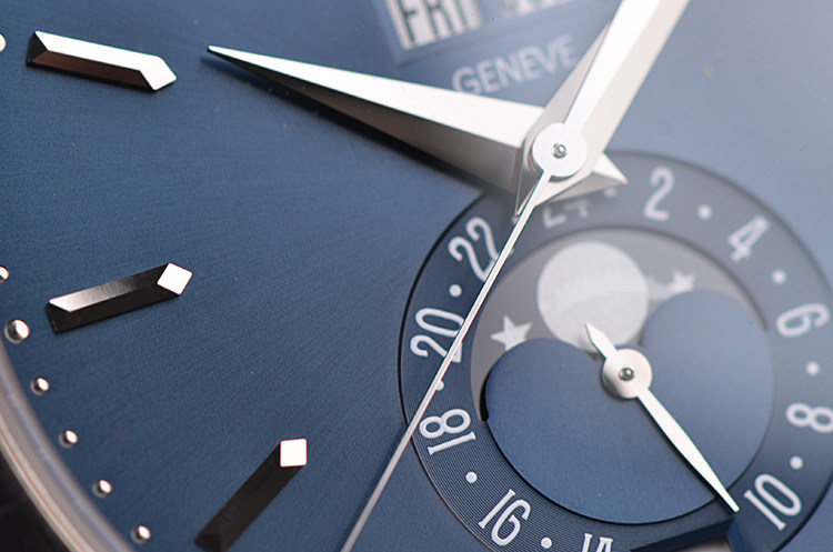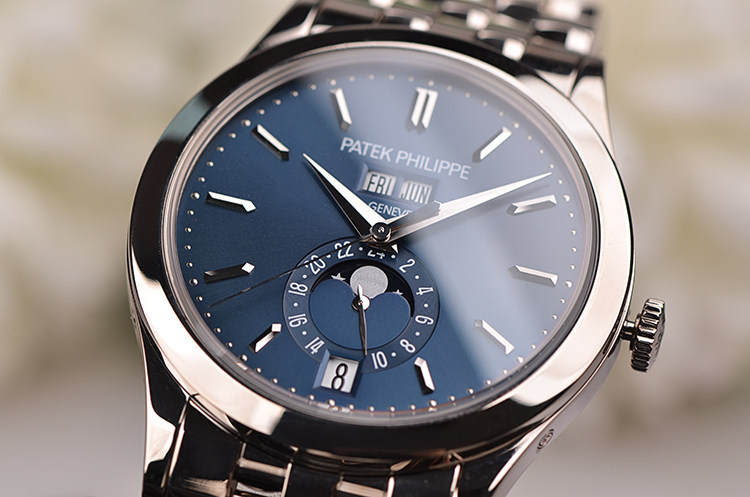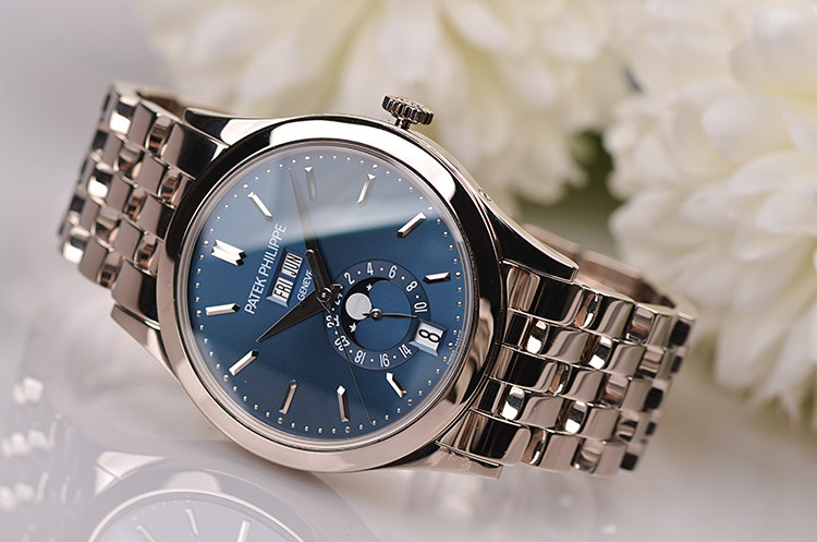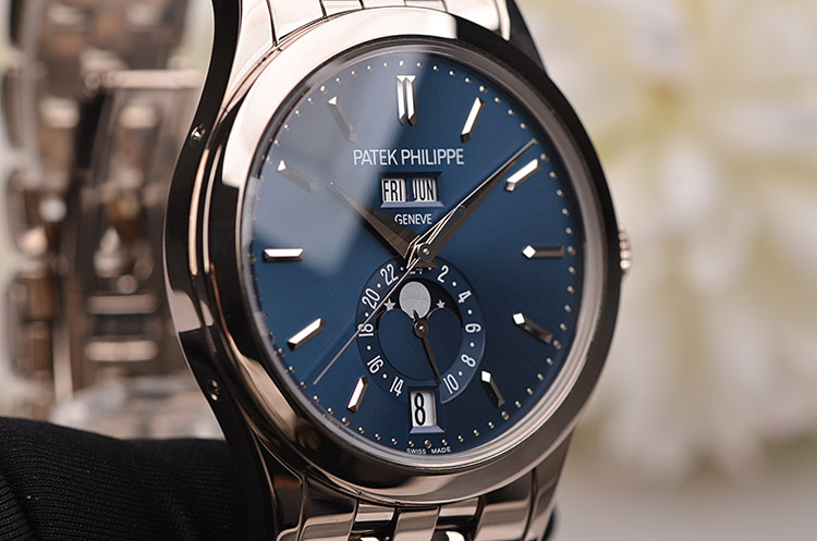 表盘:立体热门蓝色年历月相表盘,白金刻度及指针