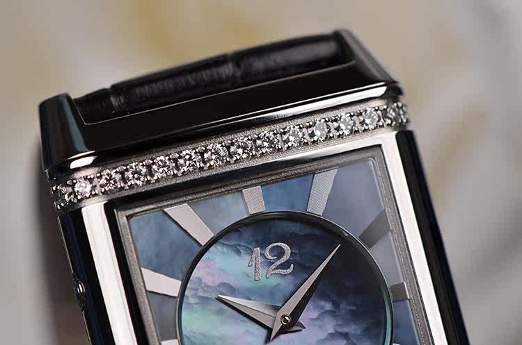 翻转系列双表盘精钢镶钻蓝色珍珠贝母面手上链皮带女表