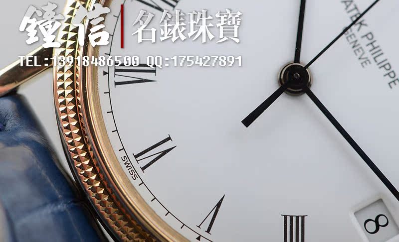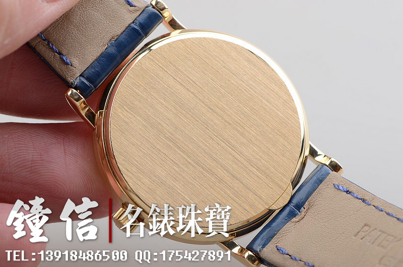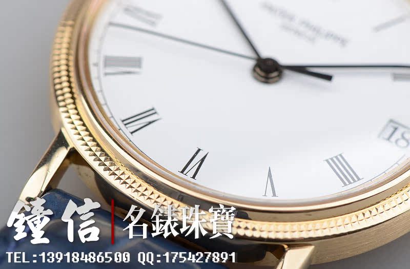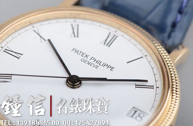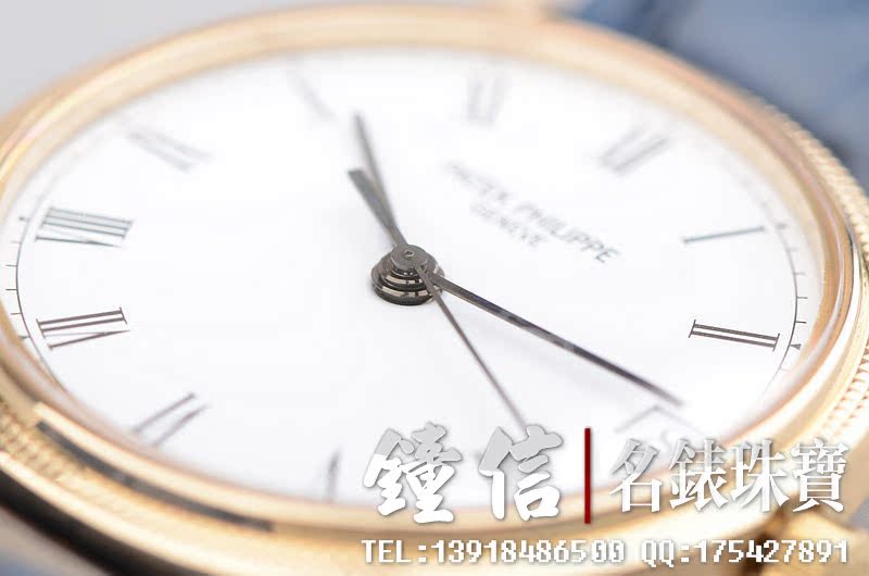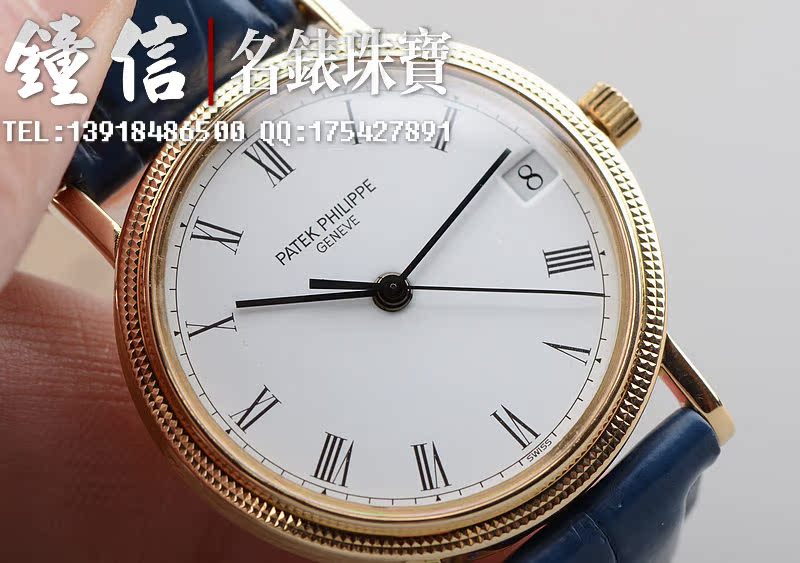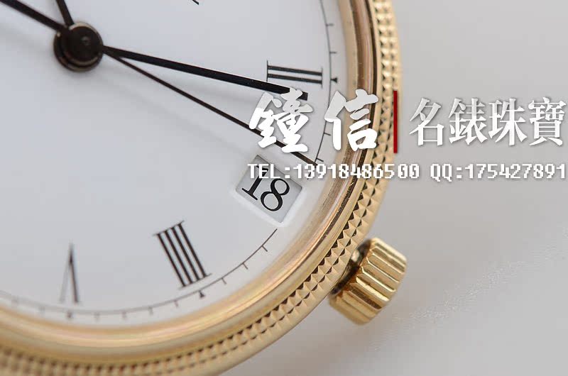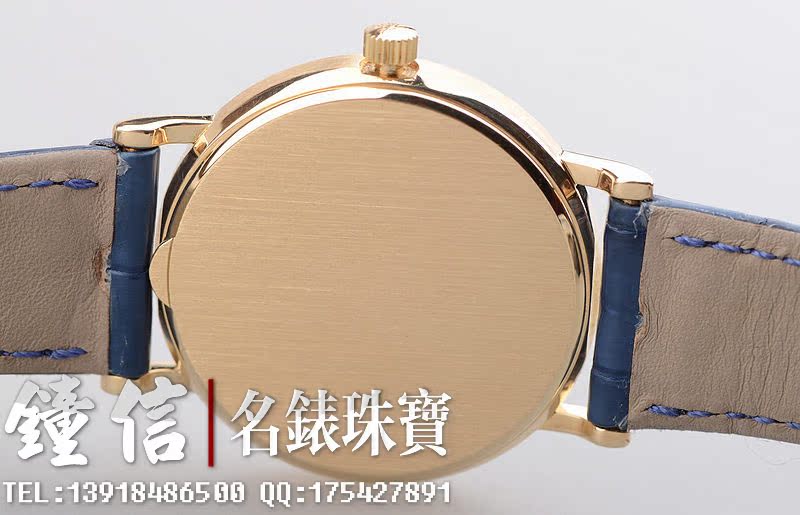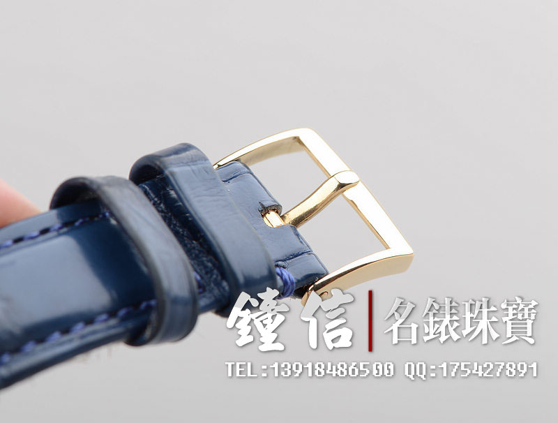 18K巴黎饰丁黄金表壳,18K黄金表扣,女皇头印记。蓝宝石水晶镜面,低温白色珐琅面盘,镀铑指针,罗马字刻度。少见的原厂蓝色鳄鱼皮表带很新。口径33MM不含表把,厚度6MM。防水25M。