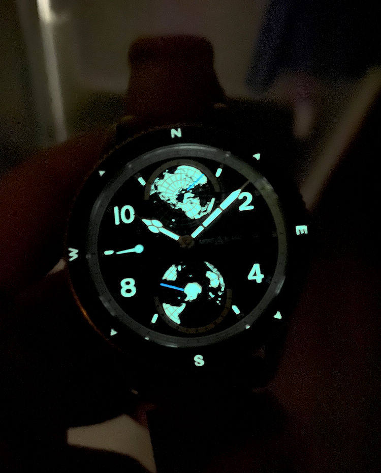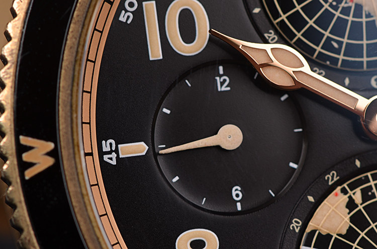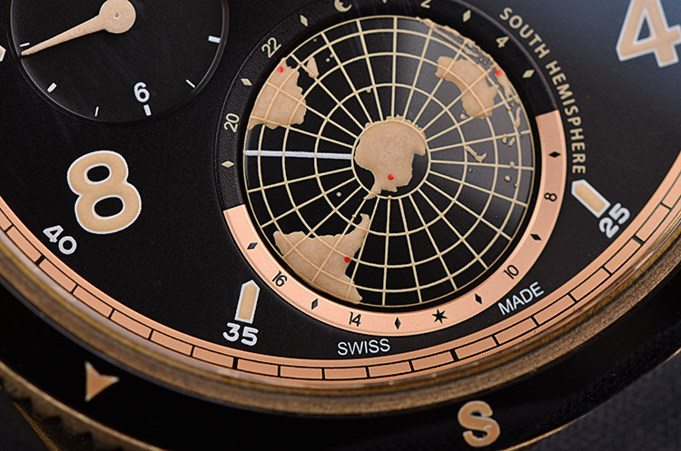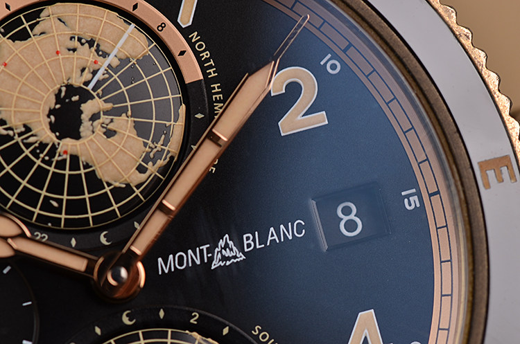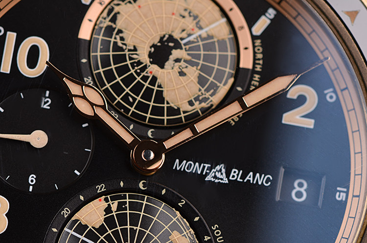 表盘:立体黑色南北半球世界时表盘,夜光南北半球图案及阿拉伯数字刻度,玫瑰金夜光指针