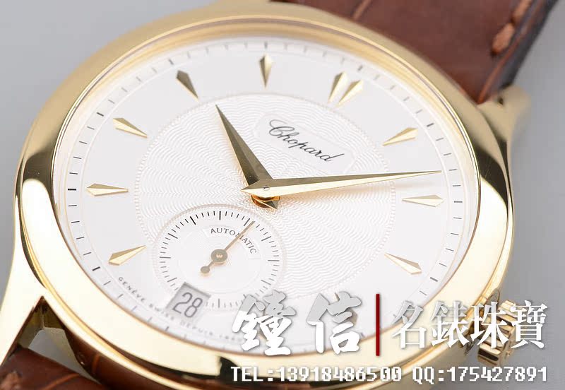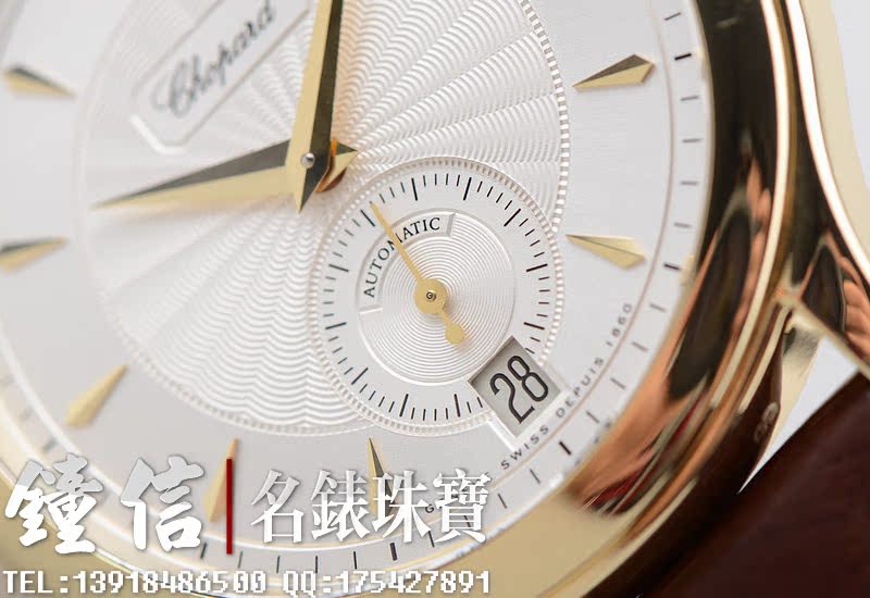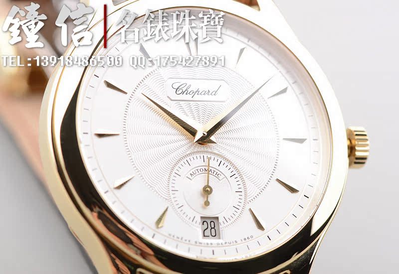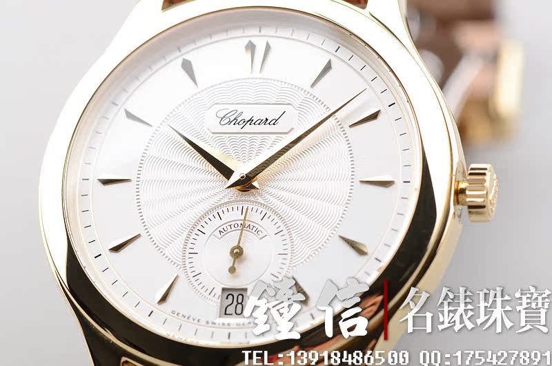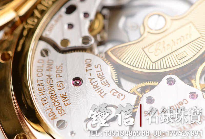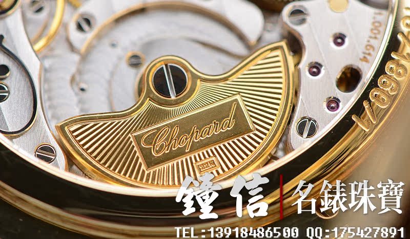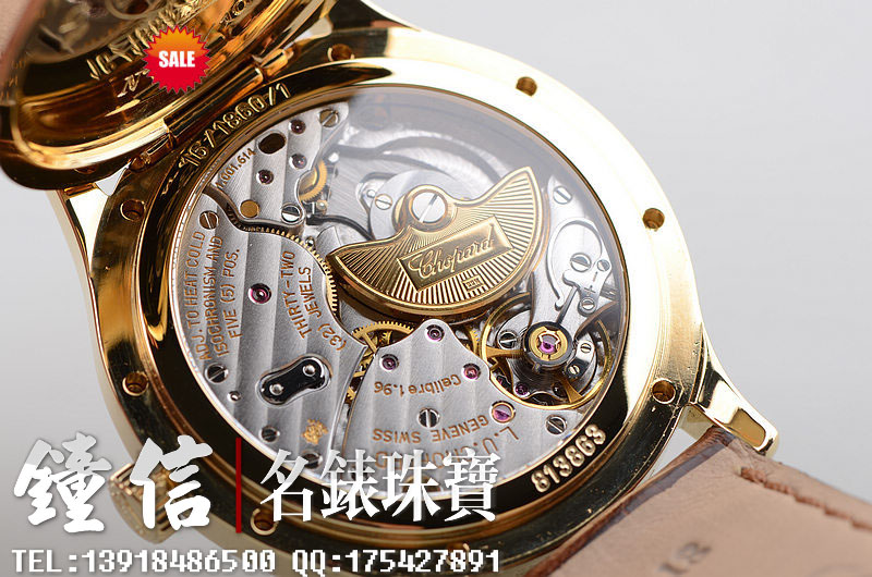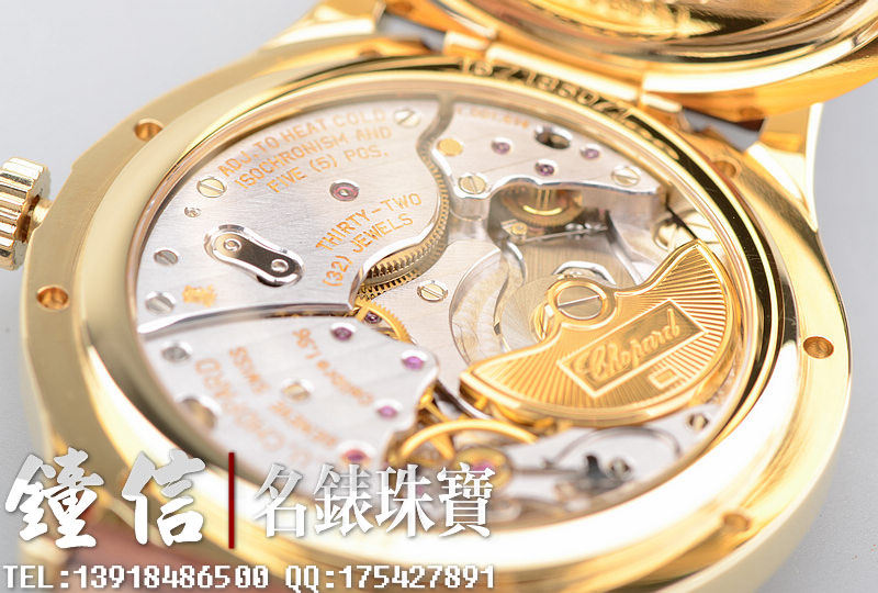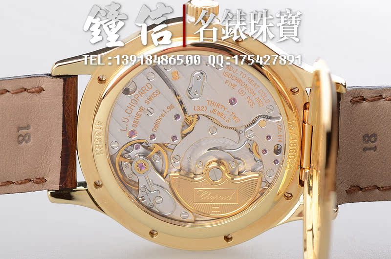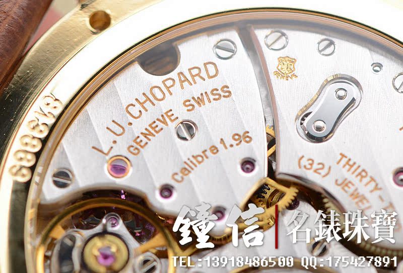 赫赫有名的LUC最高端1.96机芯,世界上唯一拥有瑞士天文台及日内瓦双印记的珍珠陀机芯,自动机械,22K黄金雕刻自动陀,双发条盒,宝玑游丝,双温差调节,五方位校正,动力储存高达65小时,32钻,摆频28800。鹅颈微调功能。