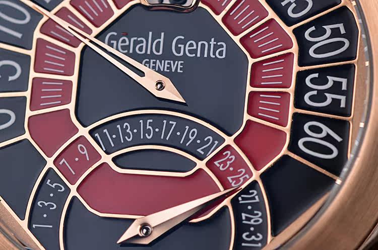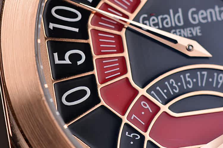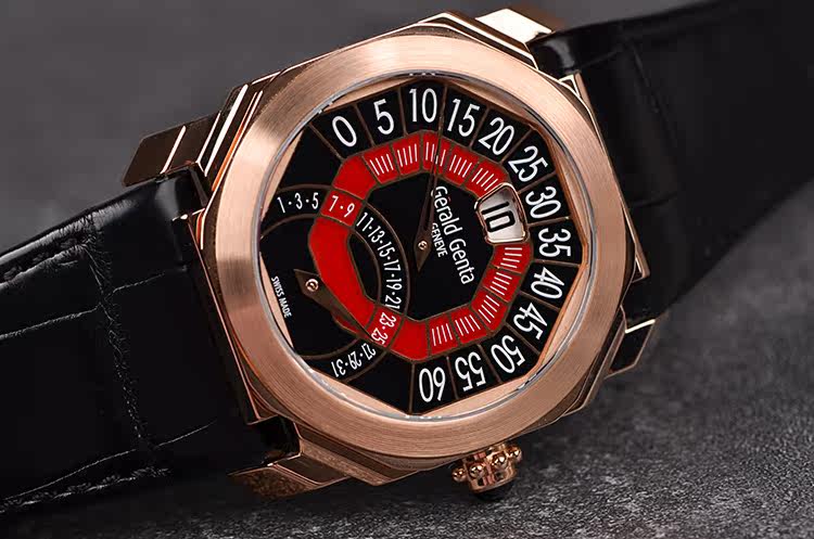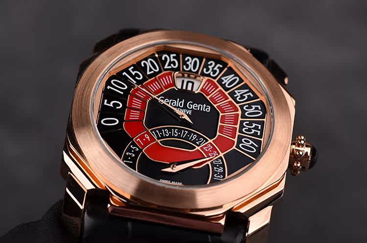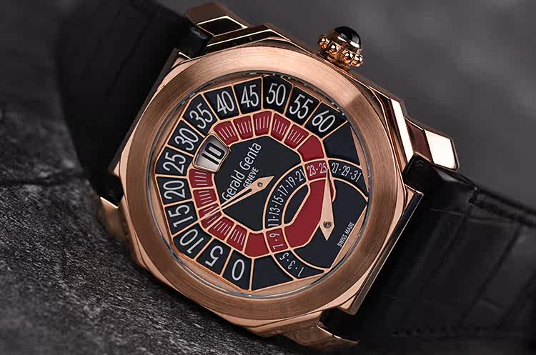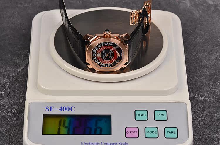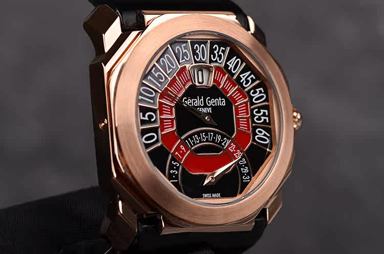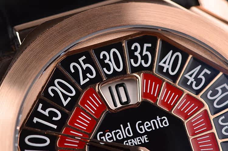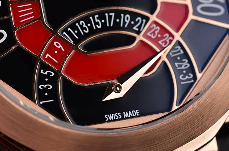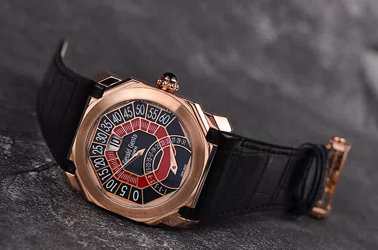 表盘:立体黑红双色跳时表盘,玫瑰金指针,日历逆跳