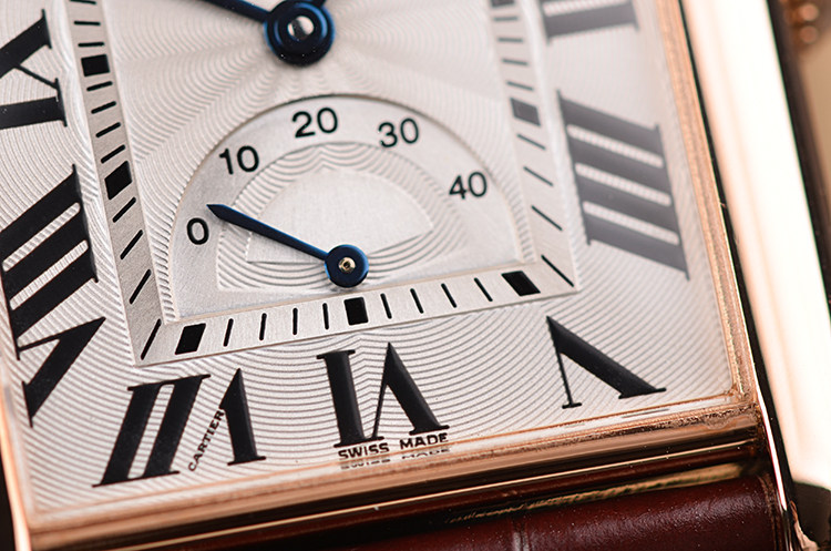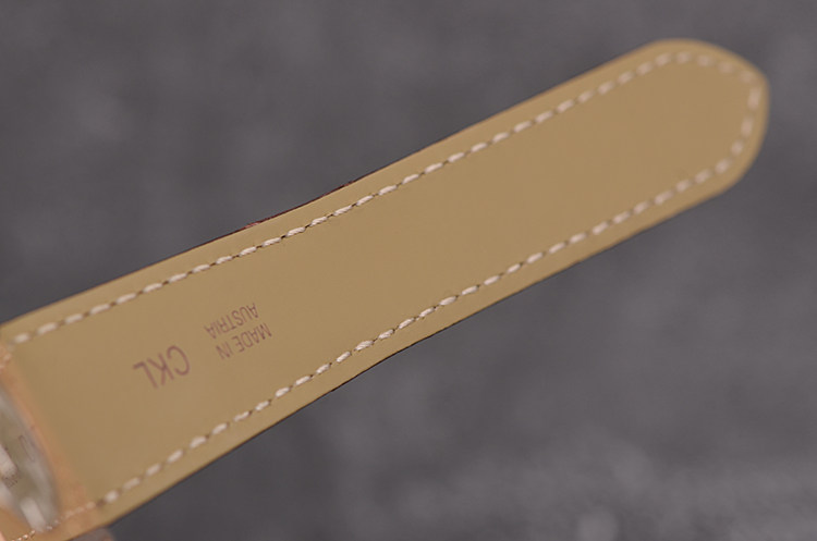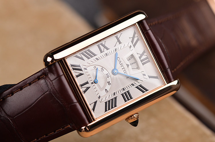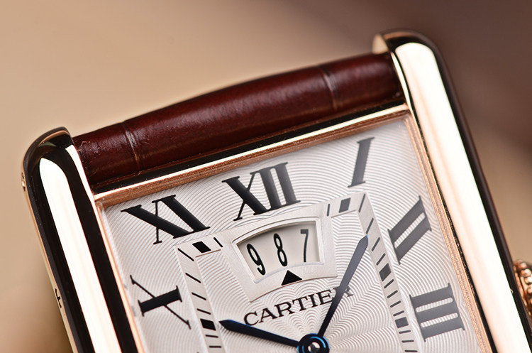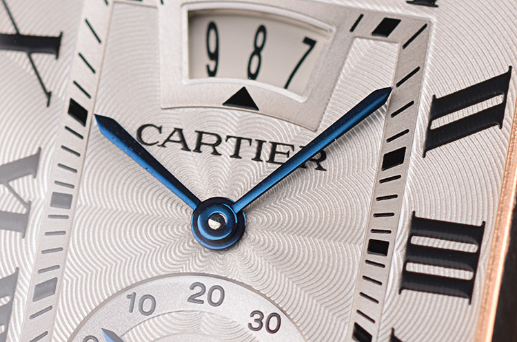 表盘:立体银白色表盘,蓝钢指针,黑色罗马数字刻度,日历显示,动力储备显示