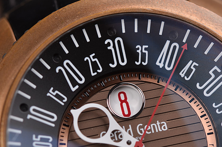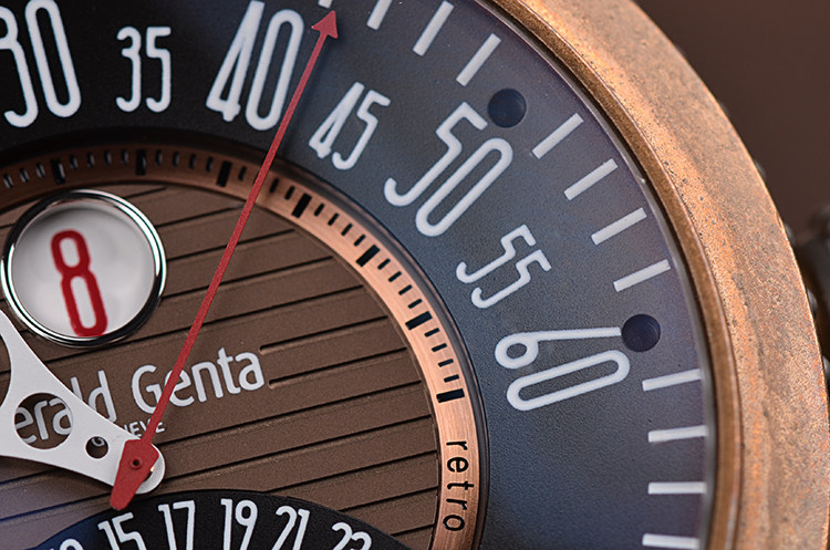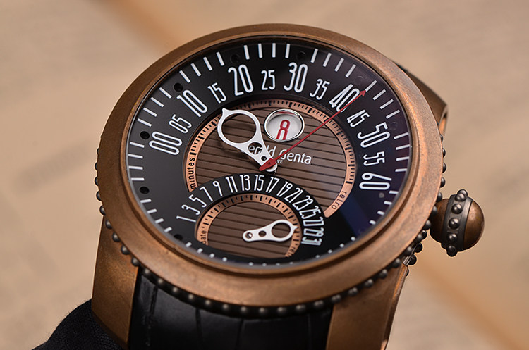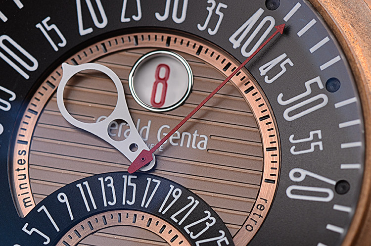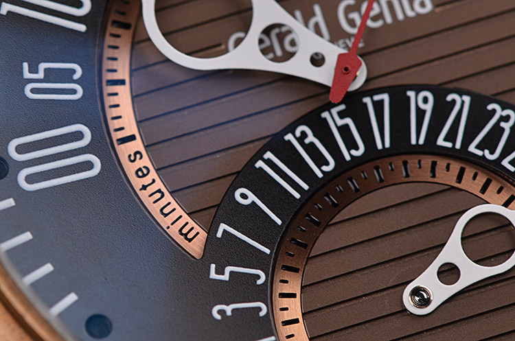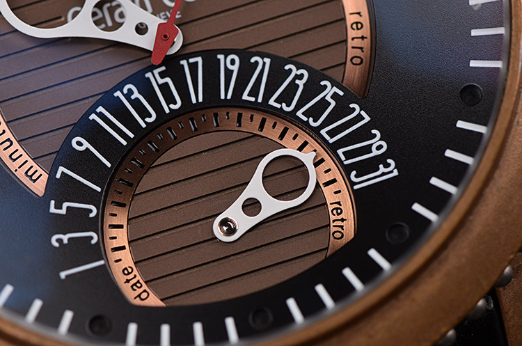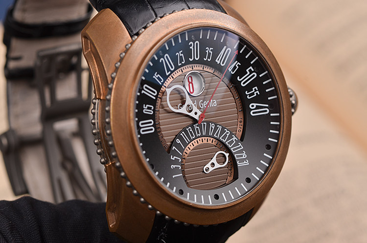 表盘:立体黑色及古铜色双色跳时表盘,分针及日历逆跳
