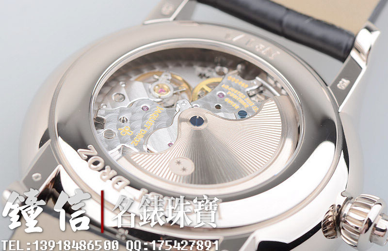 18K白金表壳及表扣,圣伯纳狗头印记。蓝宝石水晶镜面及底盖。极其