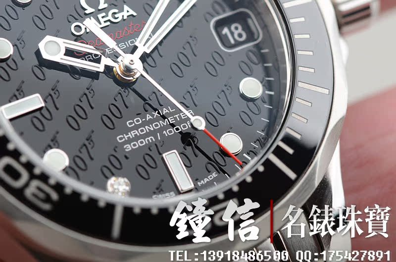 黑色亮漆表盘上带有007 monogram图案。41毫米表款带有11个小时刻度;36.25毫米表款则带有10个小时刻度,另有一个镶钻小时刻度位于7时位置——表示此表款是向007系列电影的历史致敬的特别之作。小时刻度覆以可发出蓝色光芒的白色夜光涂层,使得腕表在任何光线环境下都可轻易读取时间。3时位置为日期窗口。