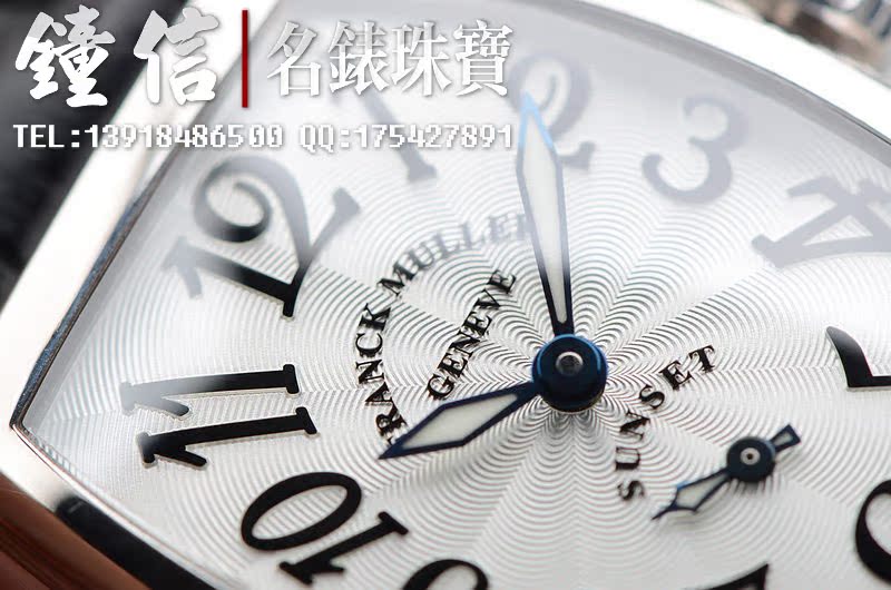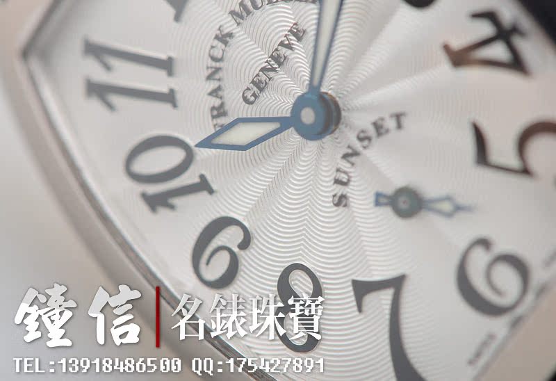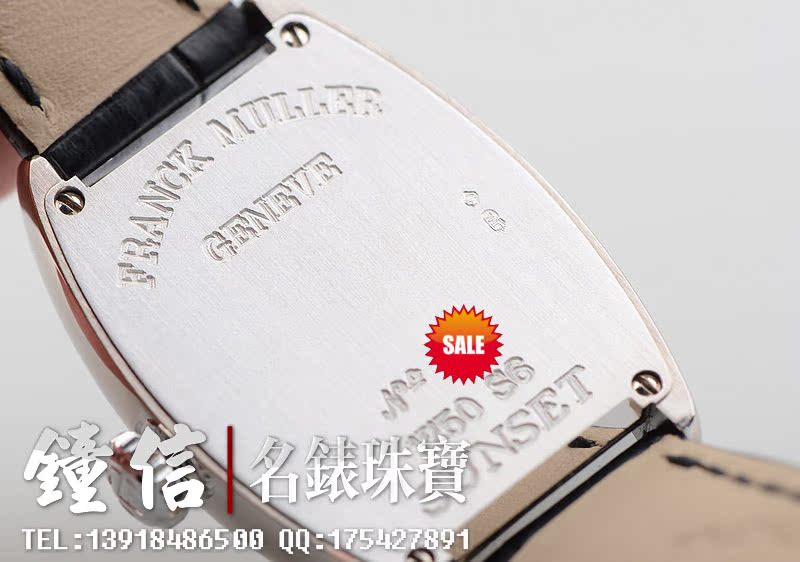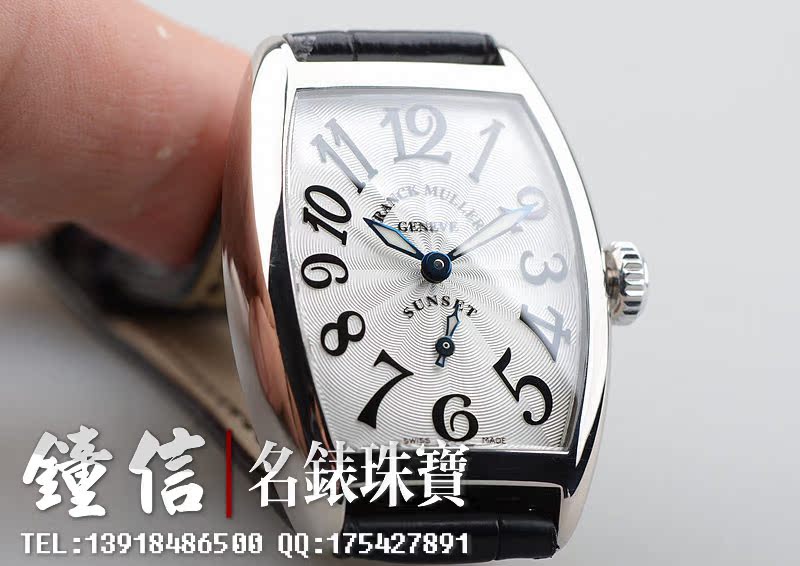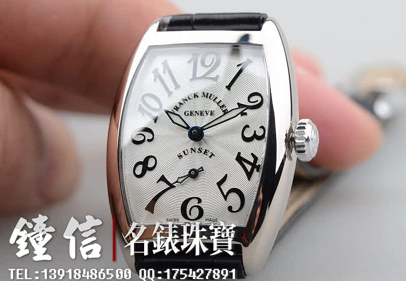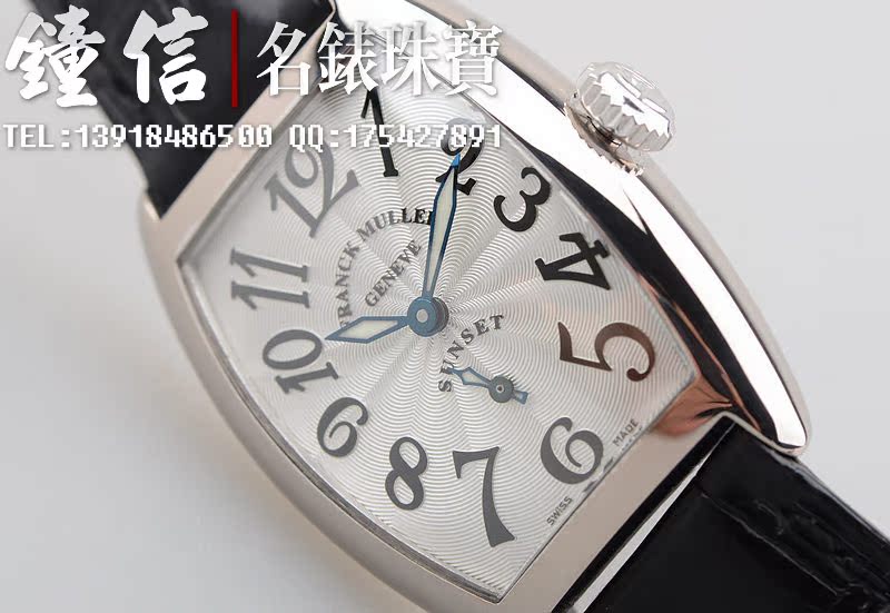 18K白金表壳及表扣,圣伯纳狗头印记。后配全新鳄鱼皮表带。经典的酒桶型FM表壳,蓝宝石水晶镜面,立体白色放射纹表盘,蓝钢夜光指针及短秒。黑色阿拉伯数字刻度。口径35MM*25MM*7MM。防水30M。
