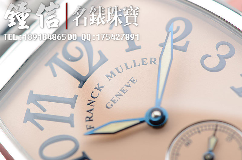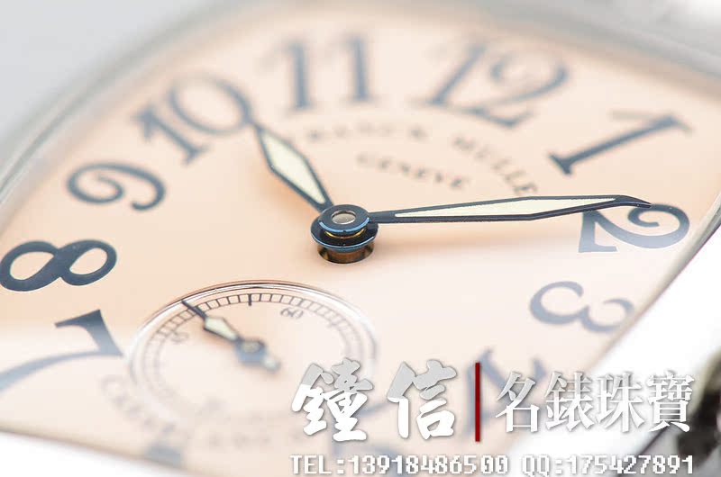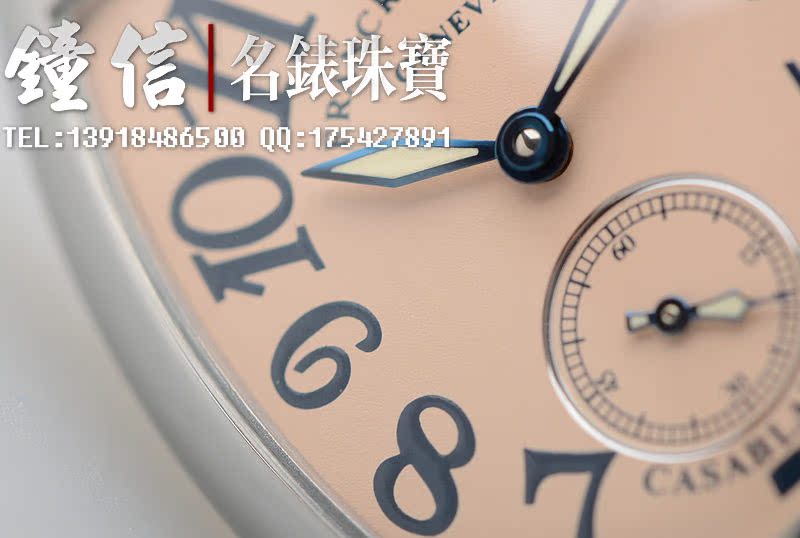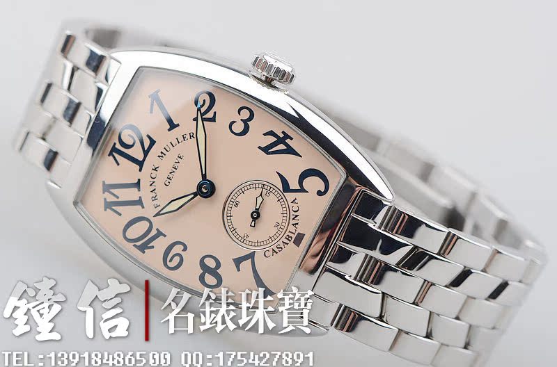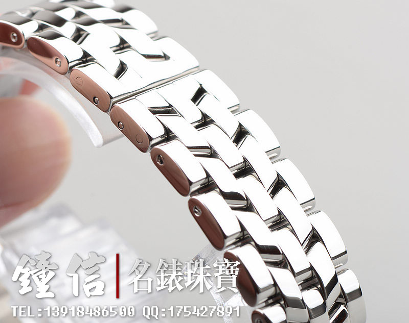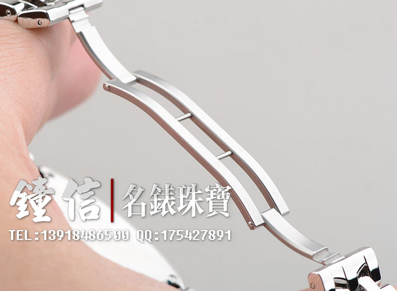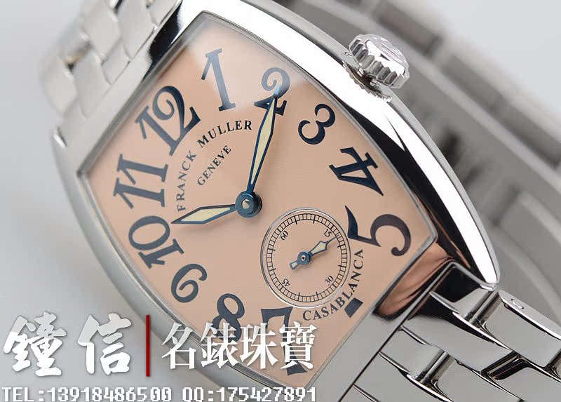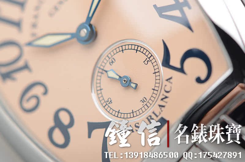精钢表壳及链带,双向按压式折叠表扣。拱形蓝宝石水晶镜面,立体粉色细喷砂表盘,黑色阿拉伯数字刻度。路轨式小秒盘,蓝钢夜光指针。口径38MM*33MM*7MM。相当于圆表33MM口径大小。防水30M。