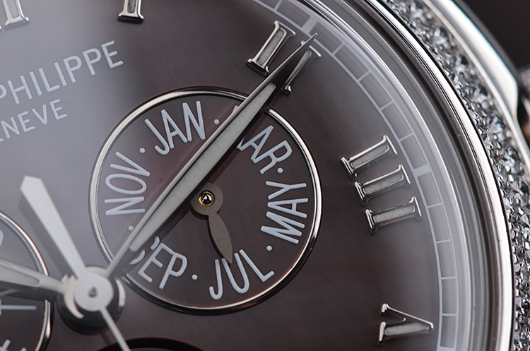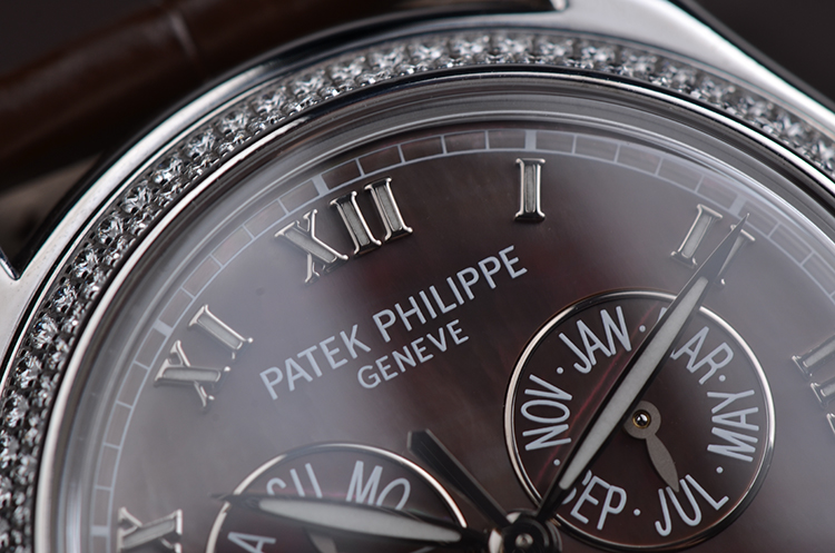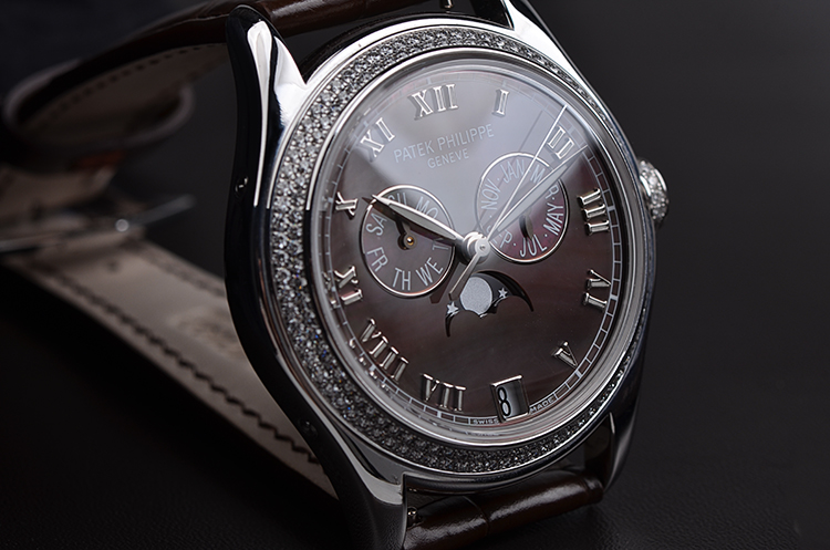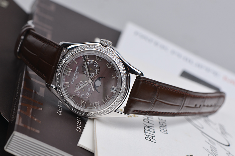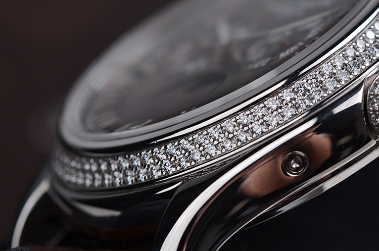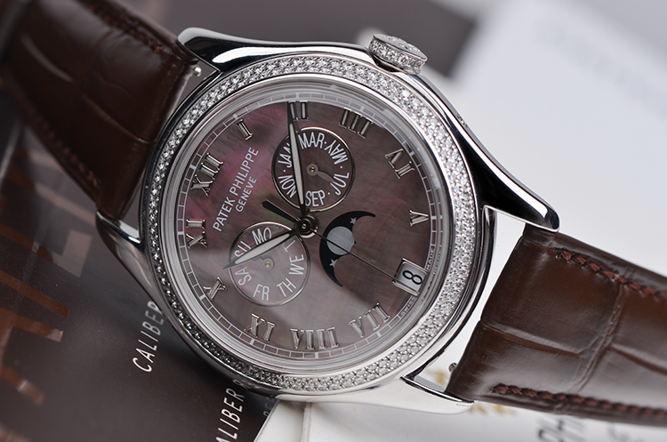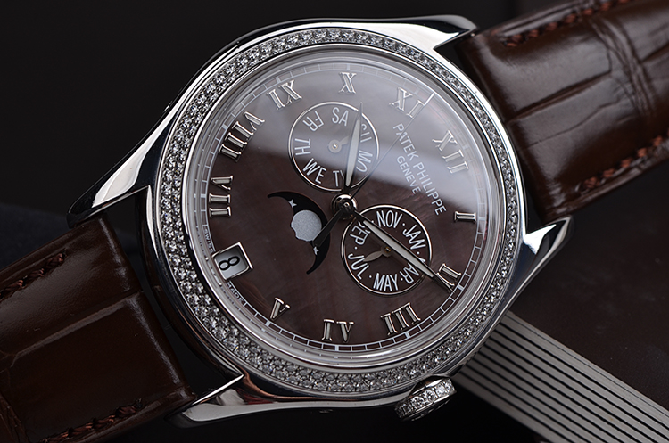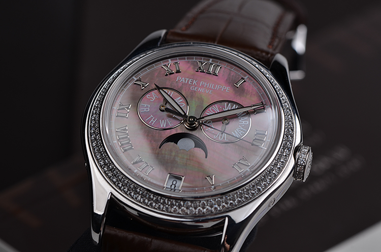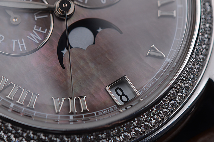复杂功能时计系列白金镶钻贝母面年历月相自动皮带女表