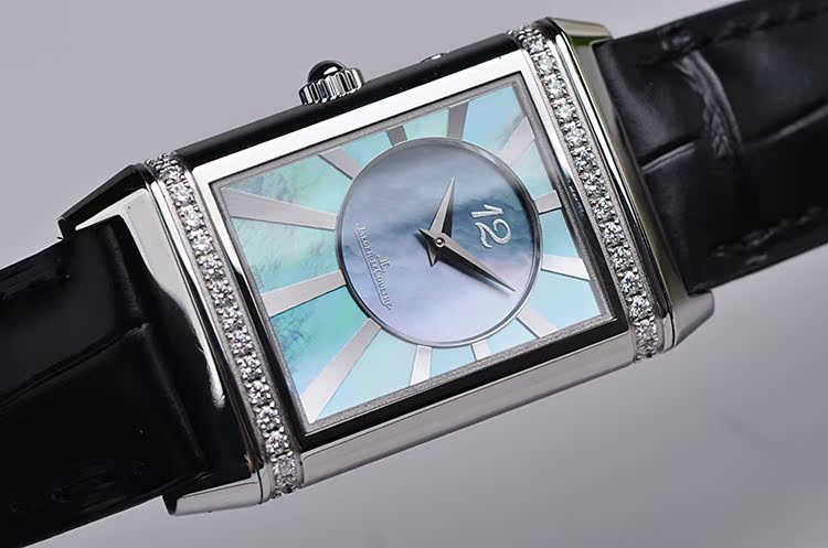 翻转系列双表盘精钢镶钻蓝色珍珠贝母面手上链皮带女表