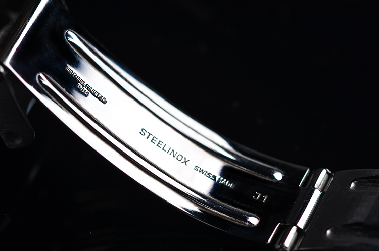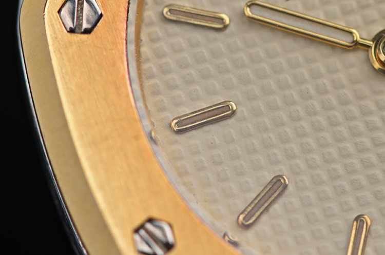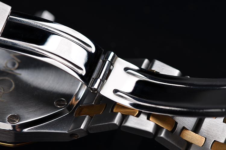 表壳:精钢八角形表壳,18K黄金表圈,前后盖白金螺丝