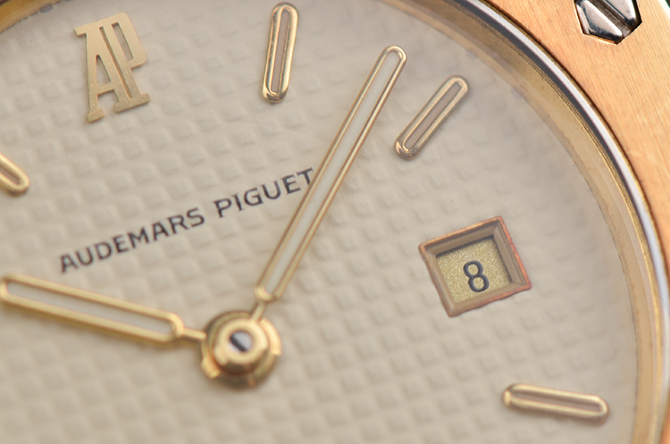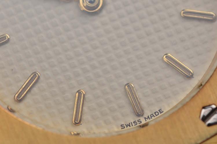 表盘:立体白色华夫格表盘,黄金刻度及指针,日历显示