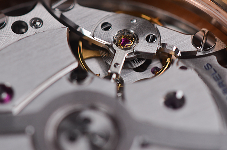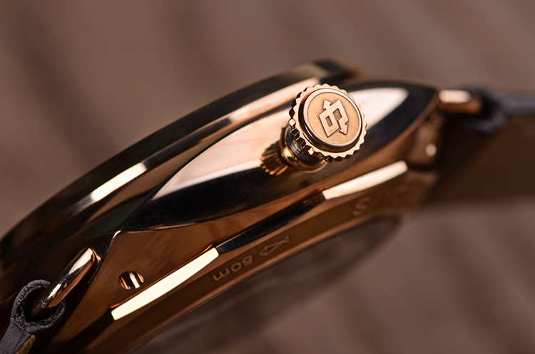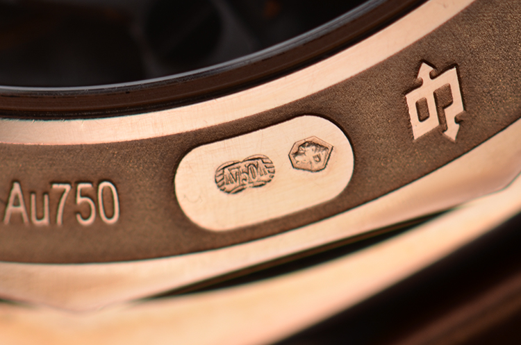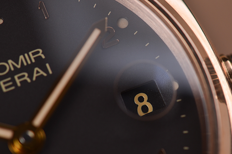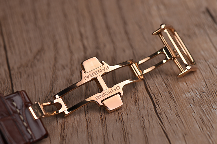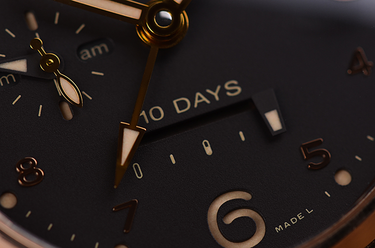 表盘:立体深棕色三明治表盘,阿拉伯数字刻度,玫瑰金指针,GMT指针,日历显示,线性动力储备显示,昼夜显示