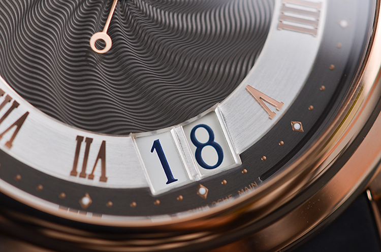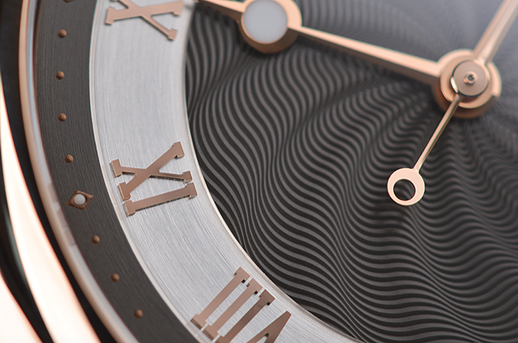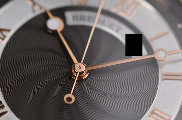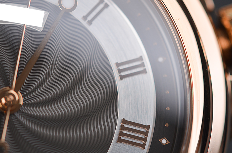 表盘:立体银黑双色白金镀银镌刻表盘,玫瑰金罗马数字刻度及指针