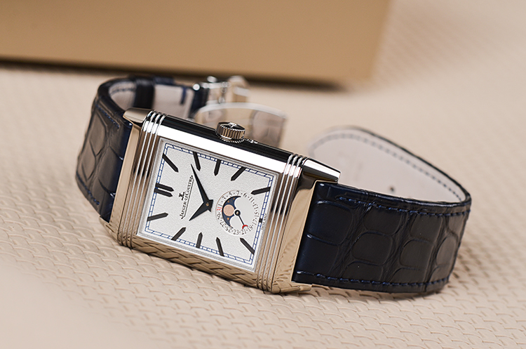 表盘:立体白蓝双面表盘,白面蓝钢刻度及指针,6点位指针日历及月相显示。蓝面6点位昼夜显示功能