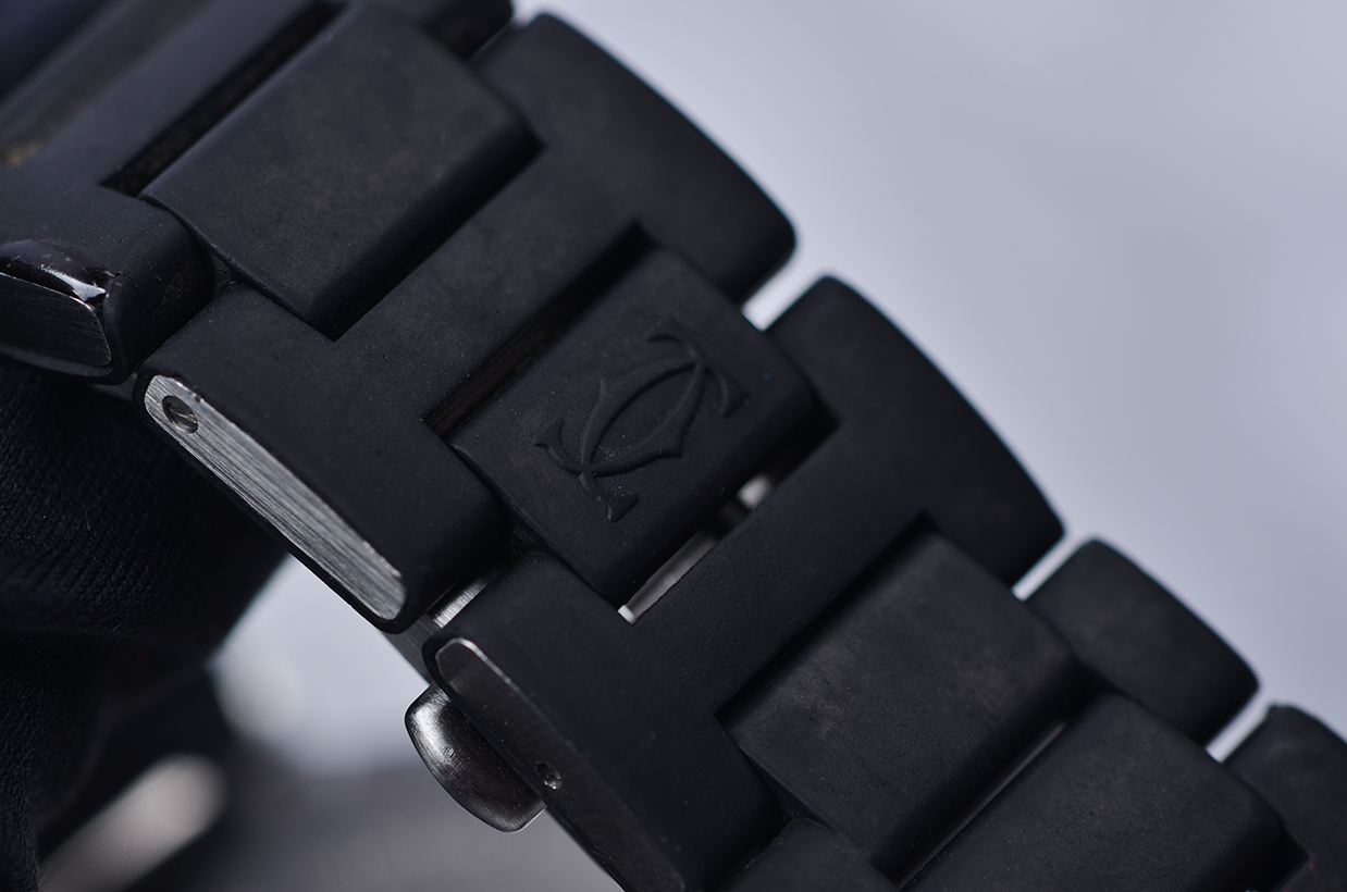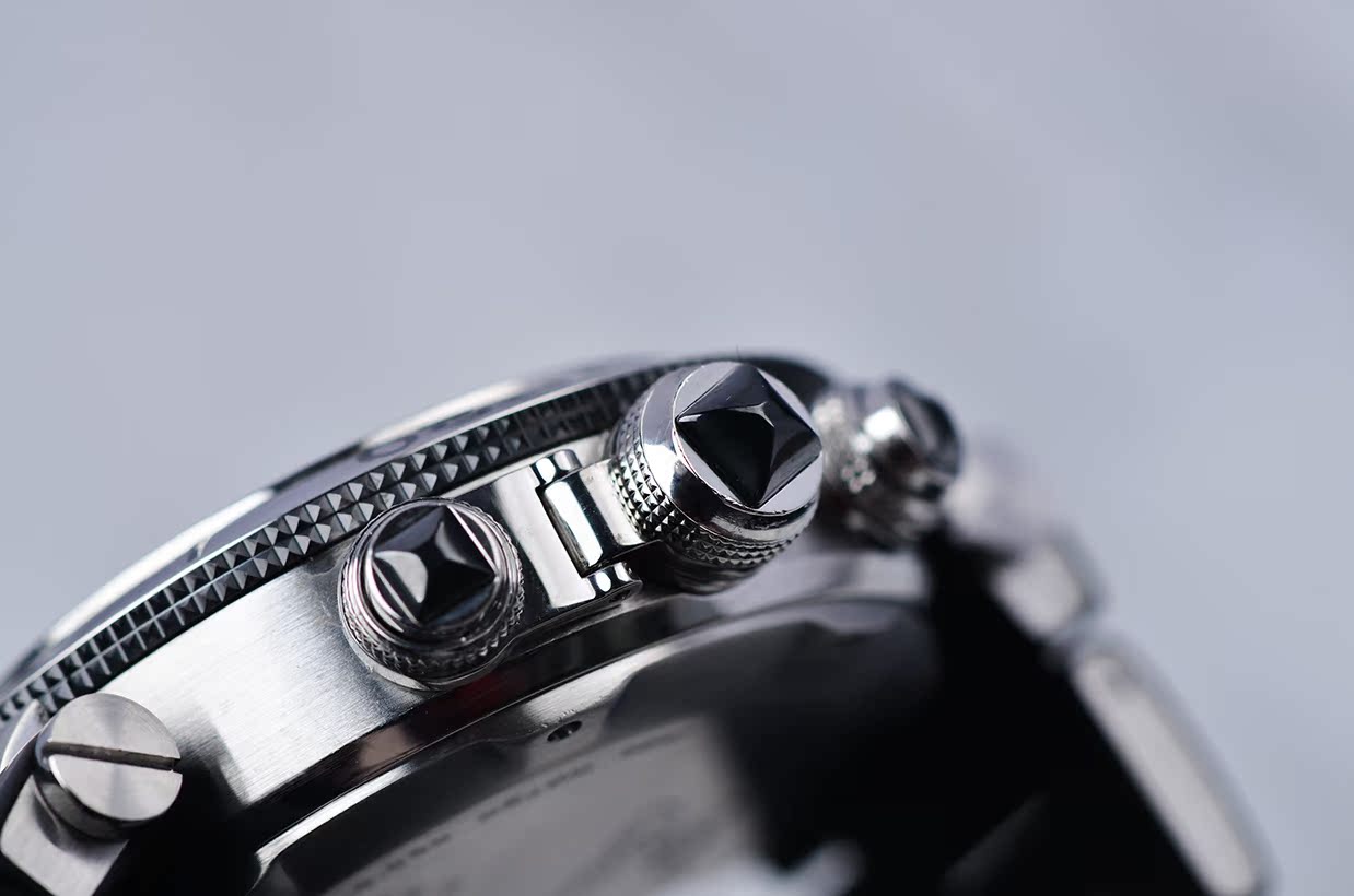 表壳:精钢表壳,单向可旋转表圈,表冠及计时按钮镶嵌3颗黑色尖晶石