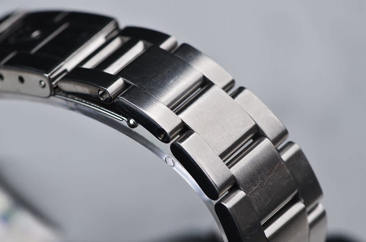 精钢表壳,红蓝双色双向旋转表圈,精钢表链。蓝宝石水晶镜面,立体黑色面盘,夜光刻度及奔驰指针。3点位放大镜日历。旋入式防水表冠。口径40MM*12.8MM,防水100M。