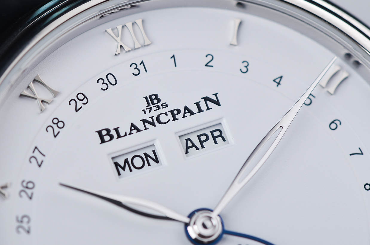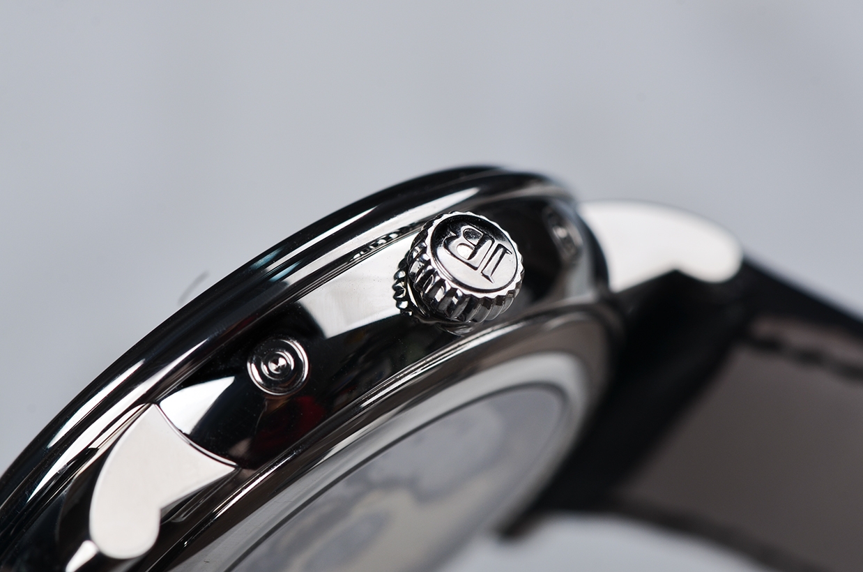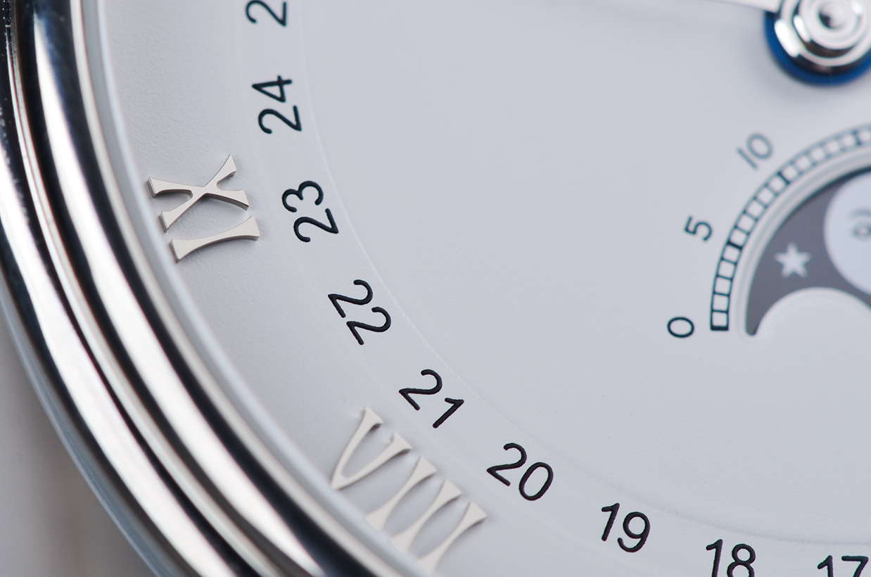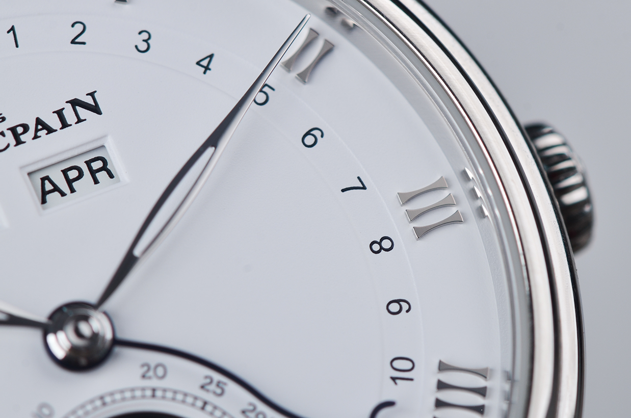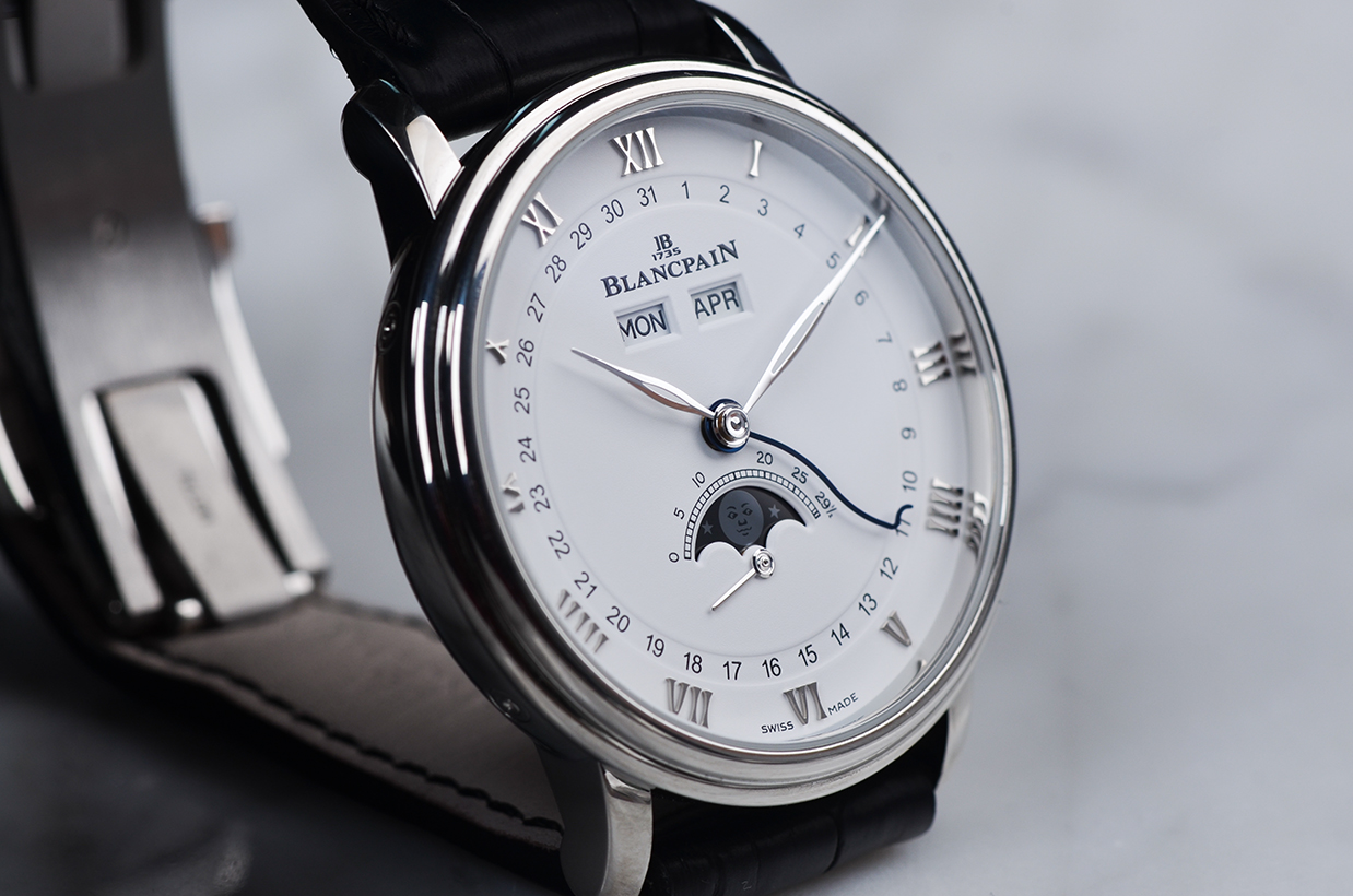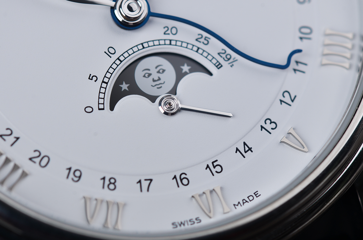 表盘:立体白色表盘,罗马数字刻度,柳叶指针,月份,星期,日历,月相显示
