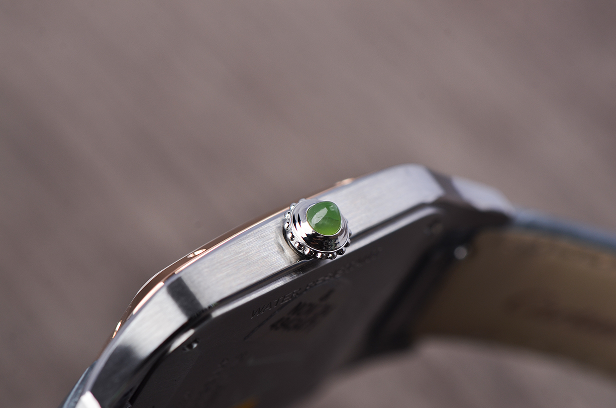 表壳:精钢表壳,18K玫瑰金表圈,绿色软玉表冠,限量版底盖
