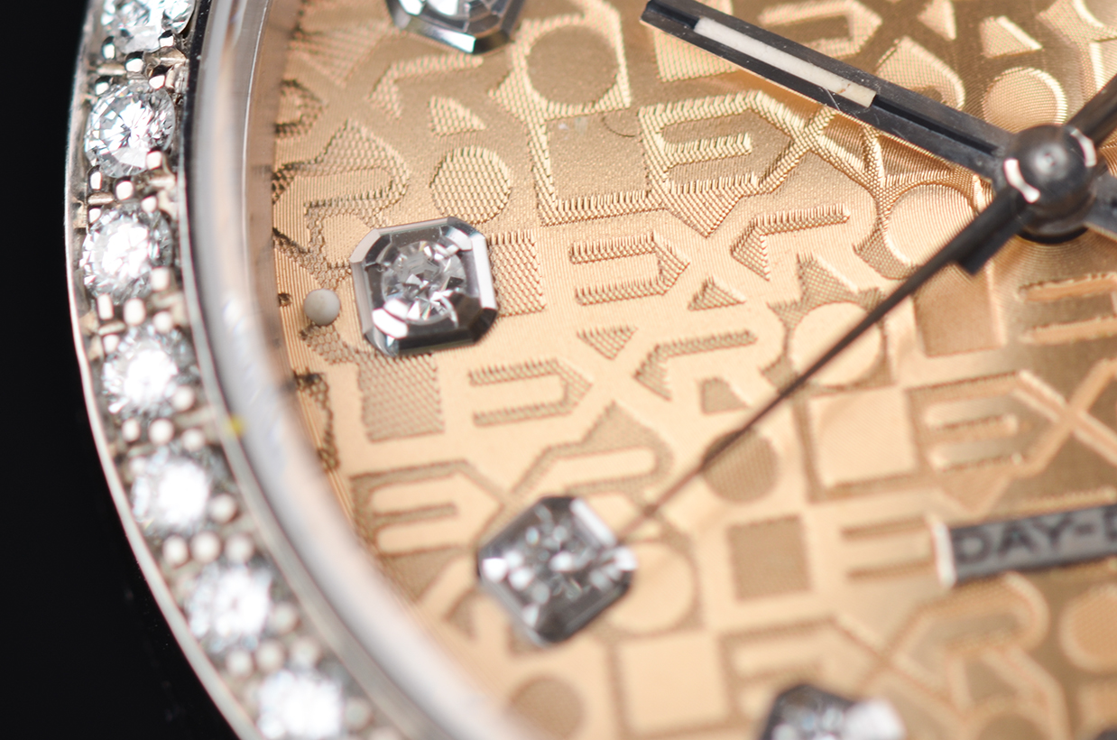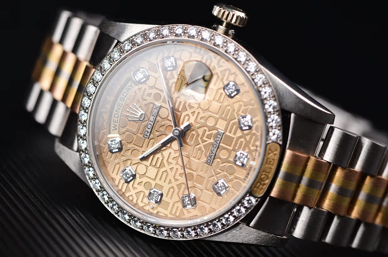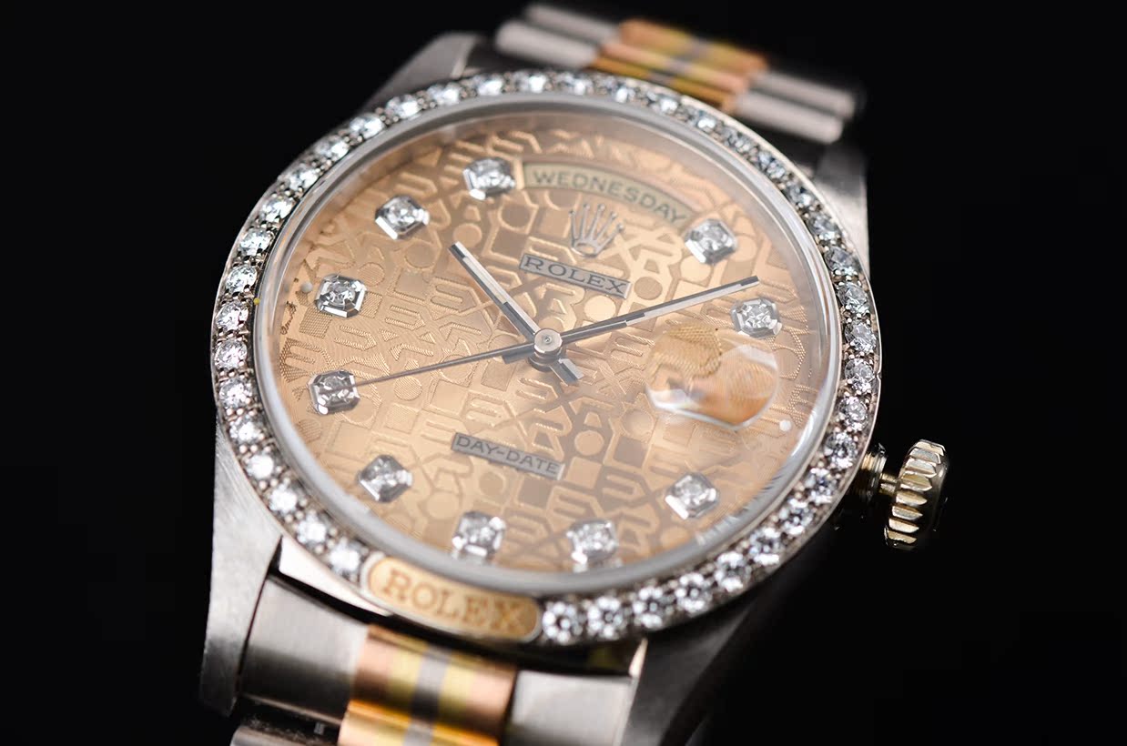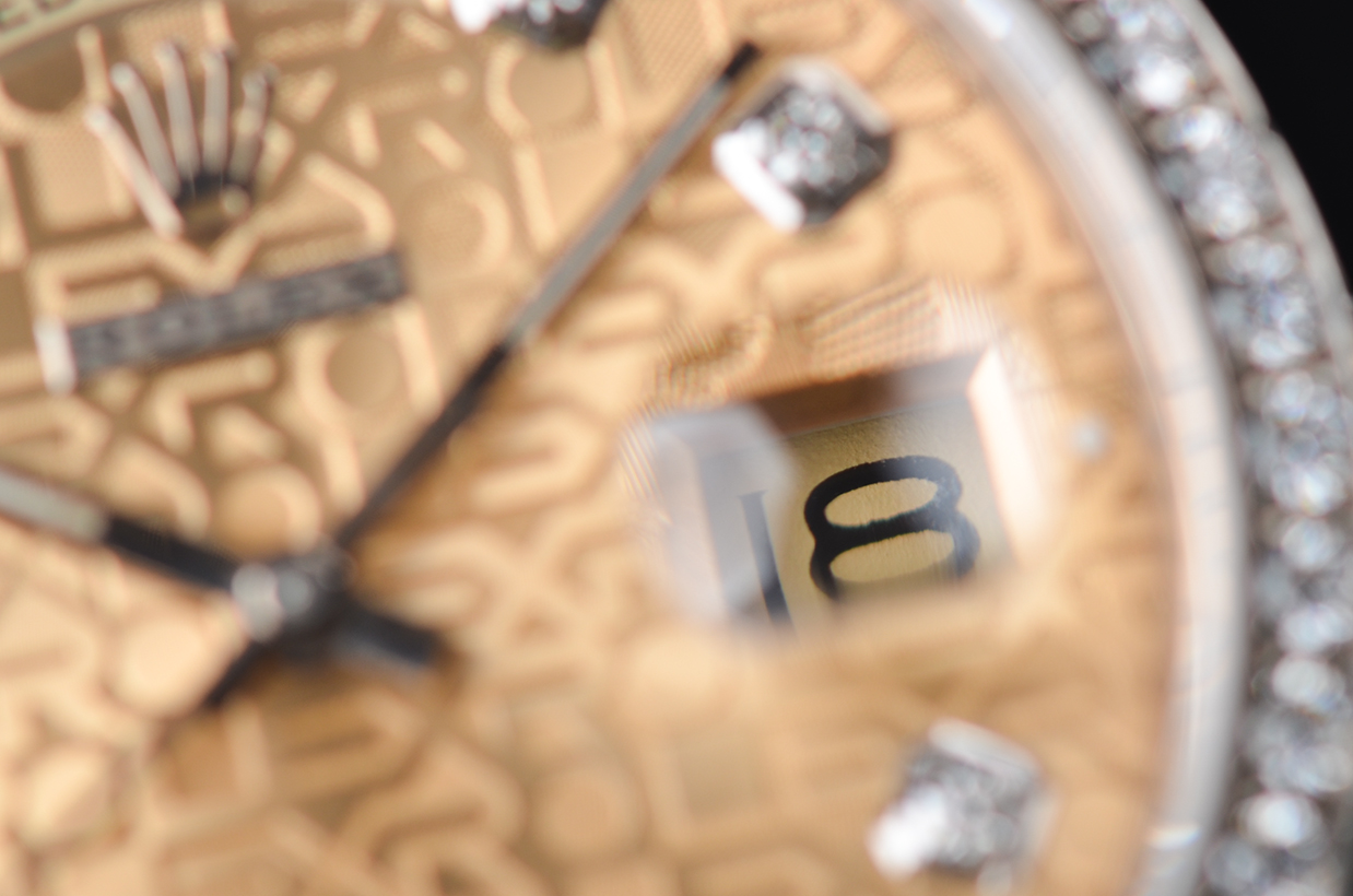 表盘:立体金色纪念纹表盘,玫瑰金指针,10颗钻石时标,星期显示,放大镜日历