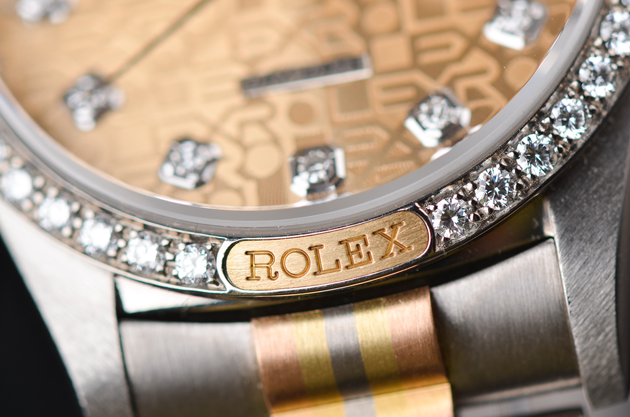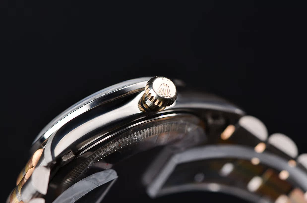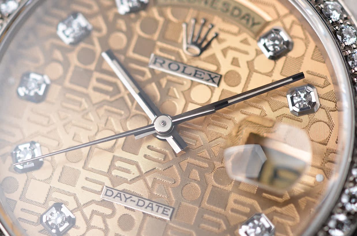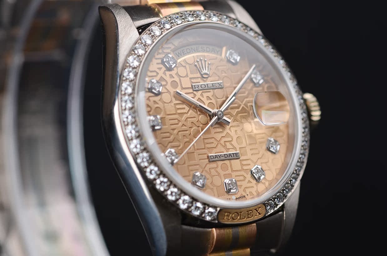 表盘:立体金色纪念纹表盘,玫瑰金指针,10颗钻石时标,星期显示,放大镜日历