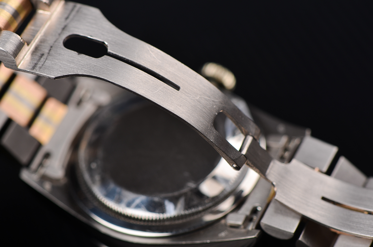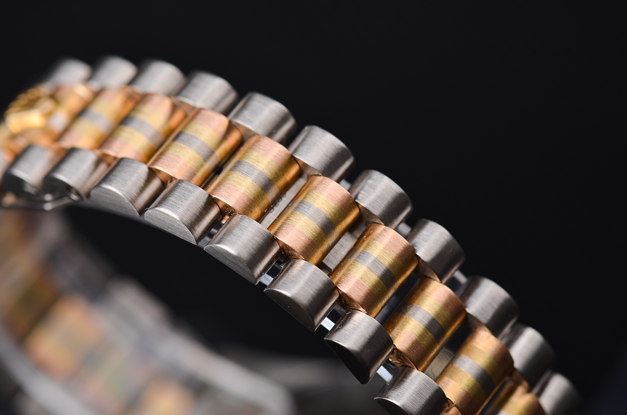 表带:18K白金、黄金、玫瑰金三种贵金属打造,俗称彩虹带,22节,腕周约190MM
