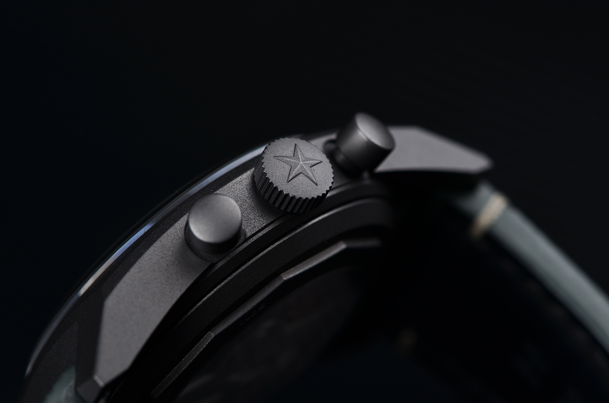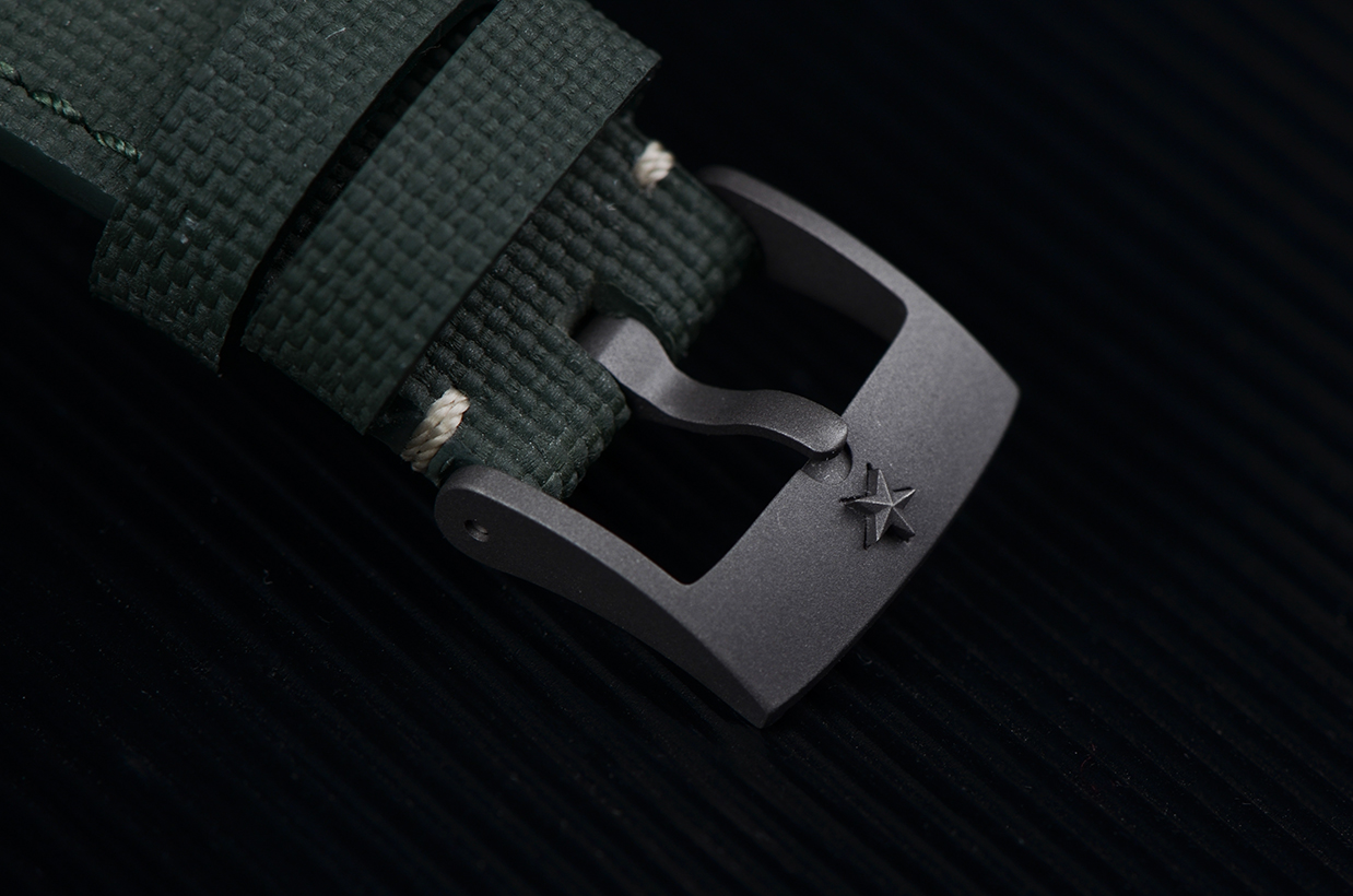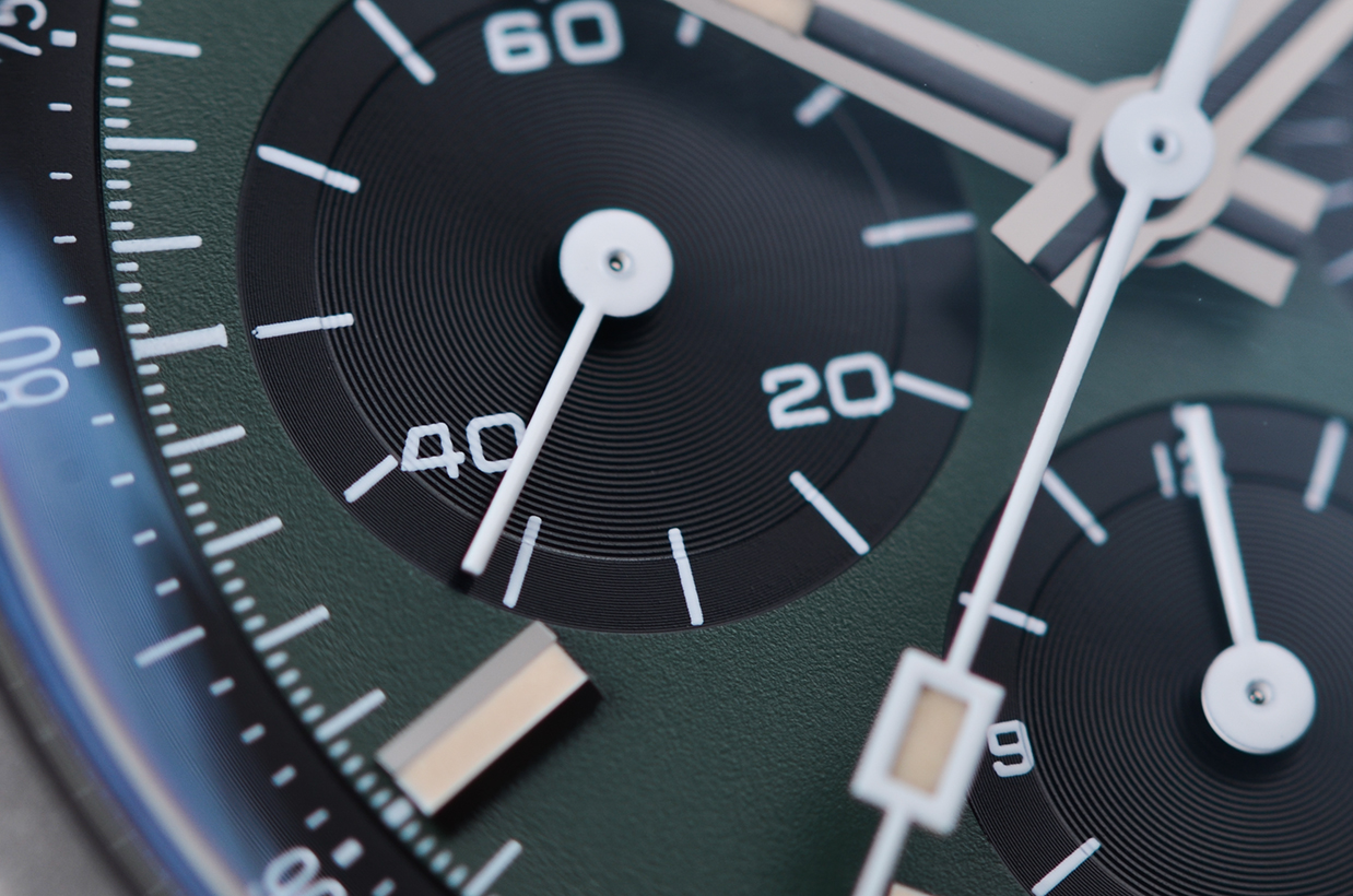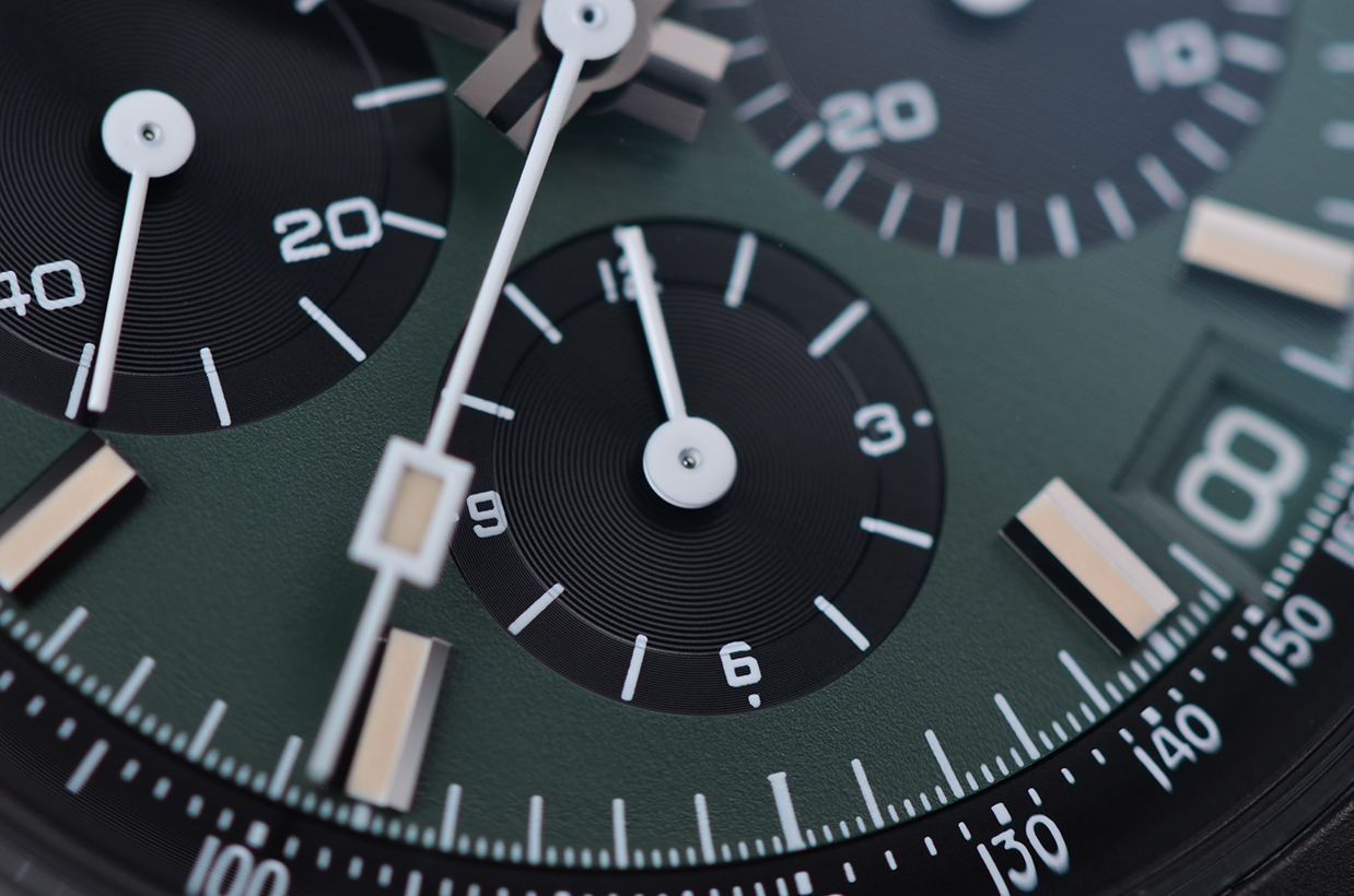 表盘:立体卡其绿色计时表盘,夜光刻度及指针,日历显示