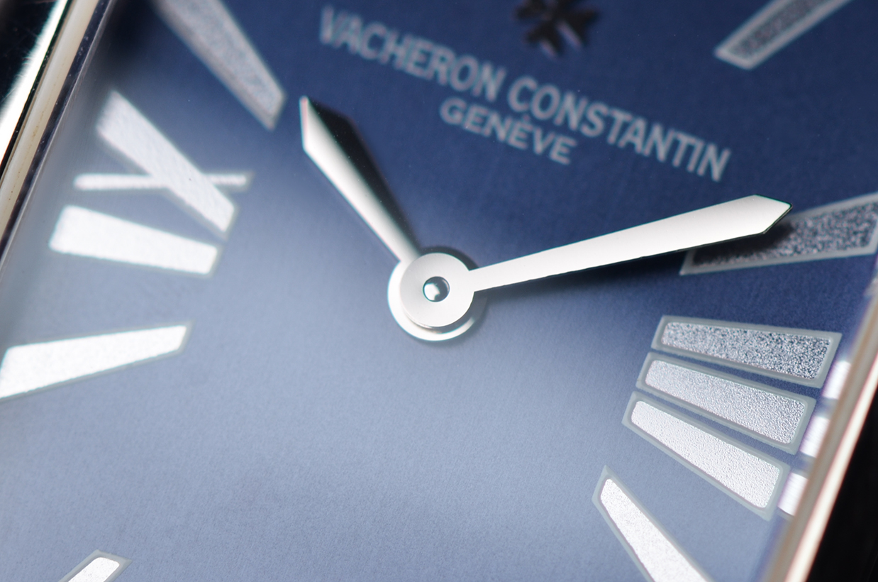表盘:立体蓝色表盘,罗马数字刻度,白金指针