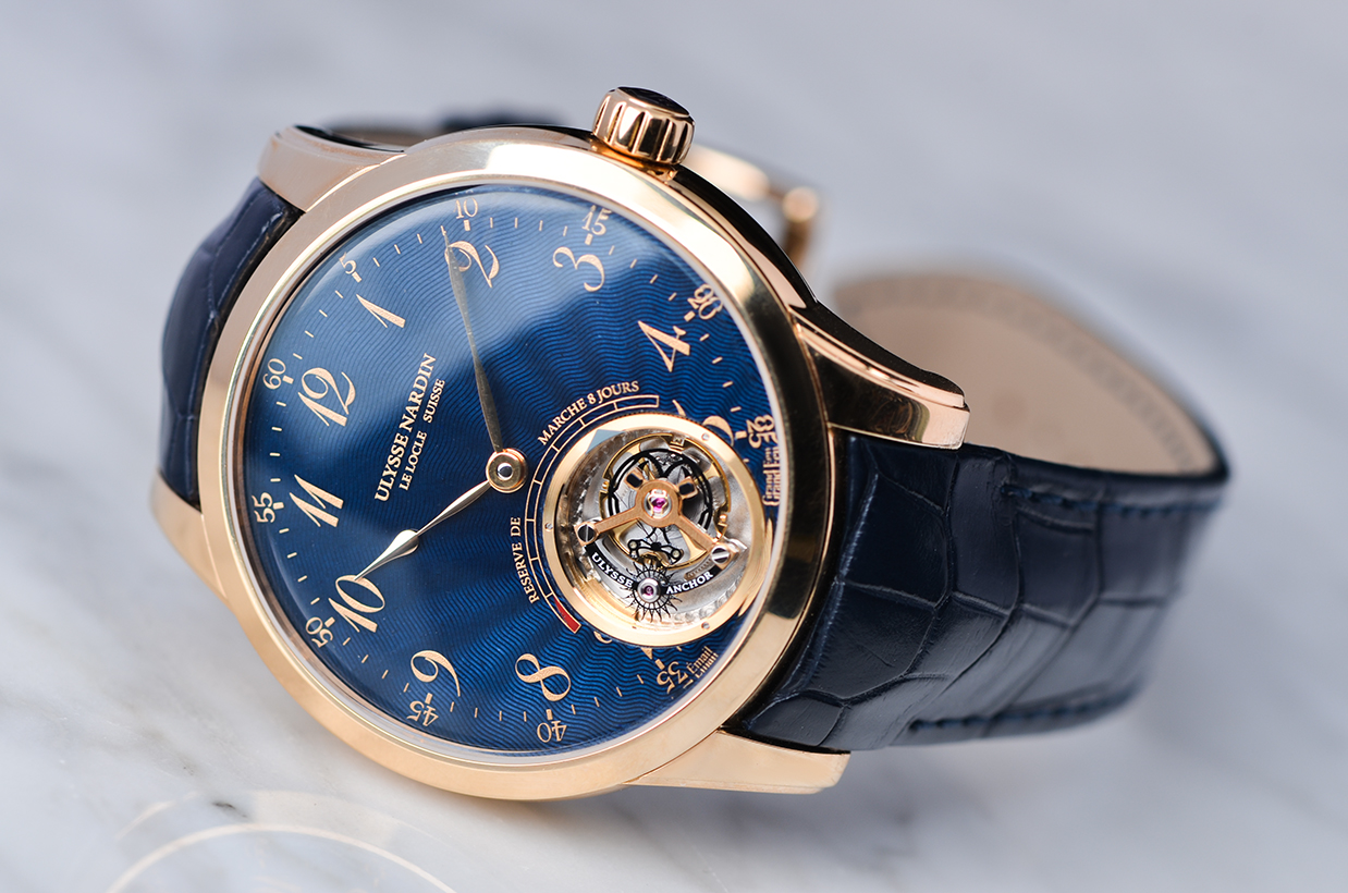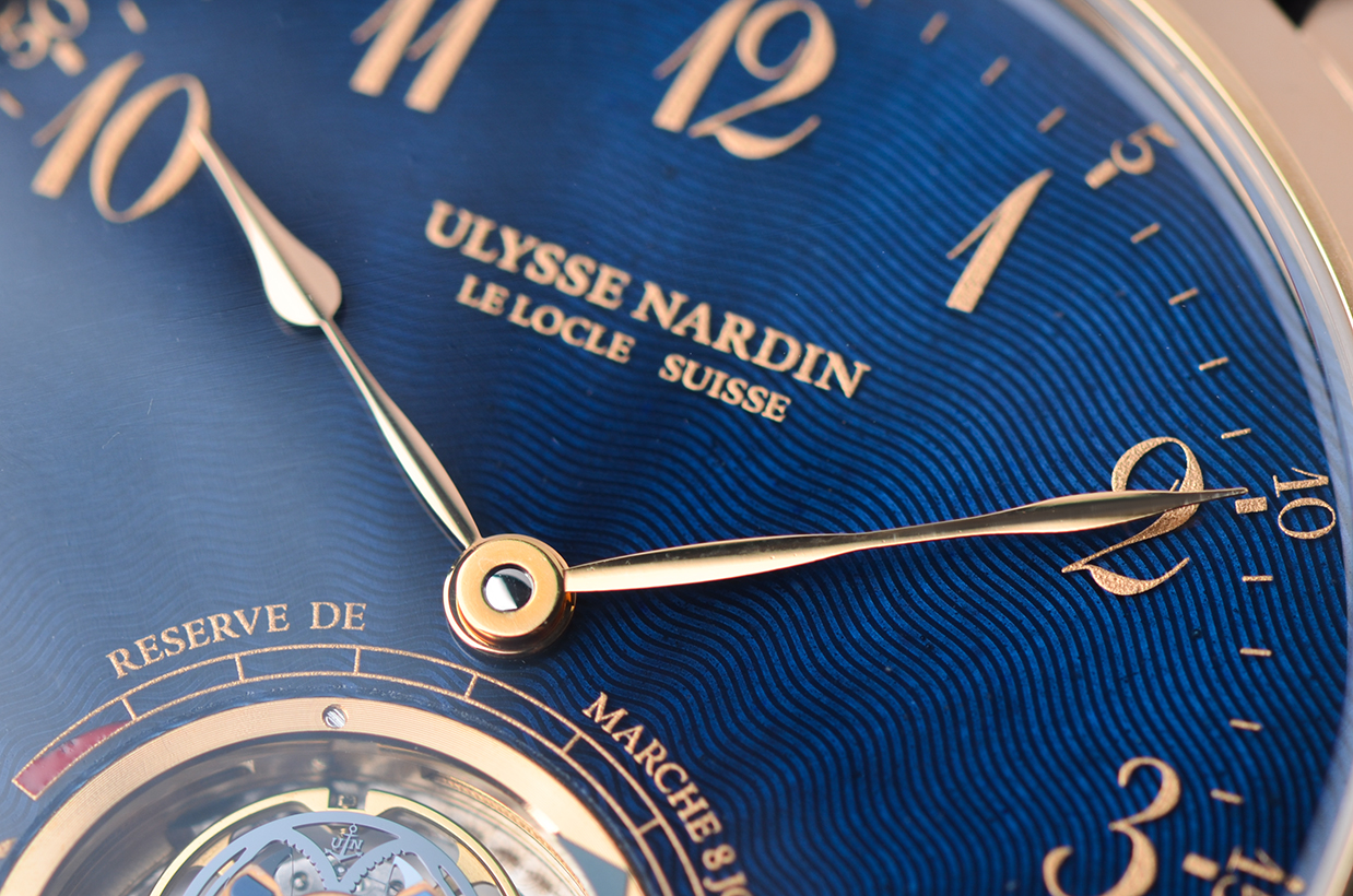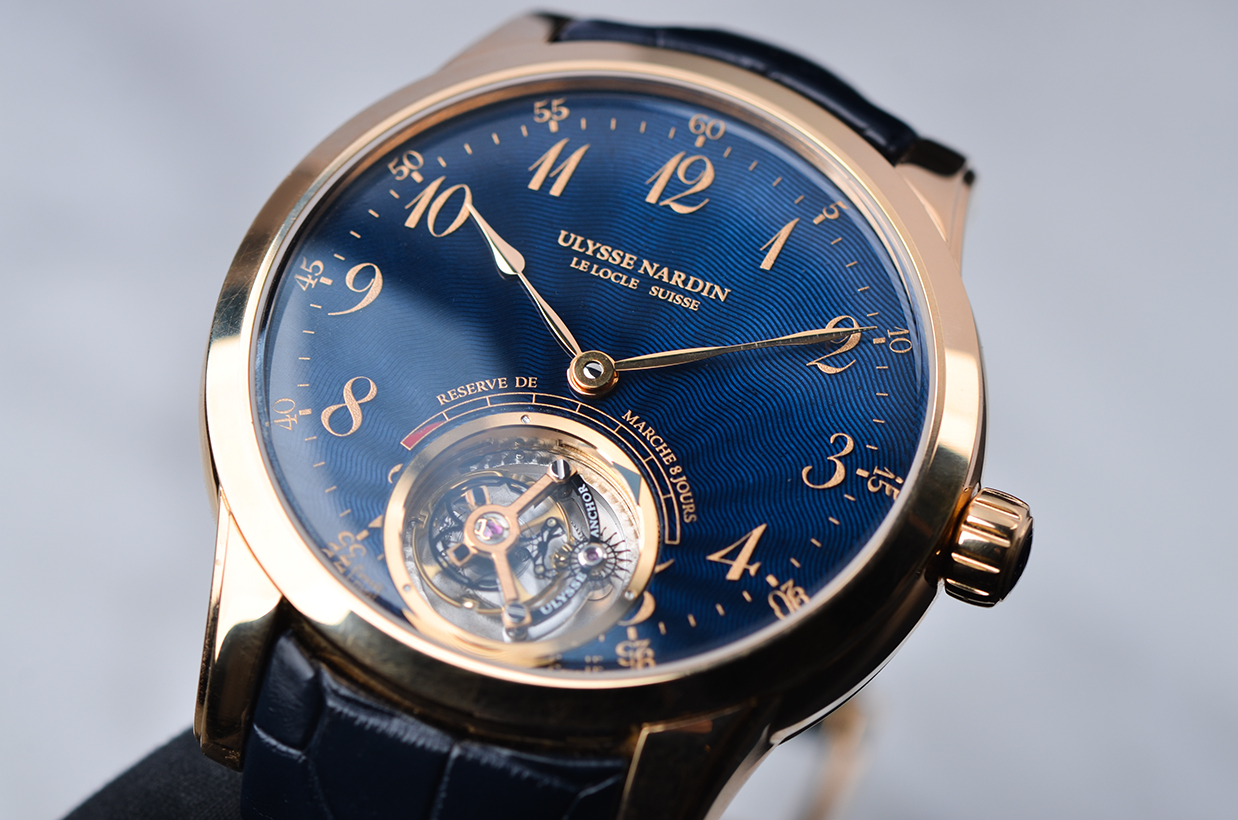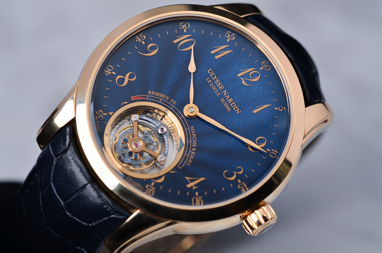 表盘:立体蓝色波浪纹大明火珐琅表盘,阿拉伯数字刻度,玫瑰金指针,陀飞轮装置