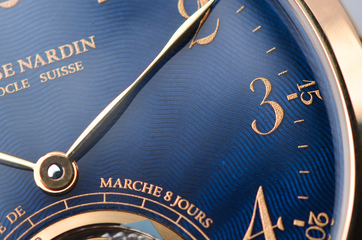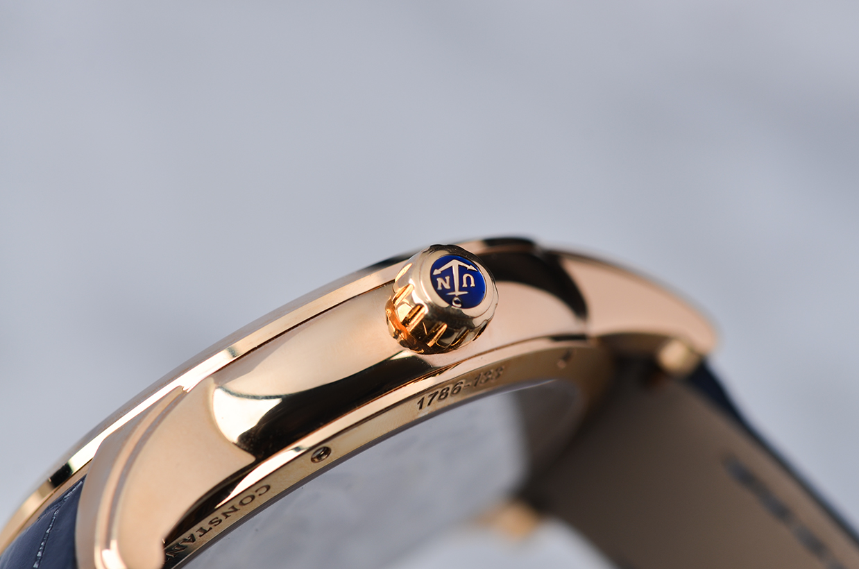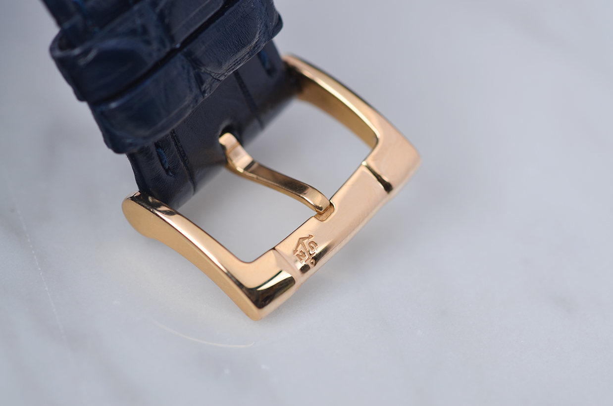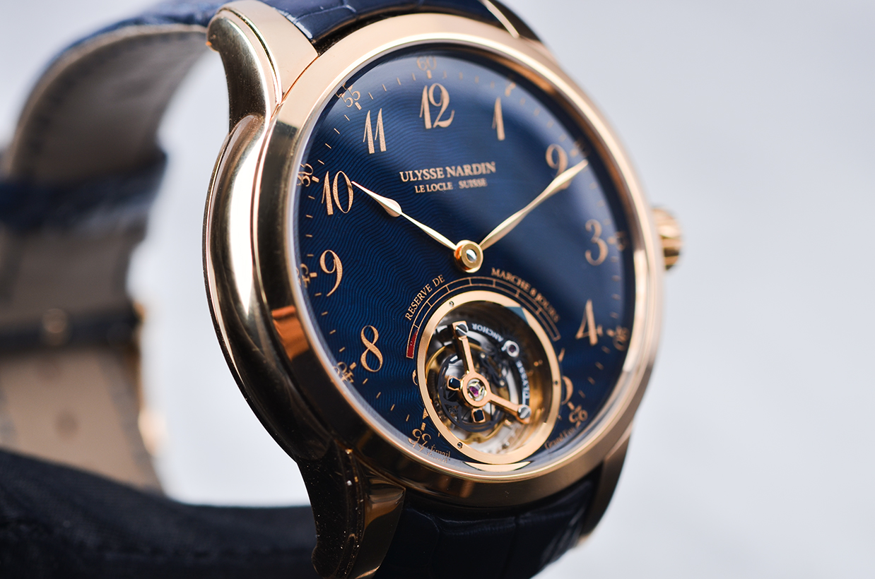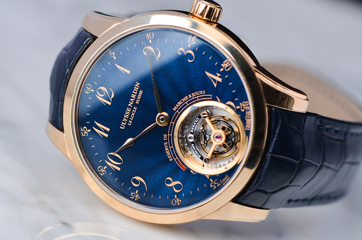 表盘:立体蓝色波浪纹大明火珐琅表盘,阿拉伯数字刻度,玫瑰金指针,陀飞轮装置