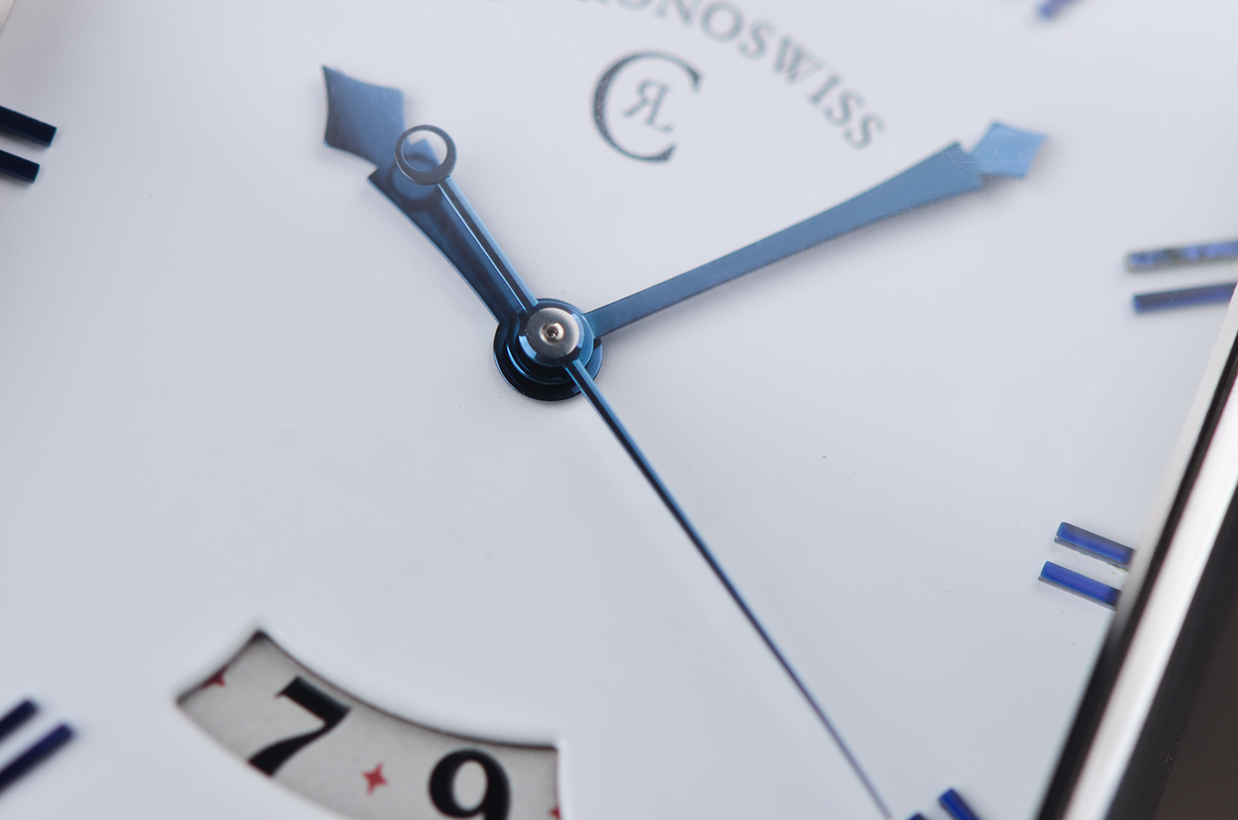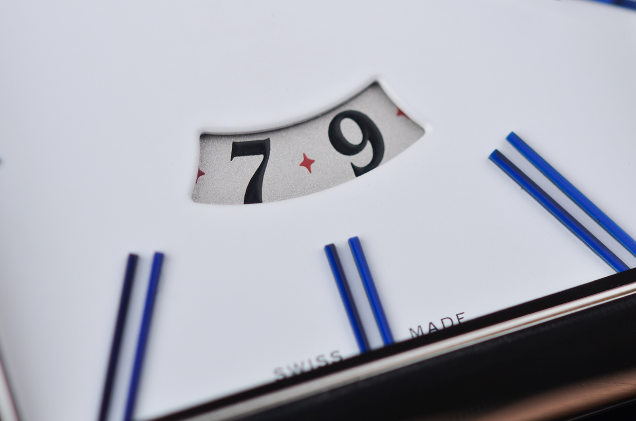 表盘:立体白色表盘,蓝钢刻度及指针,大日历窗口