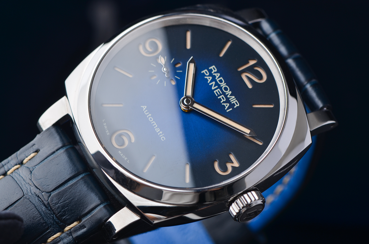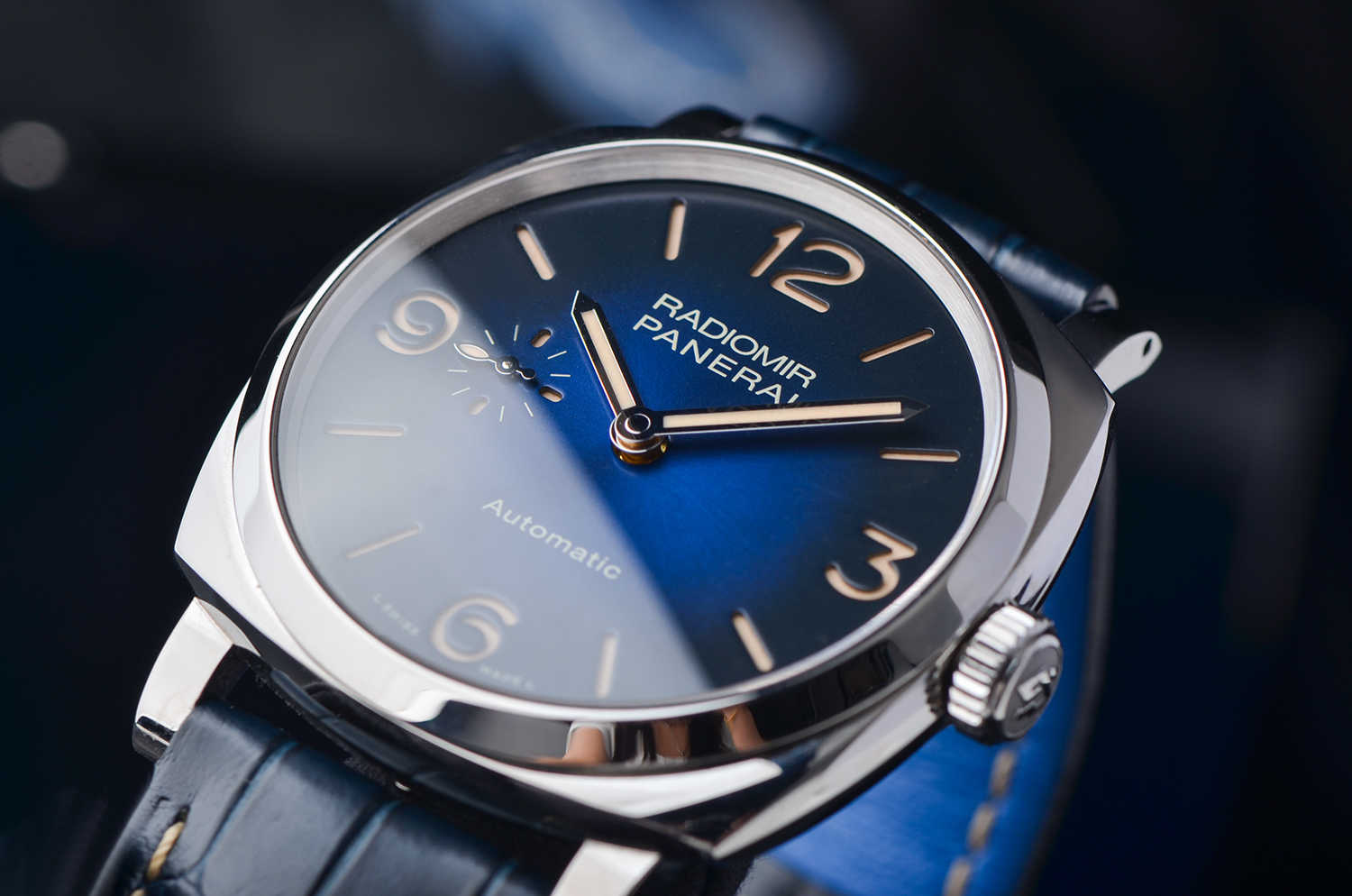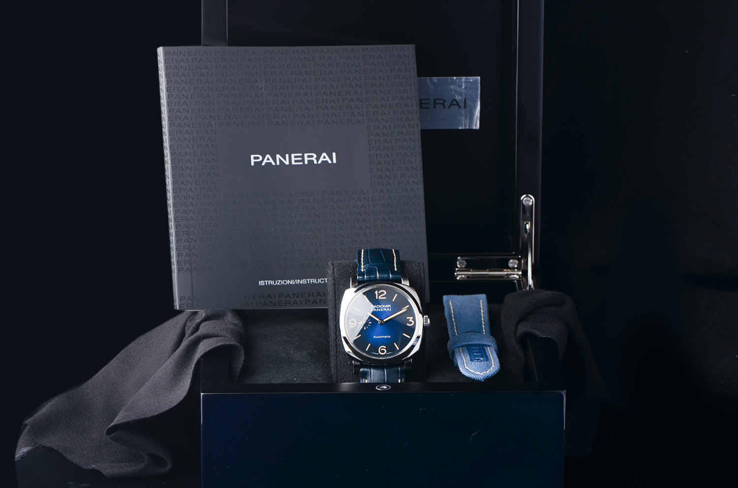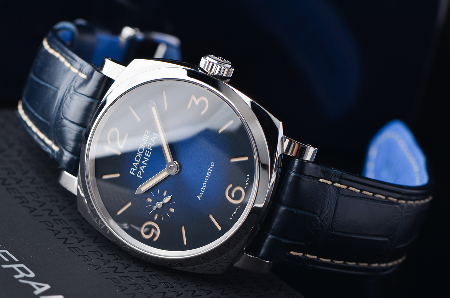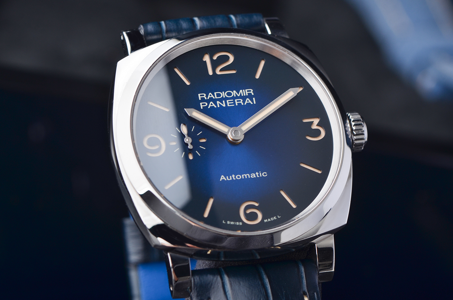 灵感源自深邃的地中海,沛纳海 PAM00933 以独特的渐变蓝色表盘,诠释出海洋般的光影变化。42 毫米抛光不锈钢表壳,搭配经典的 Radiomir 1940 枕形设计,既大气又优雅。