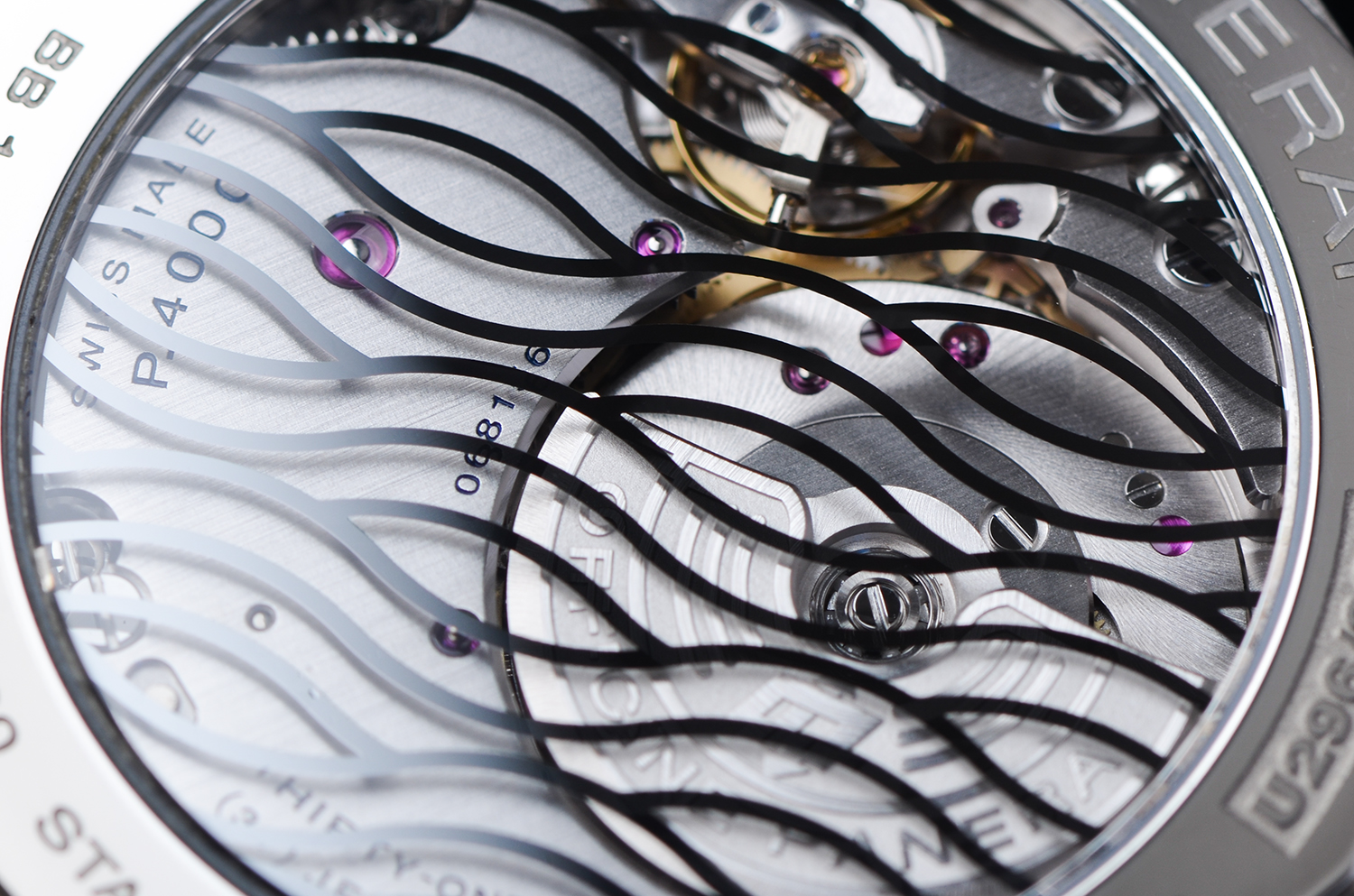 腕表内部搭载品牌自制 P.4000 自动上链机芯,配备偏心微型摆陀,提供长达 72 小时动力储备,透过蓝宝石透明底盖即可欣赏精密机芯的运转之美。9 点位置的小秒盘设计,低调而富有层次感。
