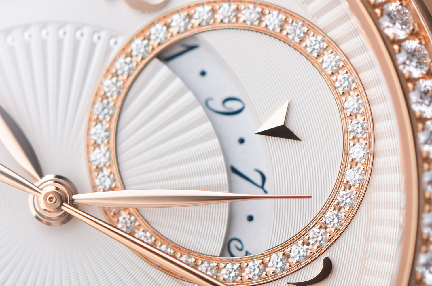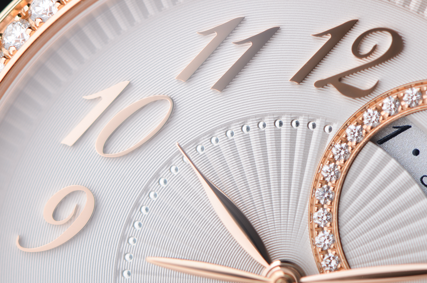 表盘:立体白色表盘,玫瑰金阿拉伯数字刻度及指针,日历显示圆环镶嵌共计34颗天然美钻