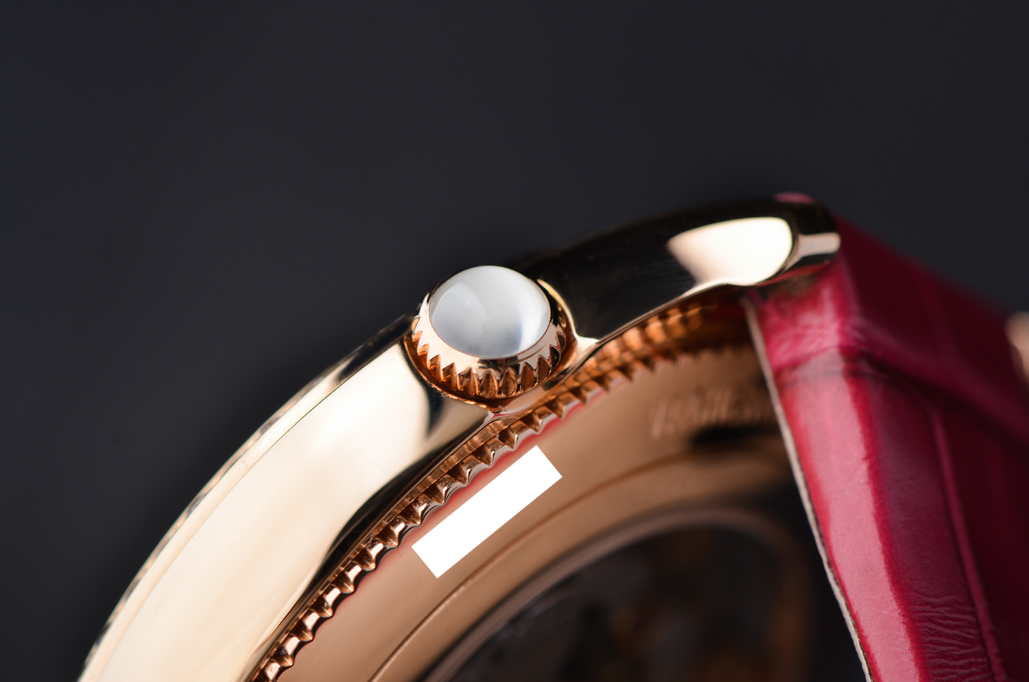 表壳:18K玫瑰金表壳及表扣,表框原厂镶嵌58颗天然美钻,表冠镶嵌一颗月光石