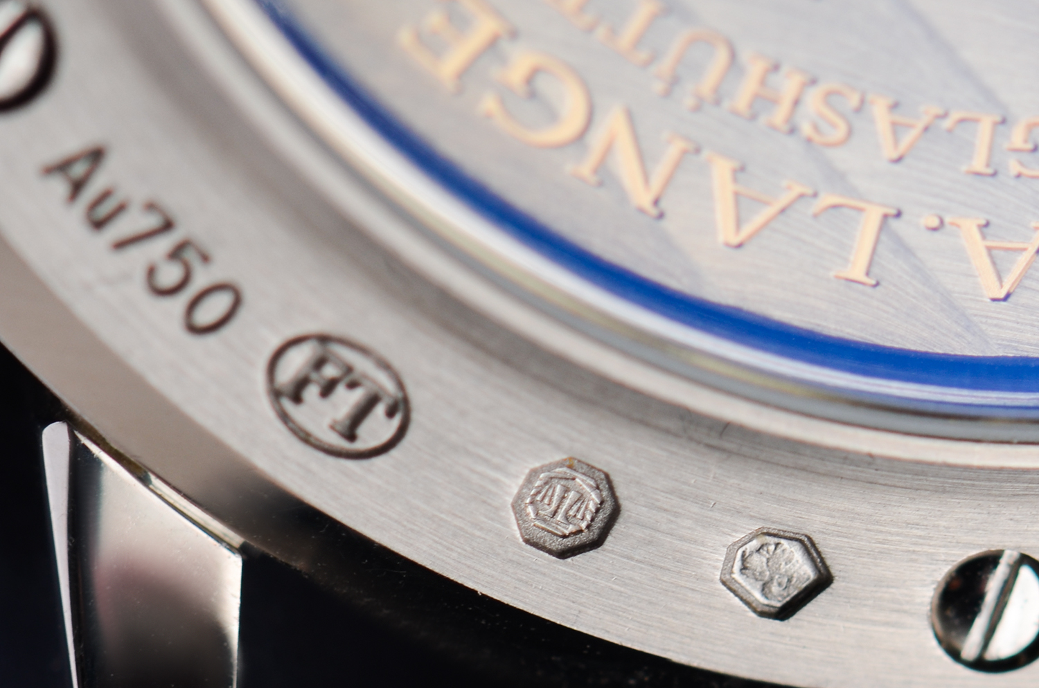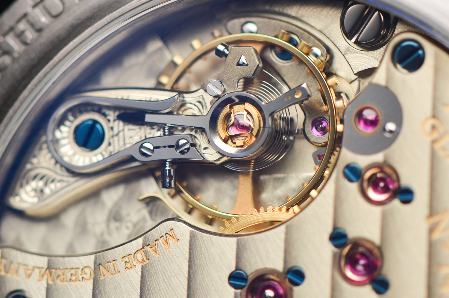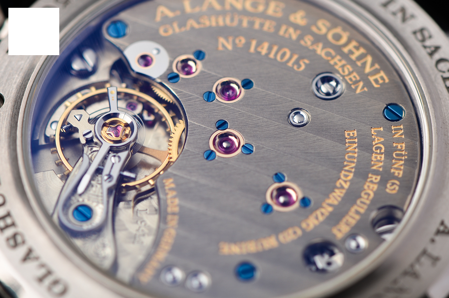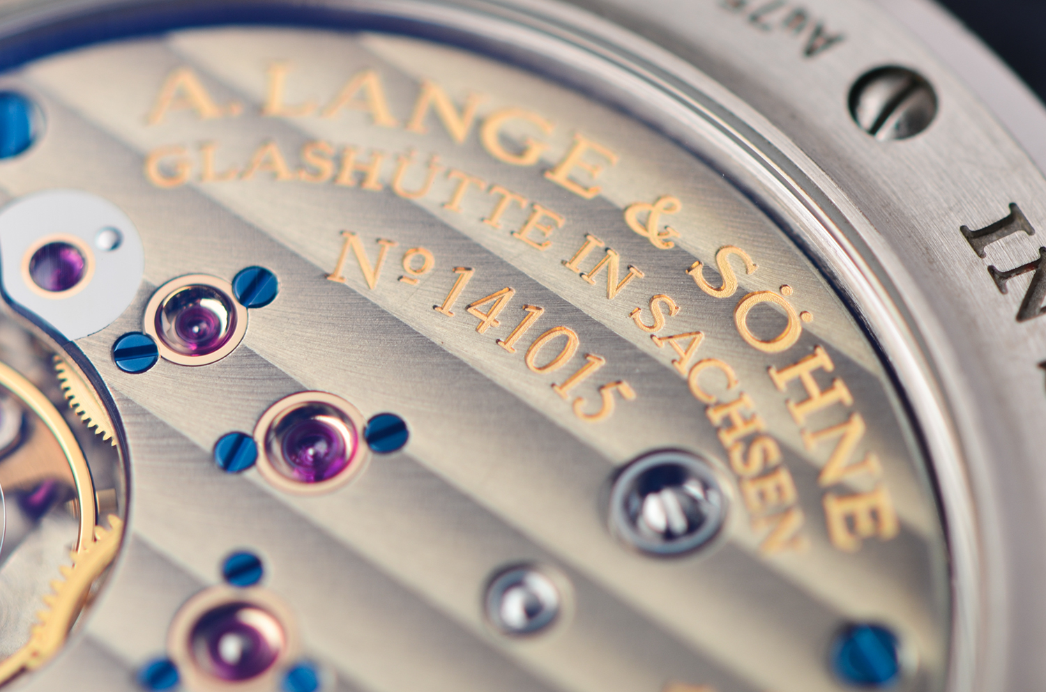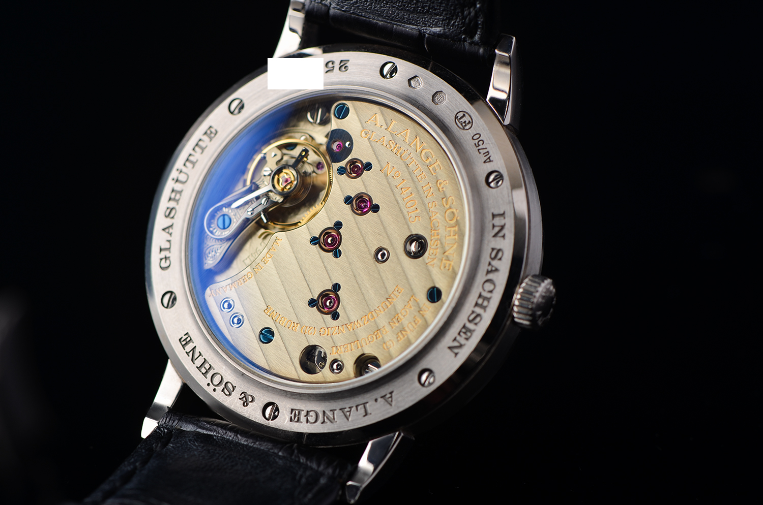 透过蓝宝石底盖,可见朗格自制 L941.1 手动上链机芯——三四分之三夹板、金套筒螺钉、手工雕刻摆轮夹板……