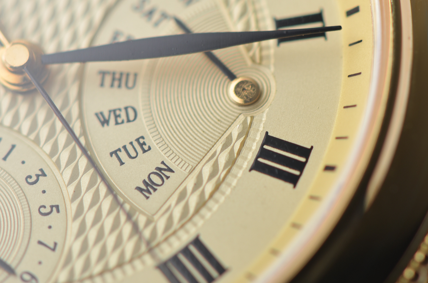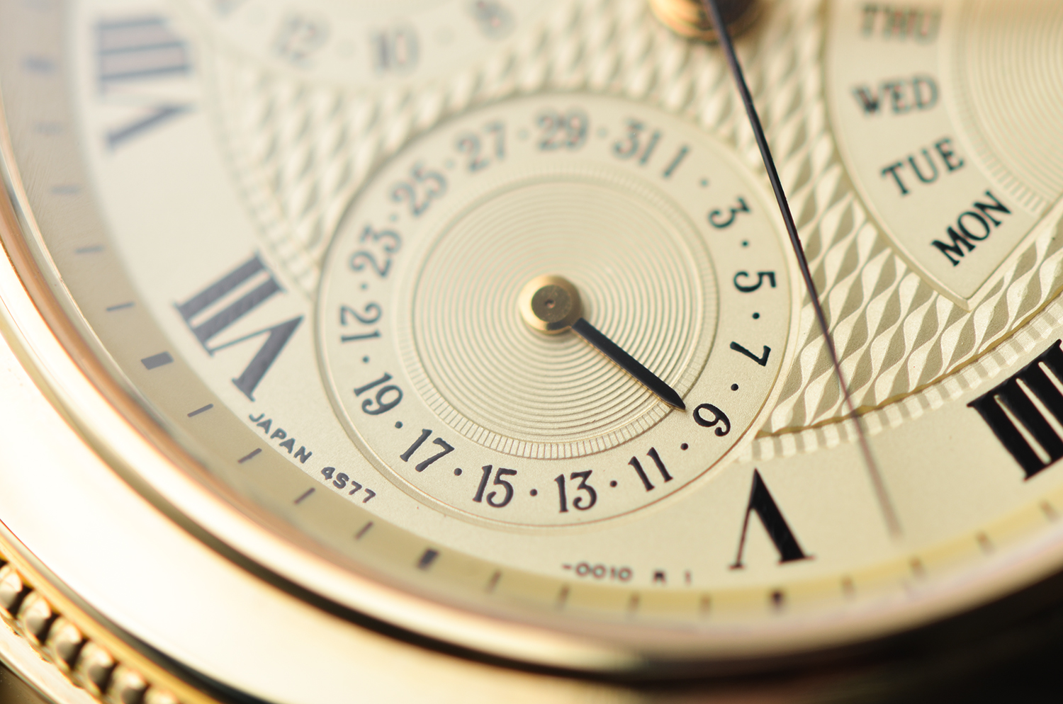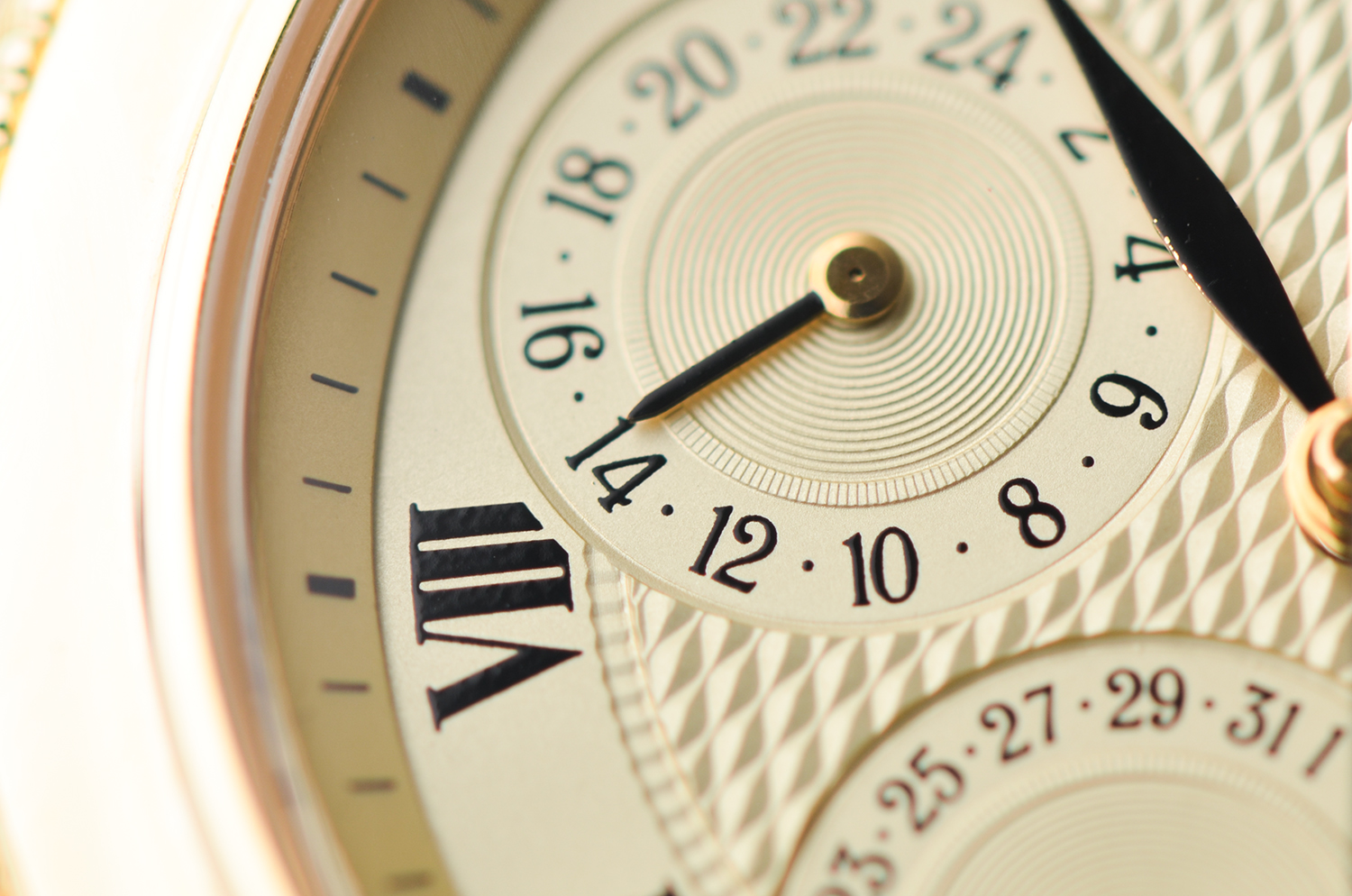 表盘:立体香槟色镌刻表盘,罗马数字刻度,指针日历,星期逆跳,第二时区显示