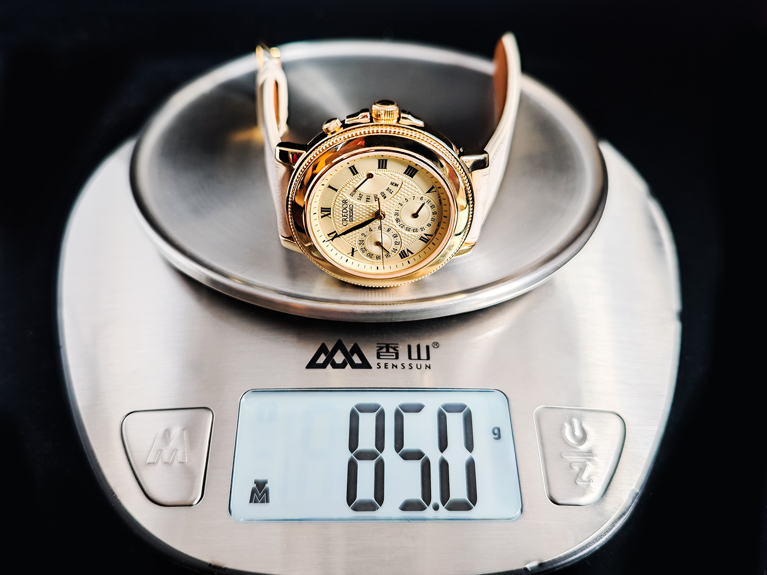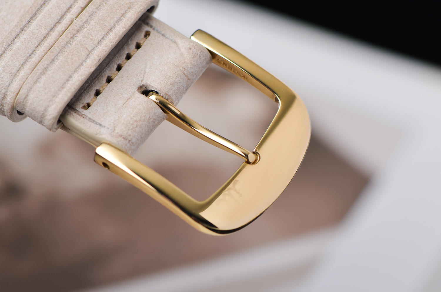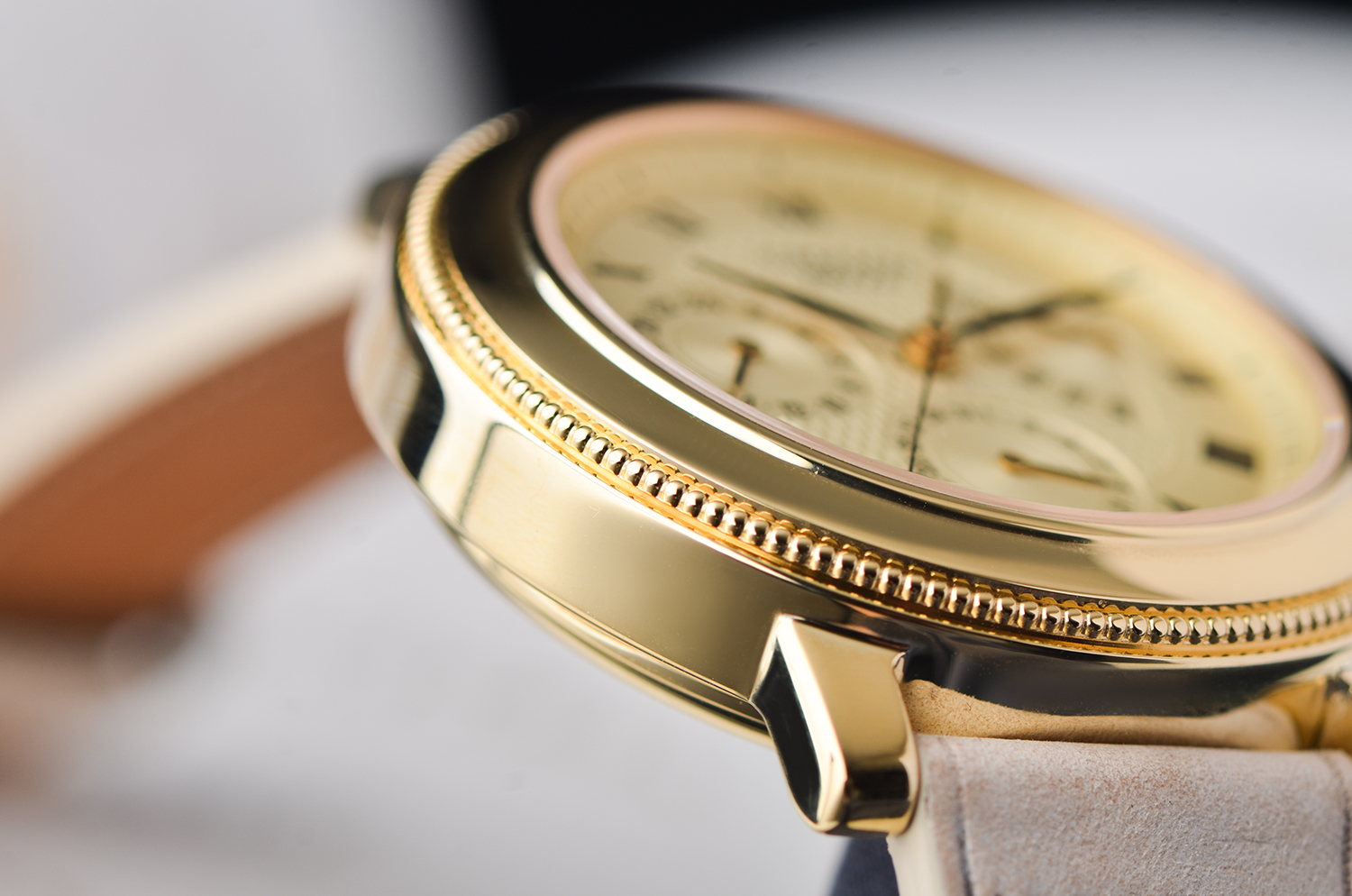 表壳以 K18黄金打造,温润光泽与细腻的倒角相互映衬,配合立体雕纹香槟色表盘与罗马数字时标,优雅之中散发深厚气韵。三枚功能子盘布局对称: