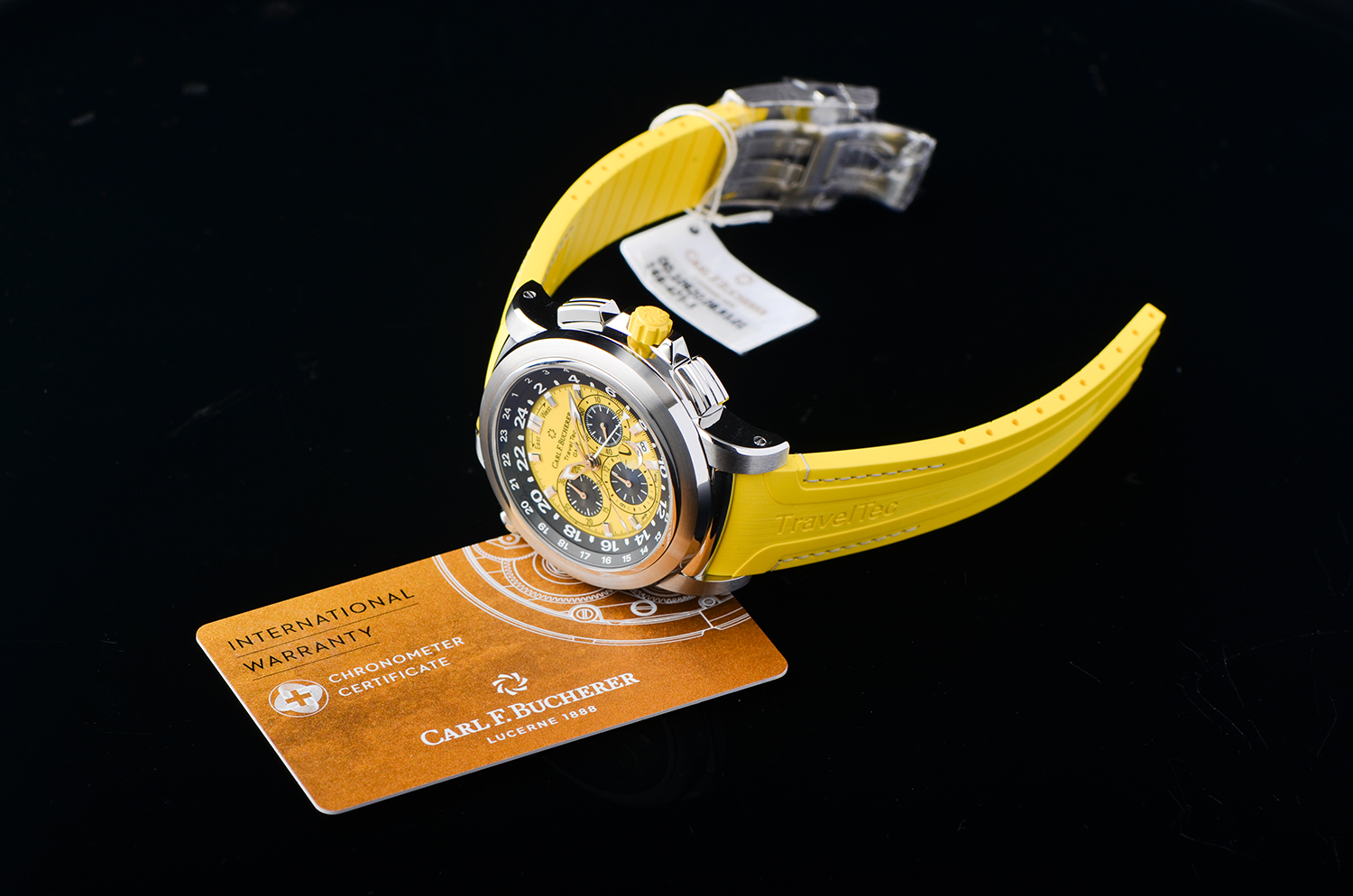 这枚腕表以坚固的不锈钢表壳(46.6 mm) 搭配醒目的黄色表盘与橡胶表带,视觉冲击力十足。内部搭载宝齐莱自制 CFB 1901.1 自动计时机芯,通过 COSC 瑞士官方天文台认证,精准可靠,动力储备约 42 小时。