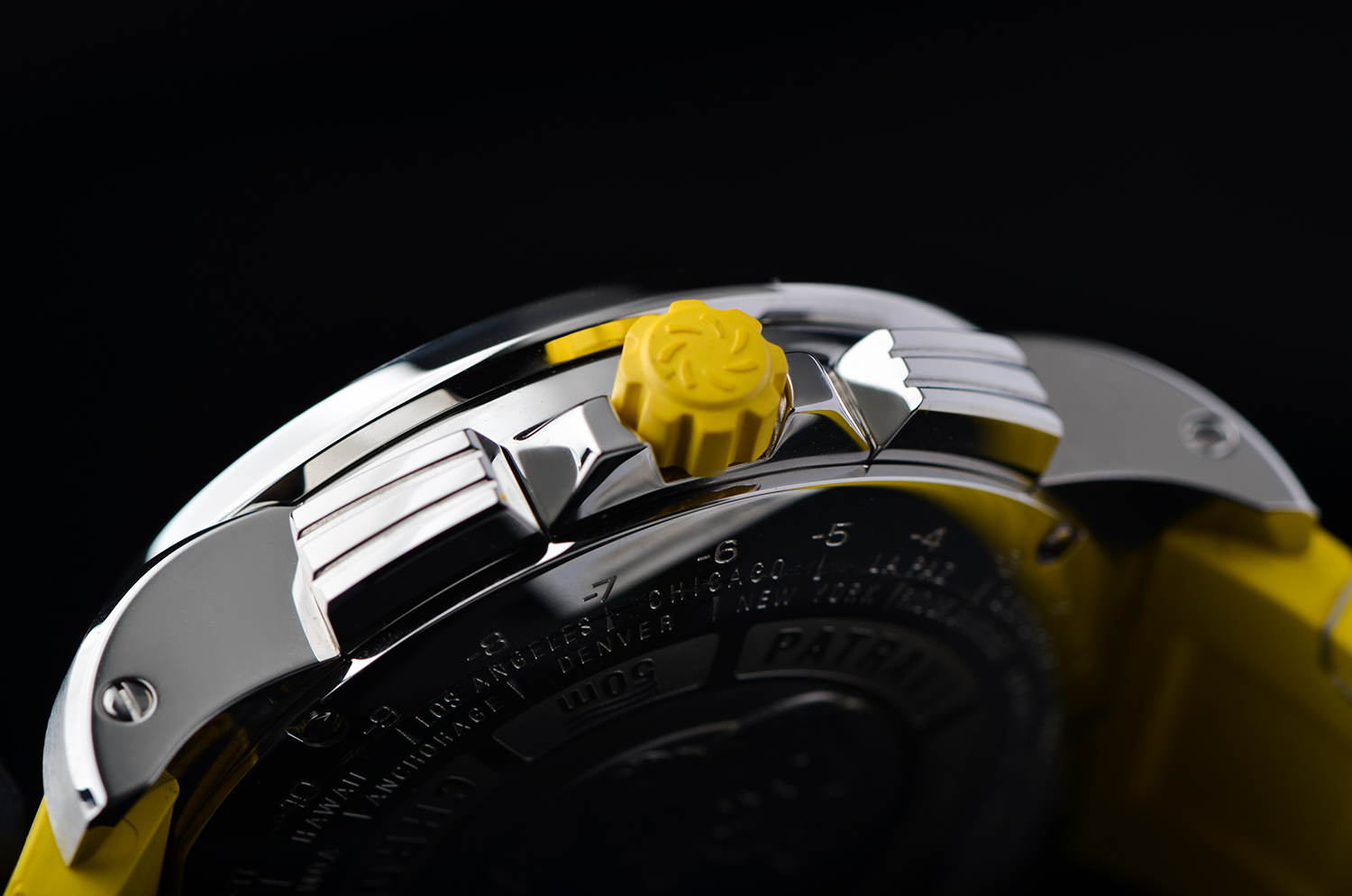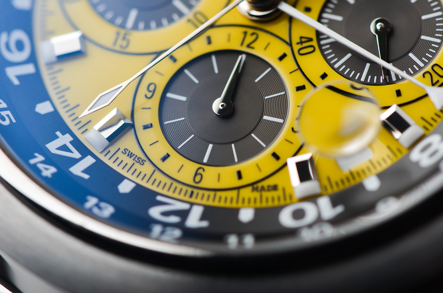 表盘:立体黄黑双色计时表盘,可旋转表内圈,夜光刻度及指针,放大镜日历