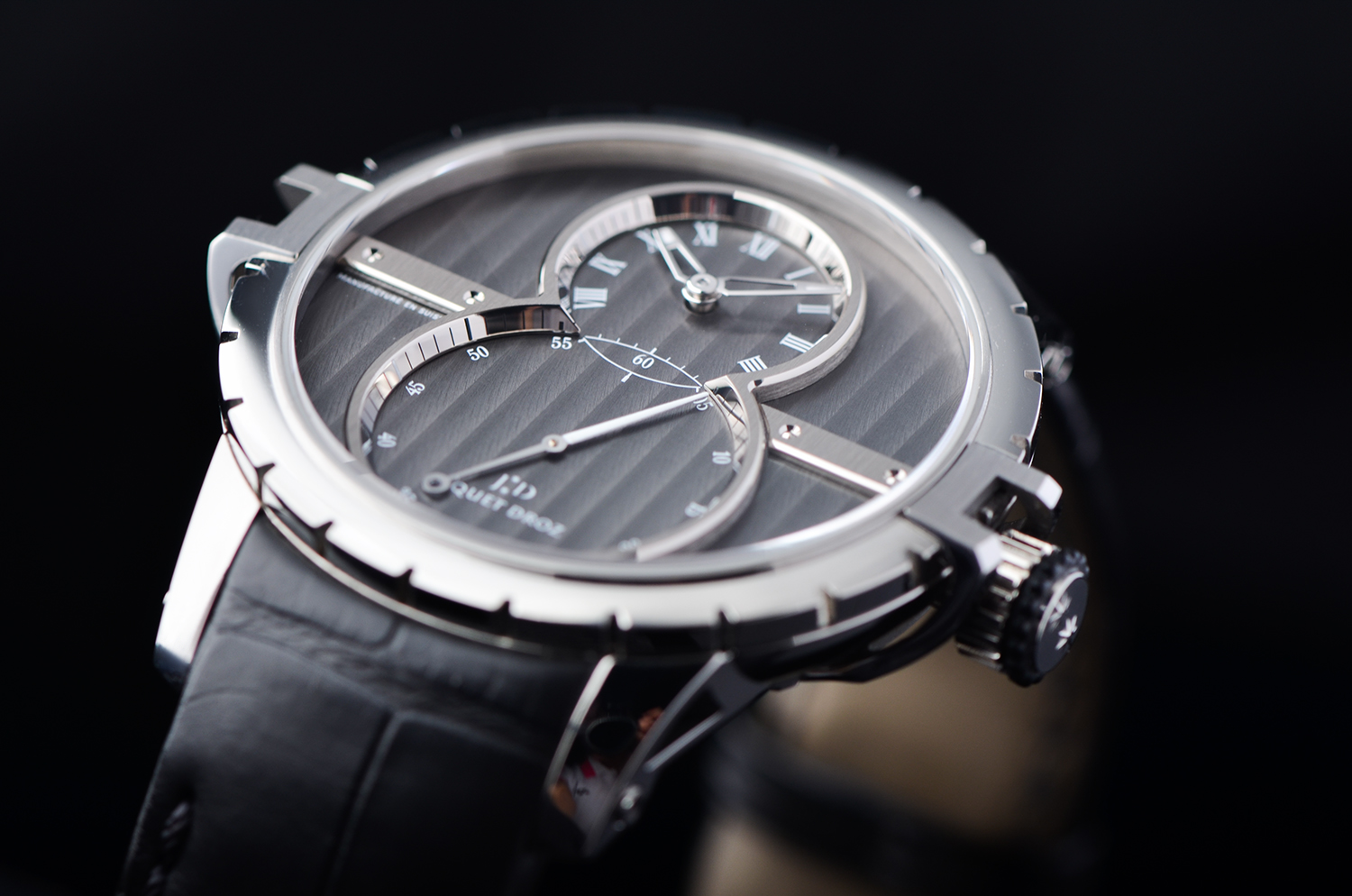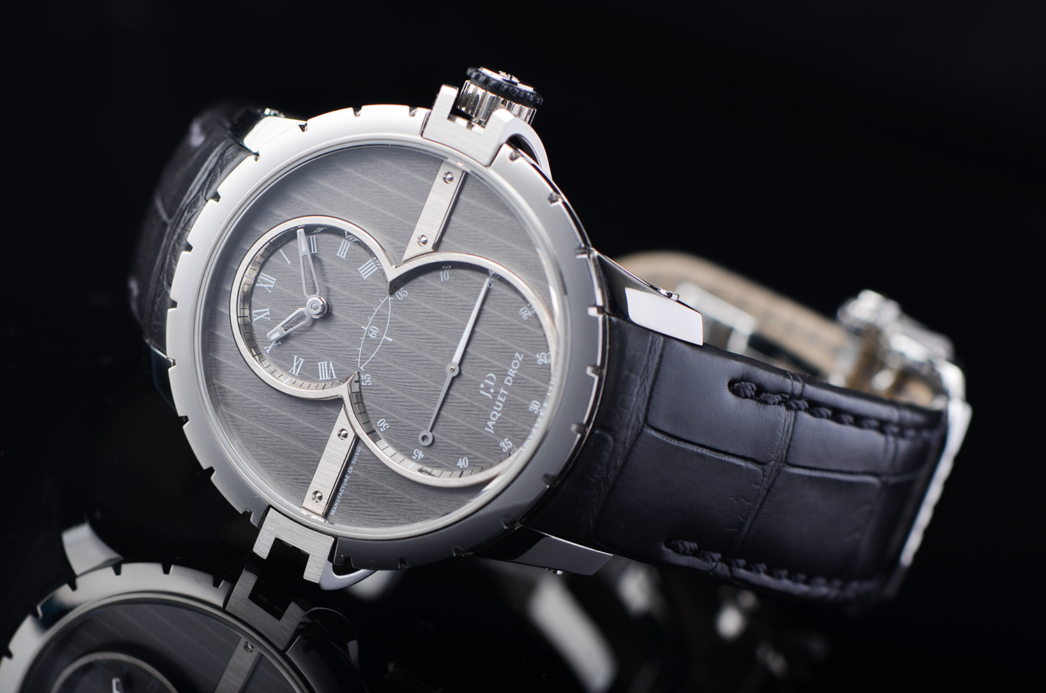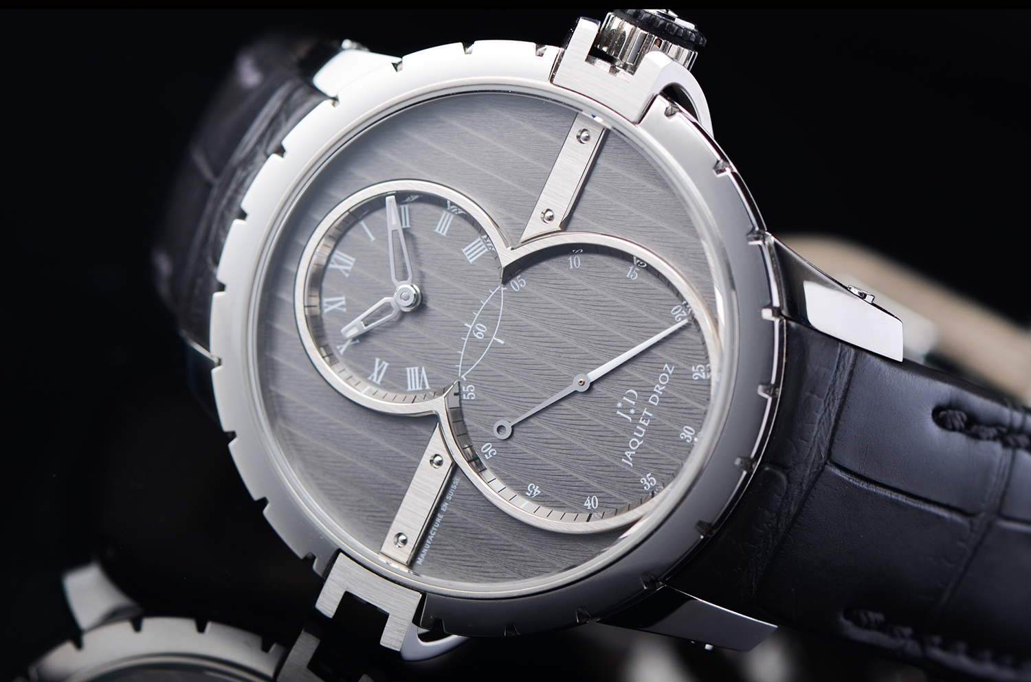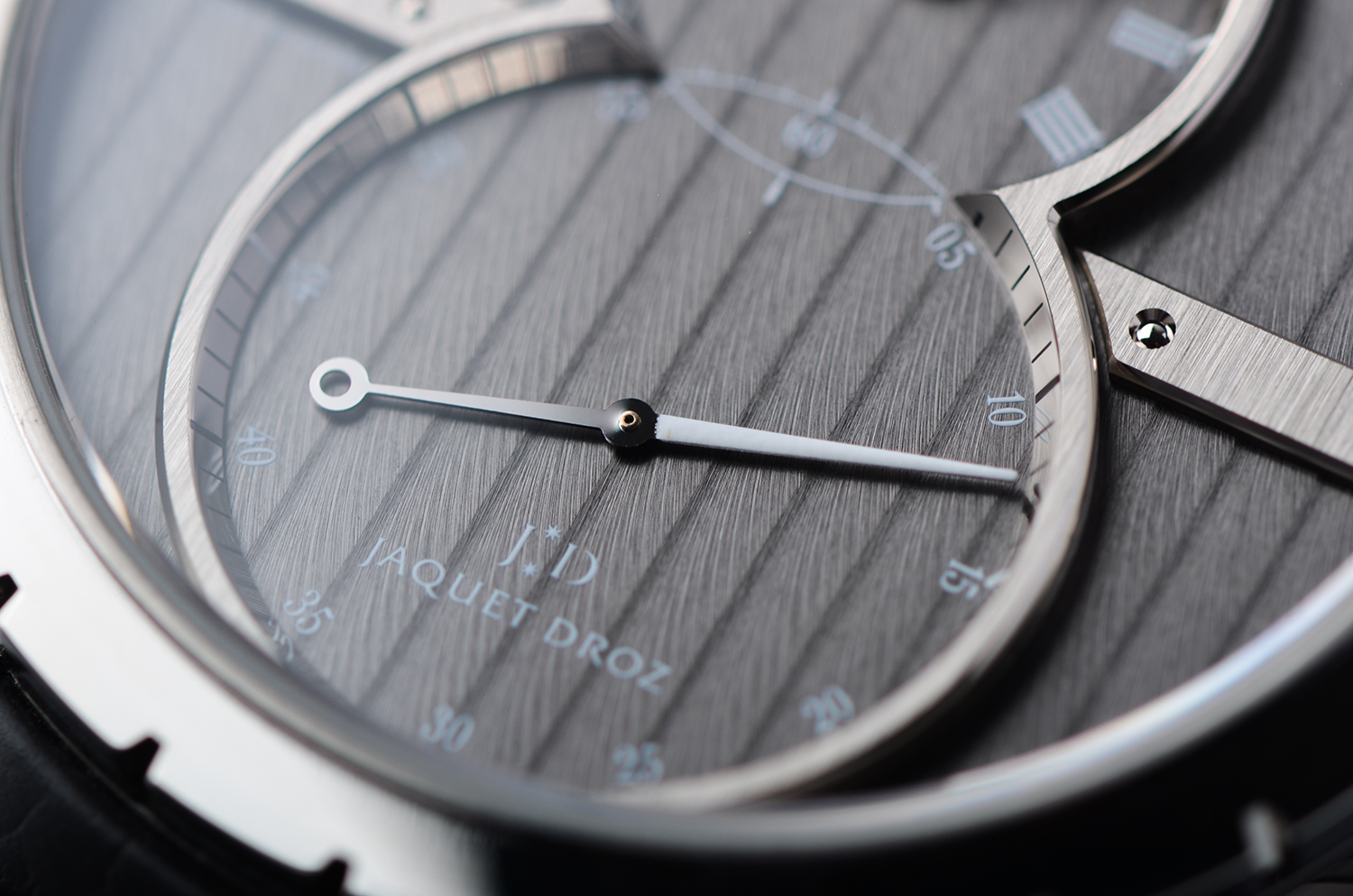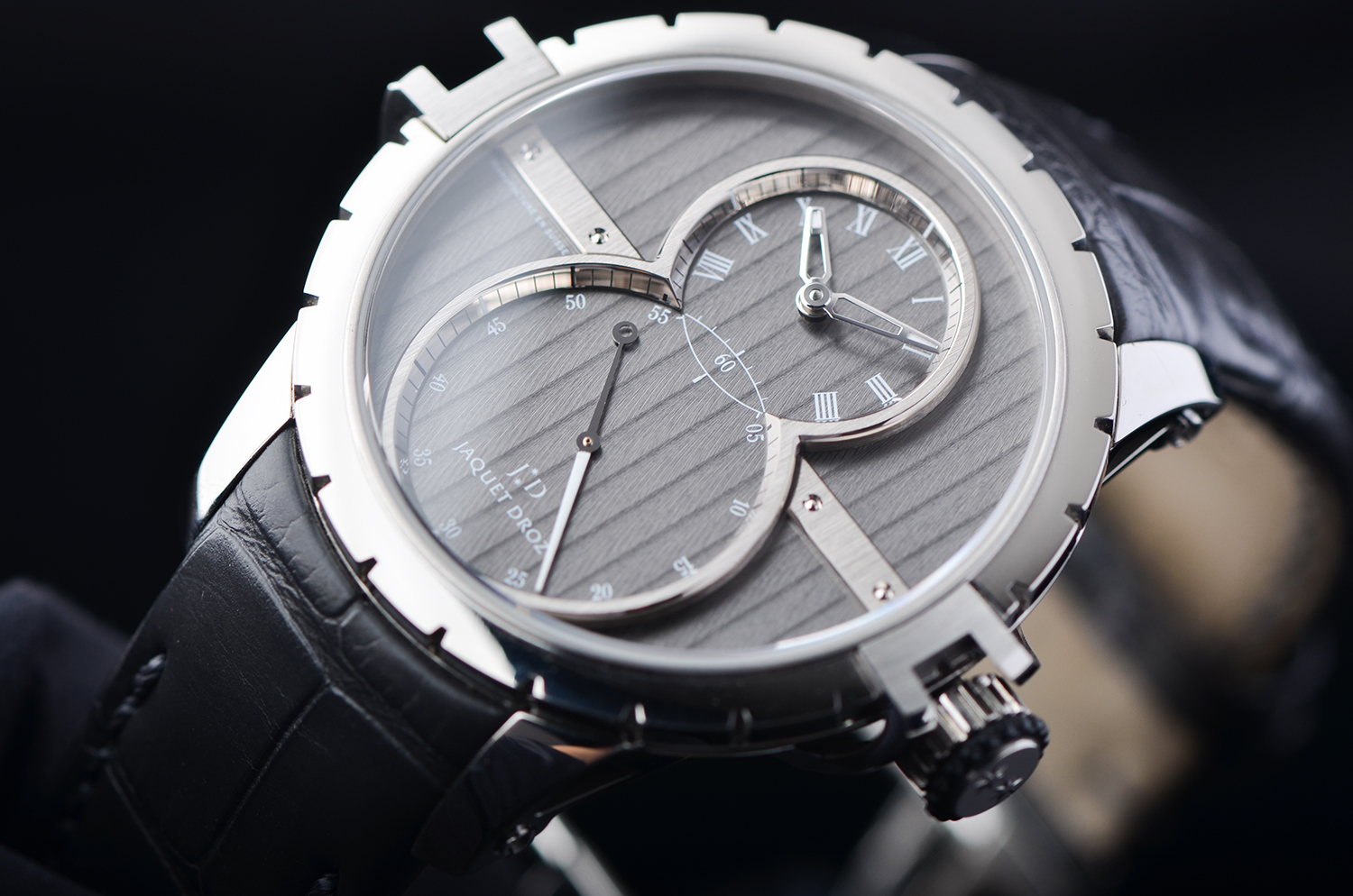 上下双盘布局 —— 上为时分盘,下为大秒针盘,构成雅克德罗标志性的“无尽符号 ∞”;