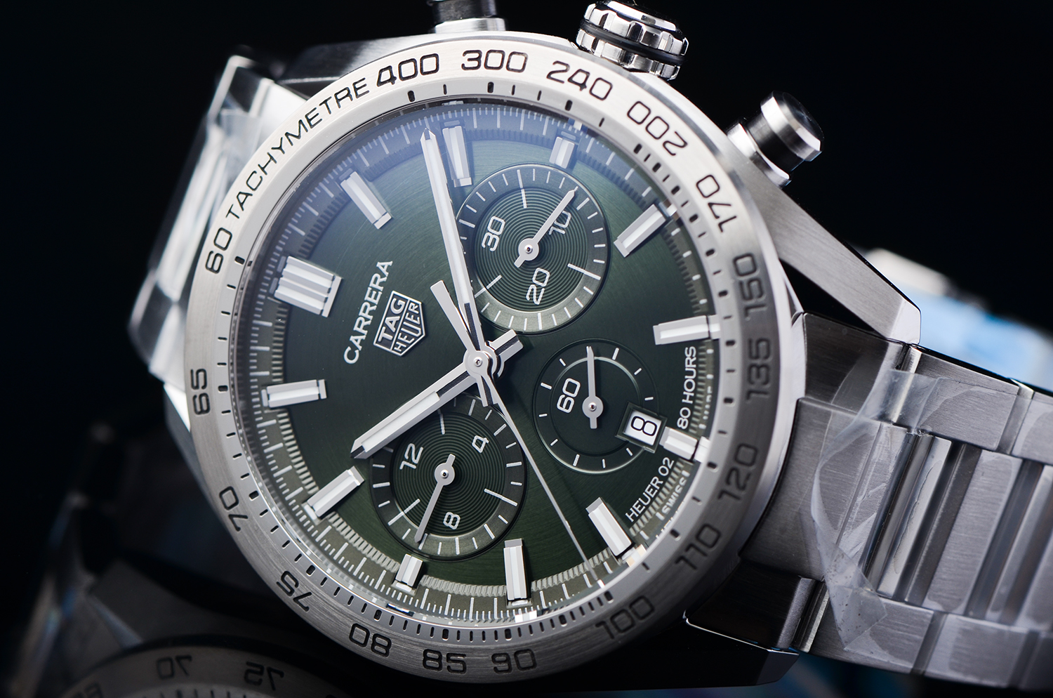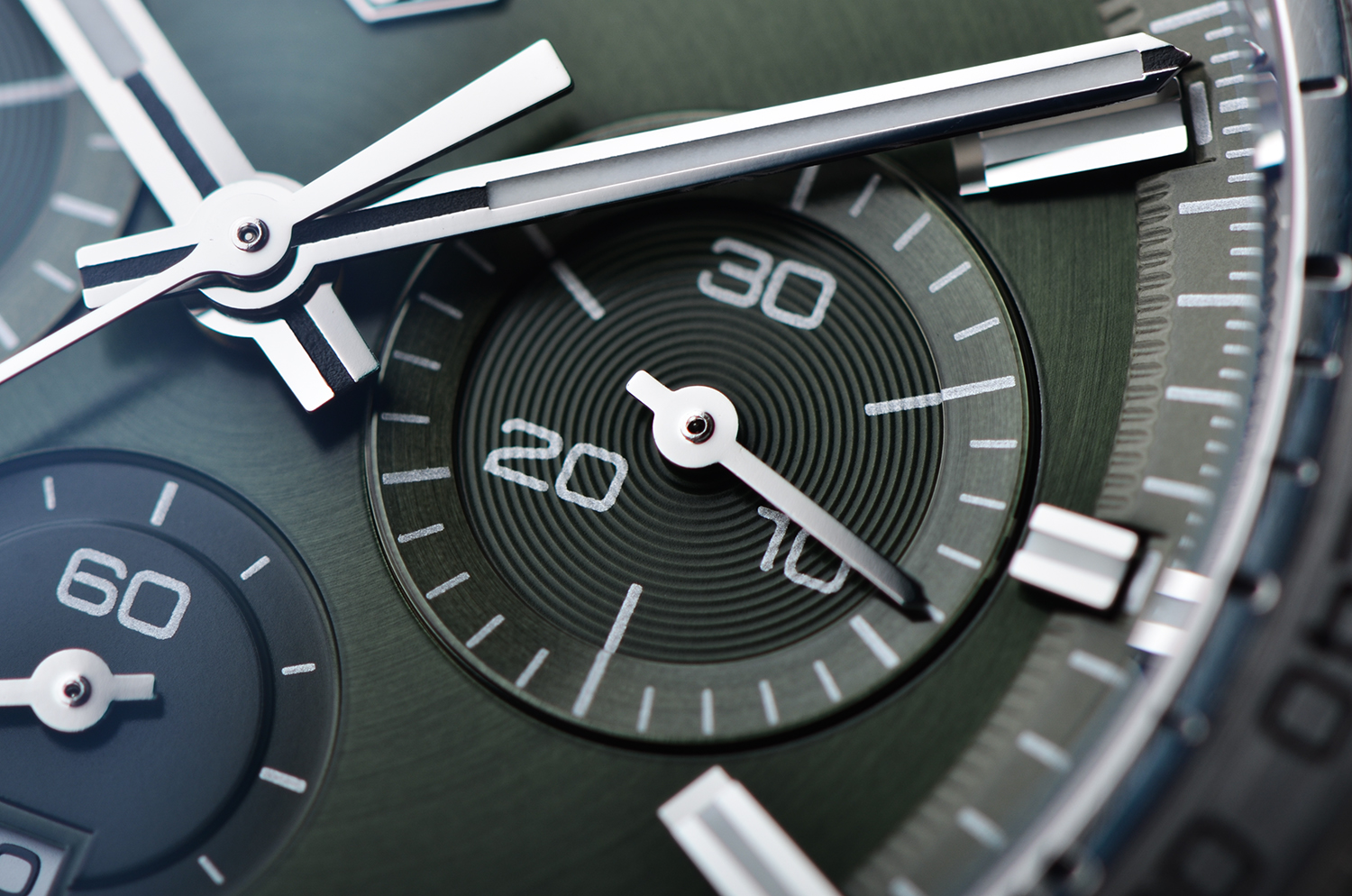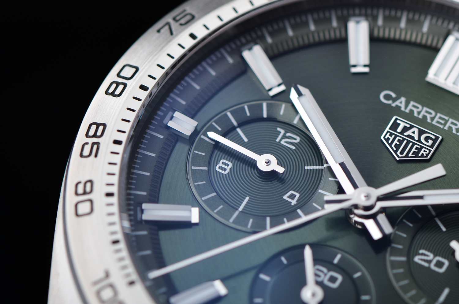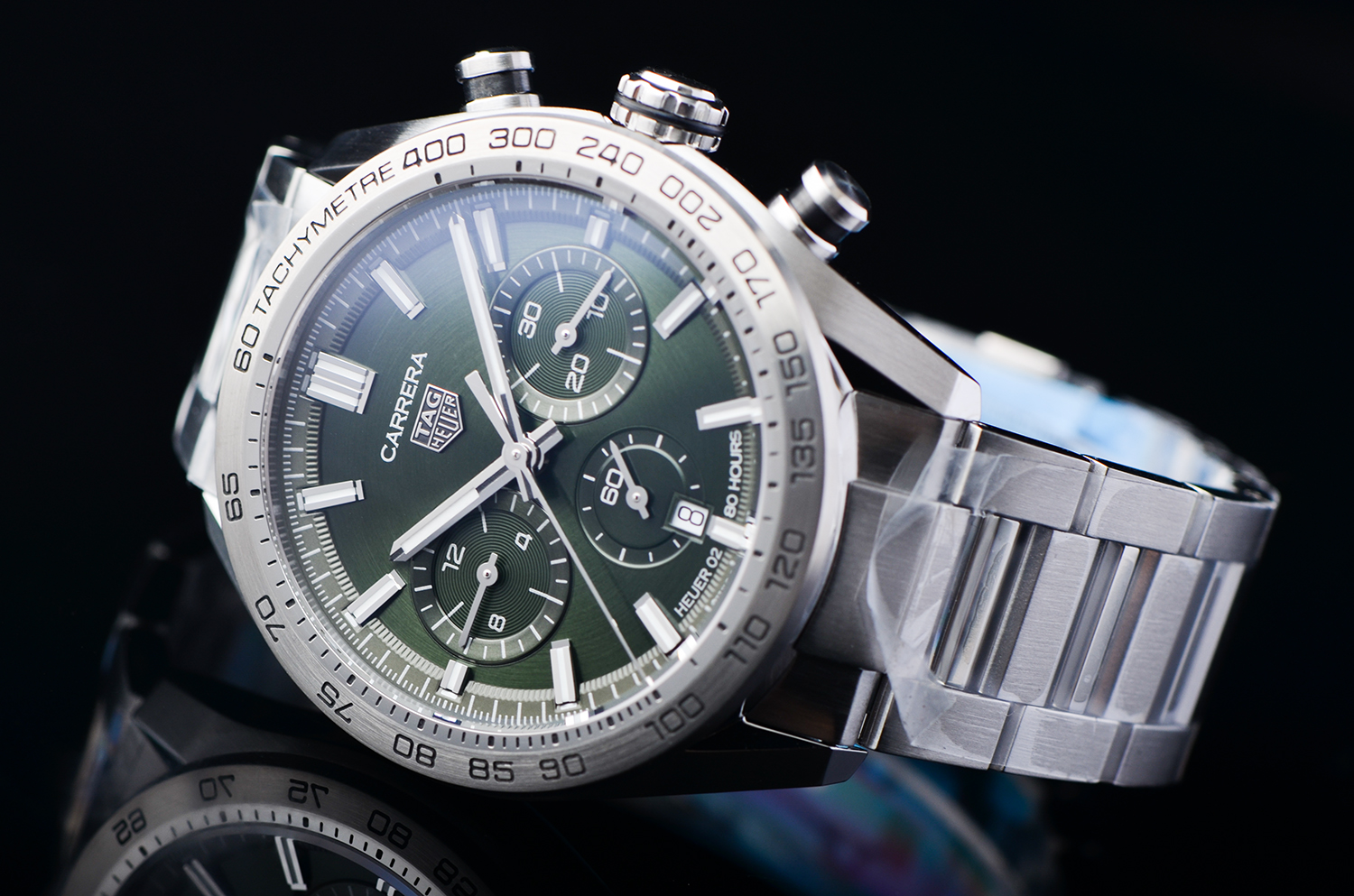 ✨ 绿色拉丝表盘 —— 独特赛车绿于光线下流转变幻,深邃而不张扬。