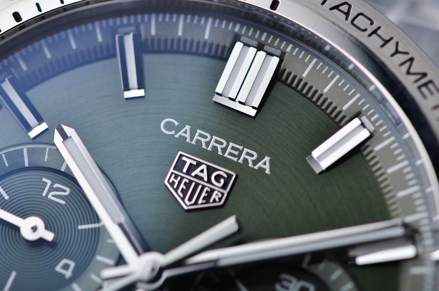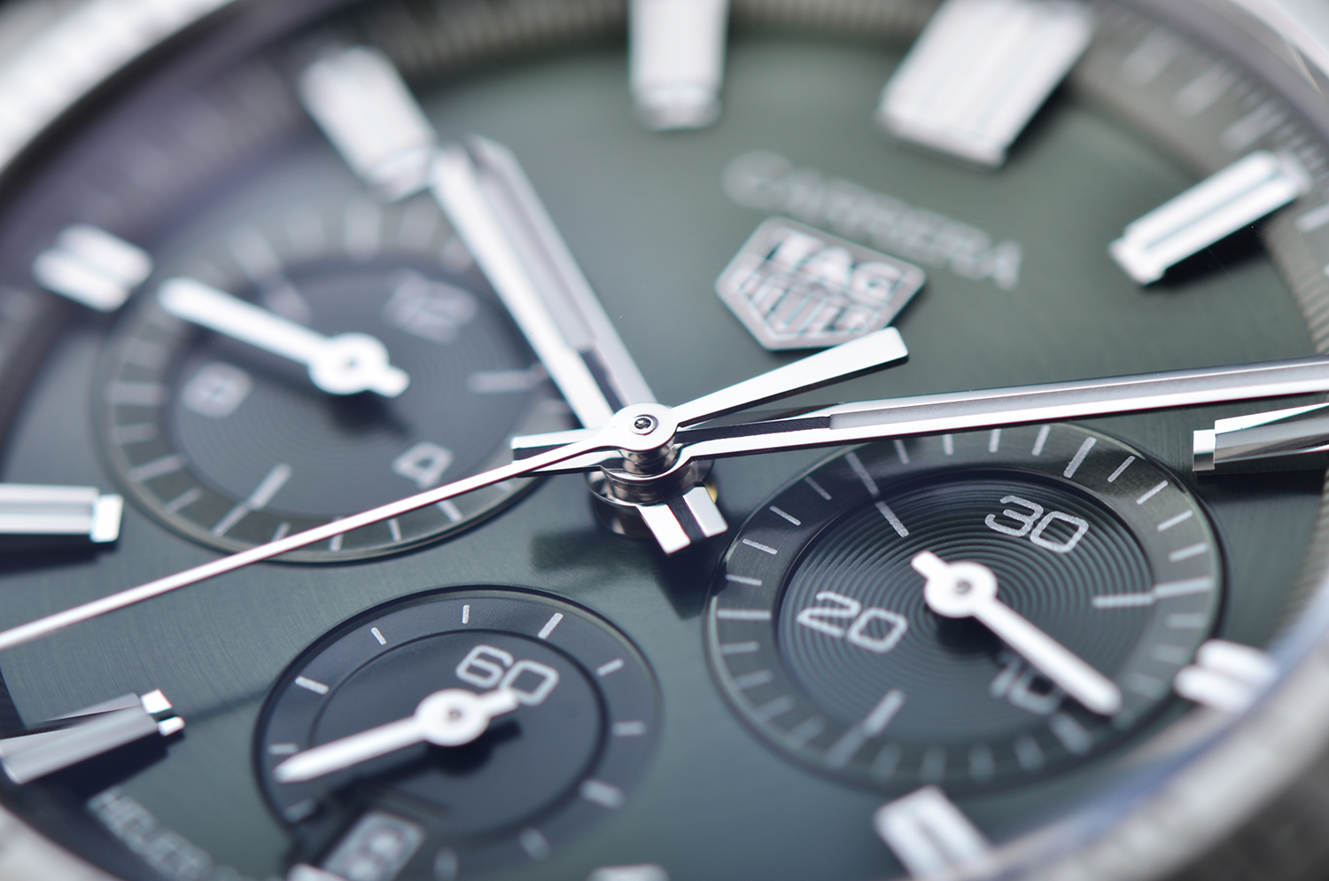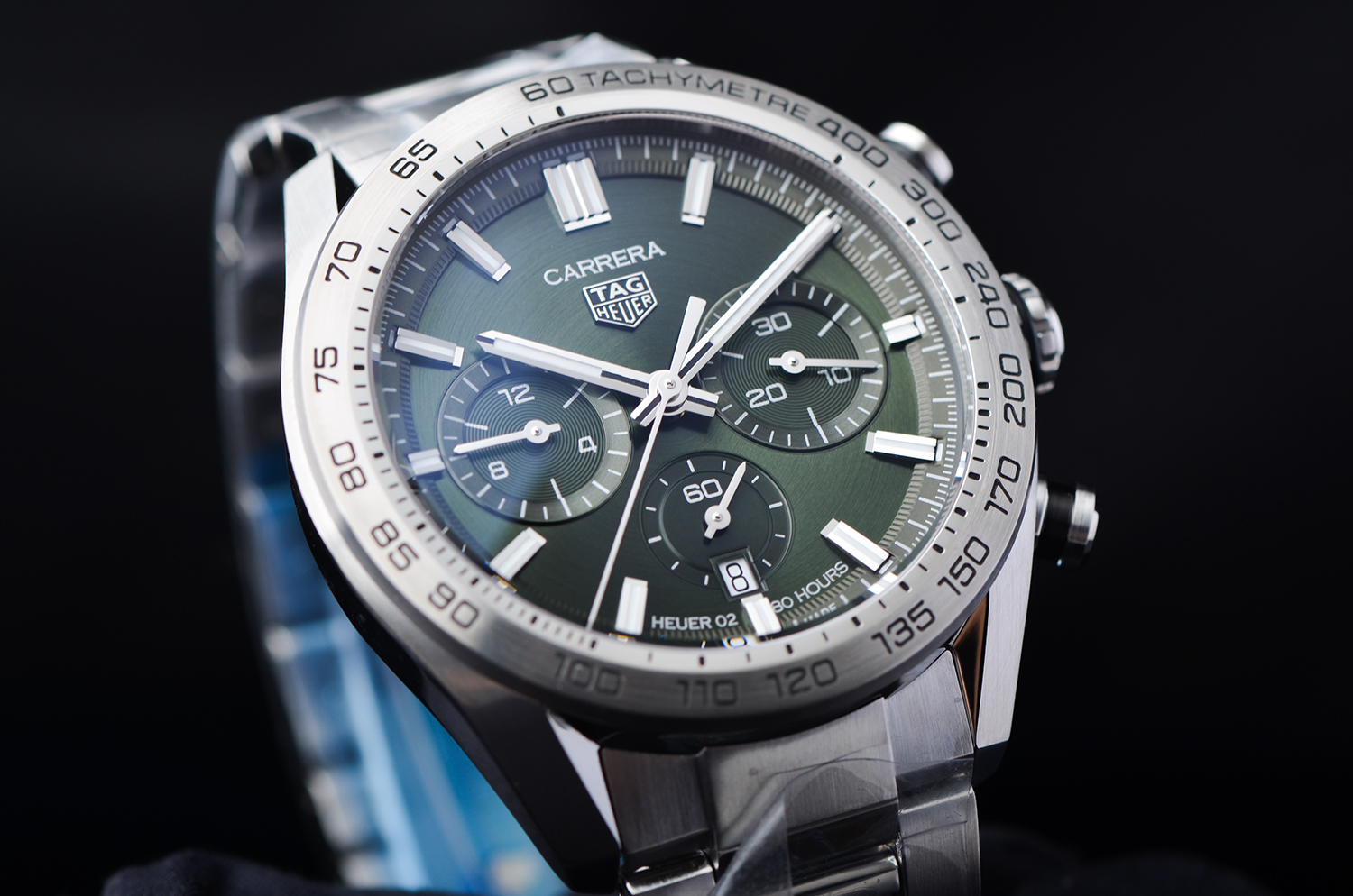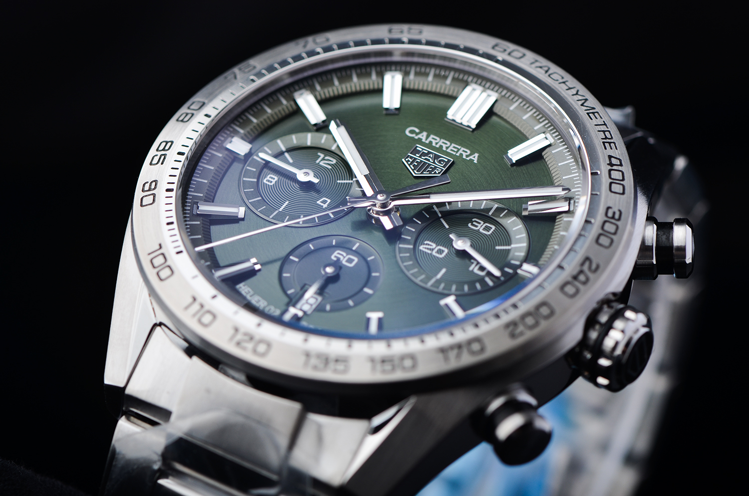 ✨ 绿色拉丝表盘 —— 独特赛车绿于光线下流转变幻,深邃而不张扬。