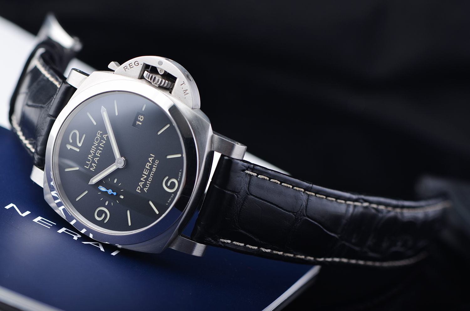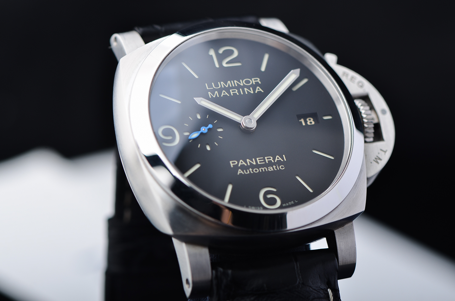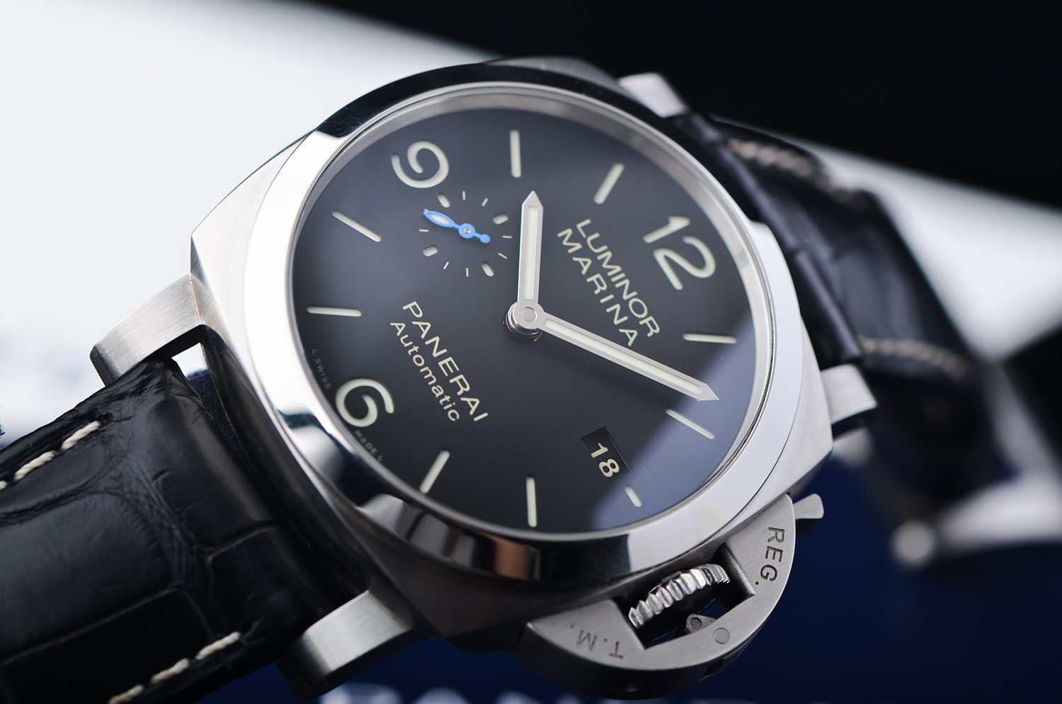 它延续了品牌最具代表性的 Luminor Marina 造型:44 mm 的刚劲表壳、标志性护桥表冠、黑色“sandwich”双层表盘。