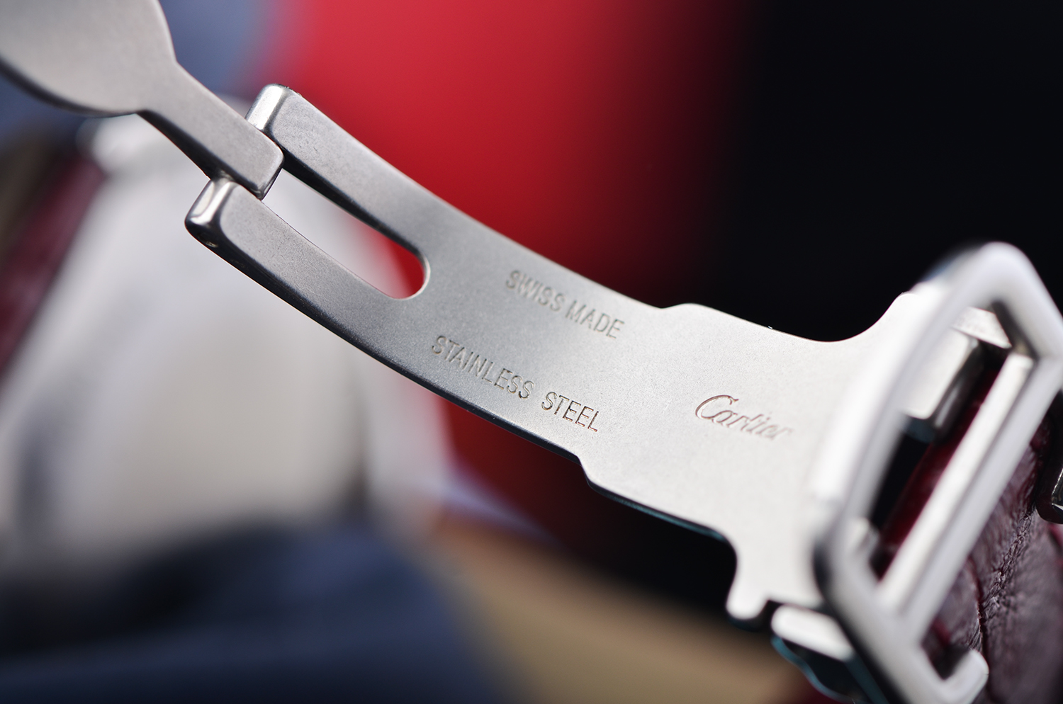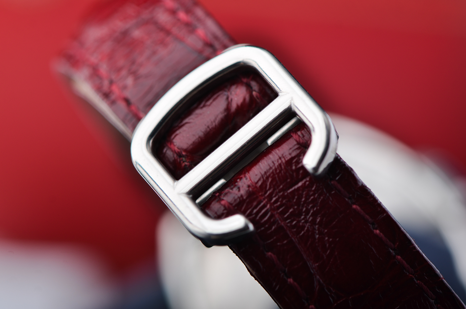 这款腕表的表冠镶嵌着一颗璀璨的蓝宝石,象征着卡地亚对细节的极致追求。搭配红色鳄鱼皮表带,既充满热情与个性,又透出不凡的贵族气质,完美演绎了高贵与现代的结合。